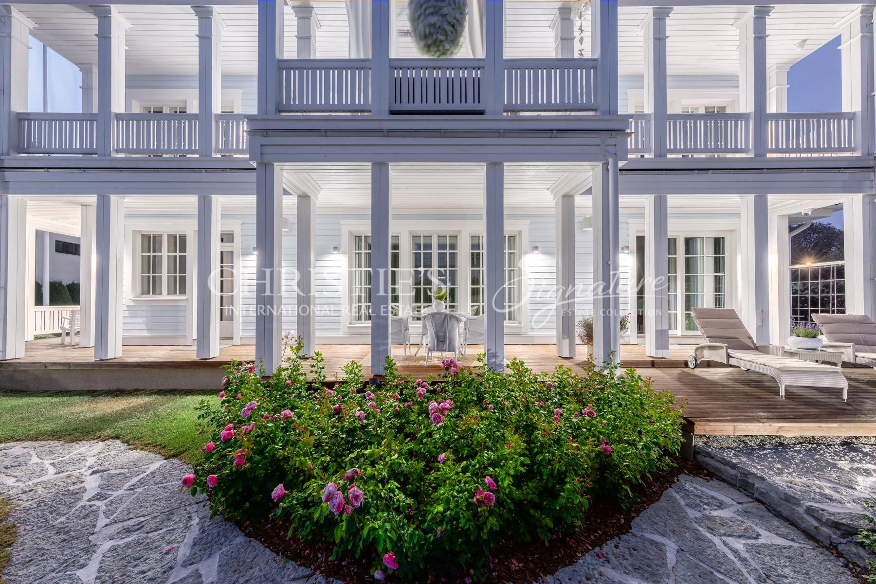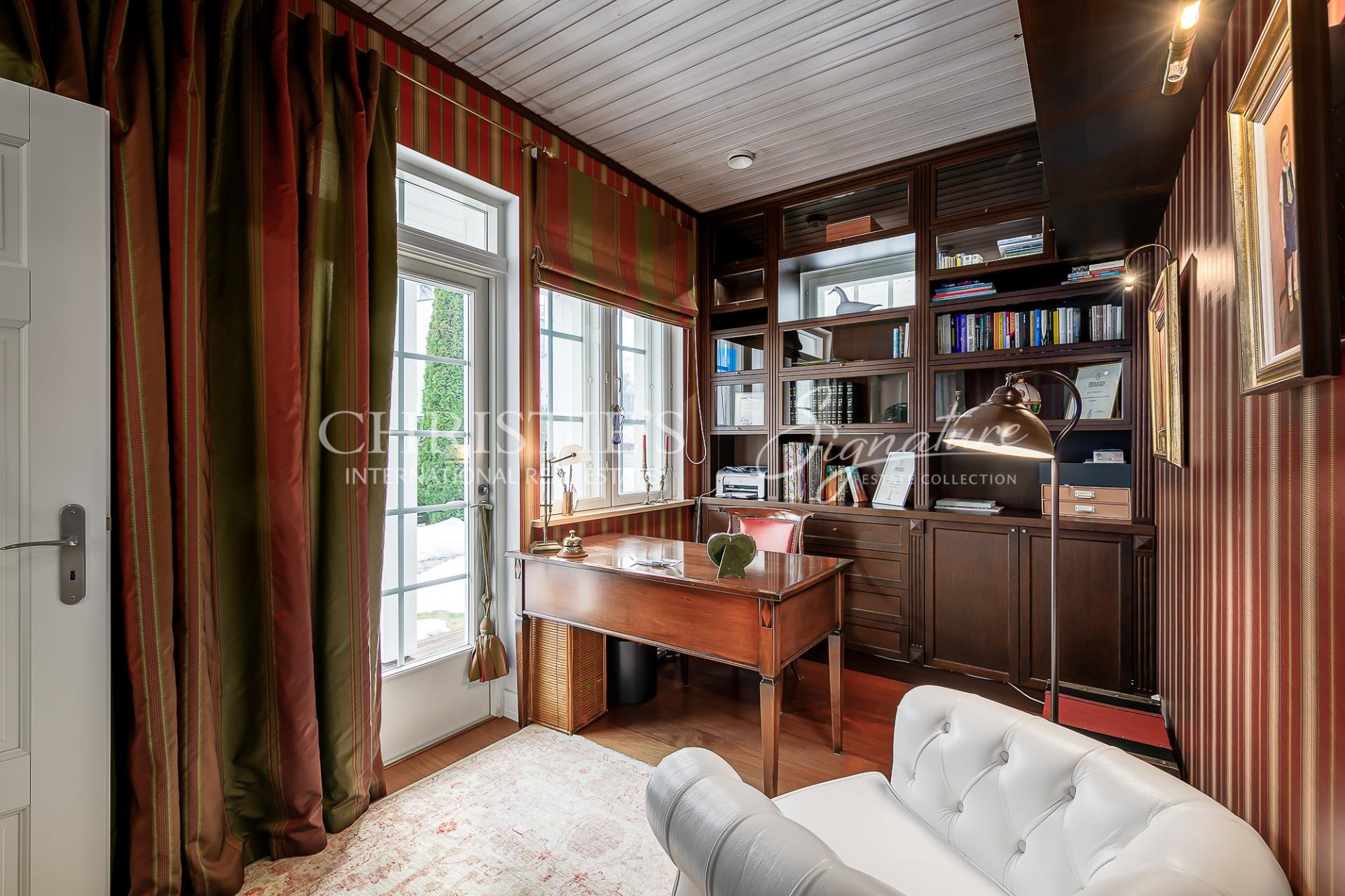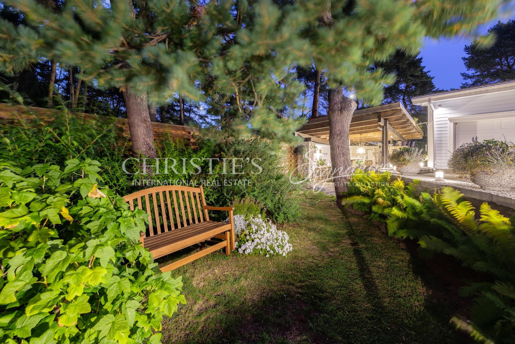 The home is located on a quiet cul-de-sac, with a private access road shared by only a few neighboring properties. The courtyard features stone paving with parking space for several vehicles, in addition to the two-car garage.