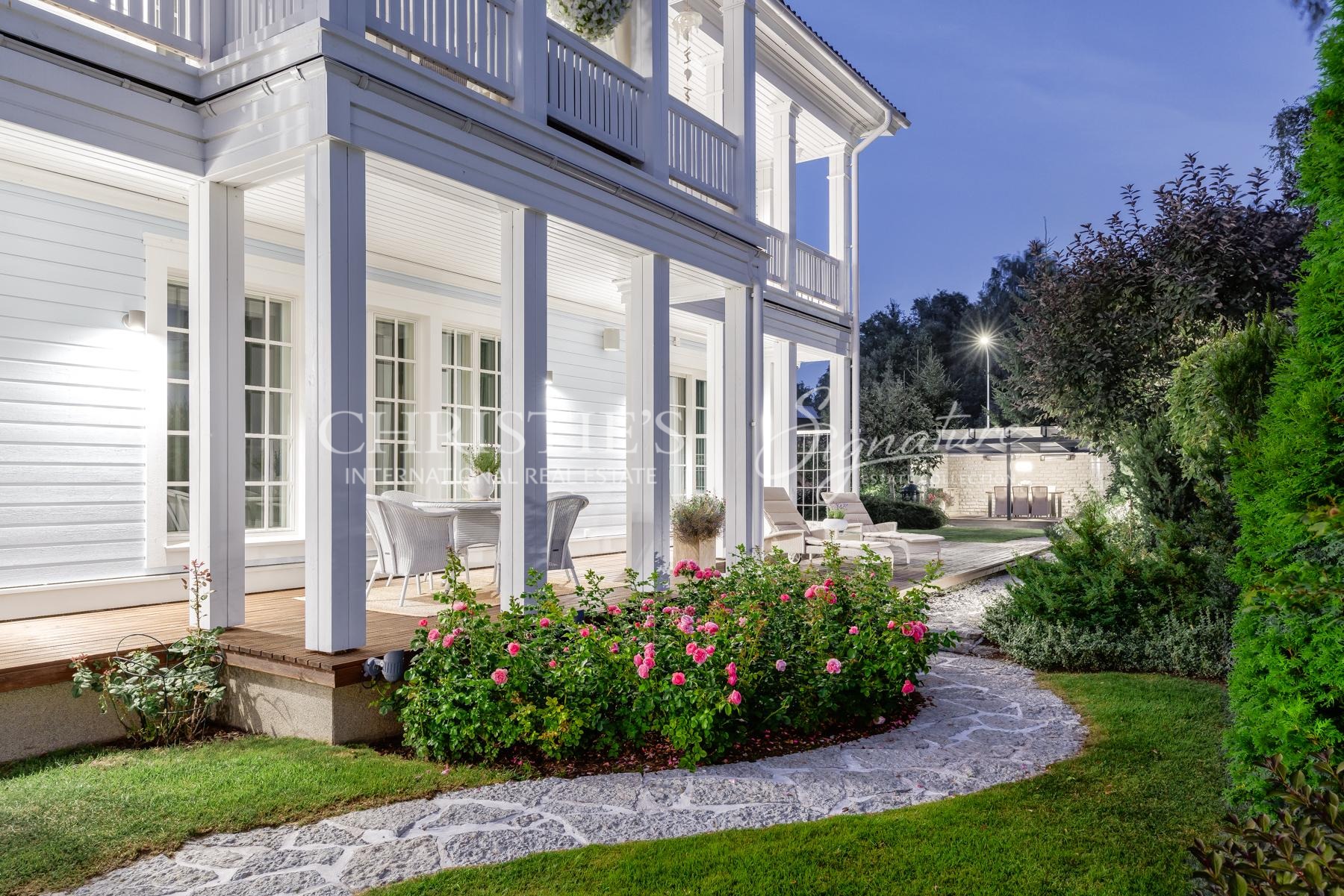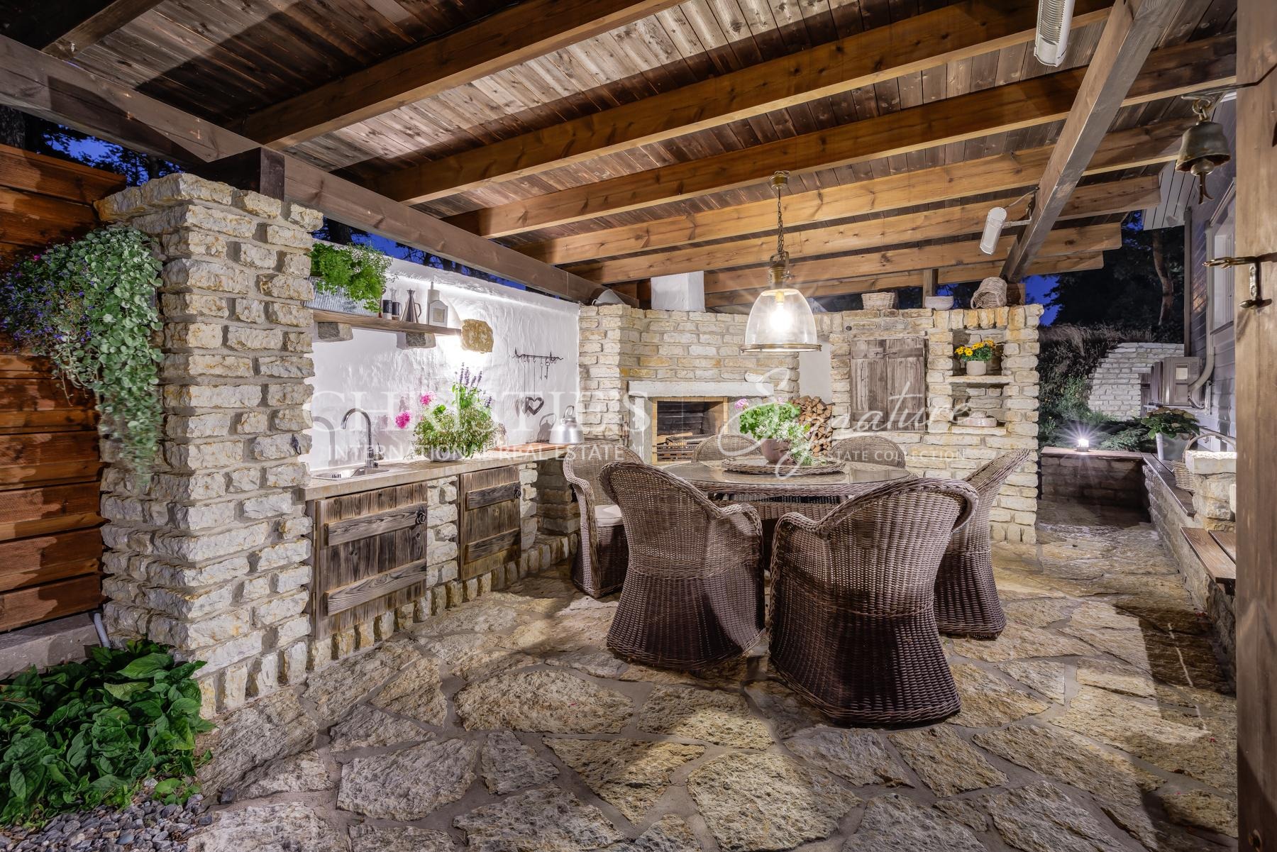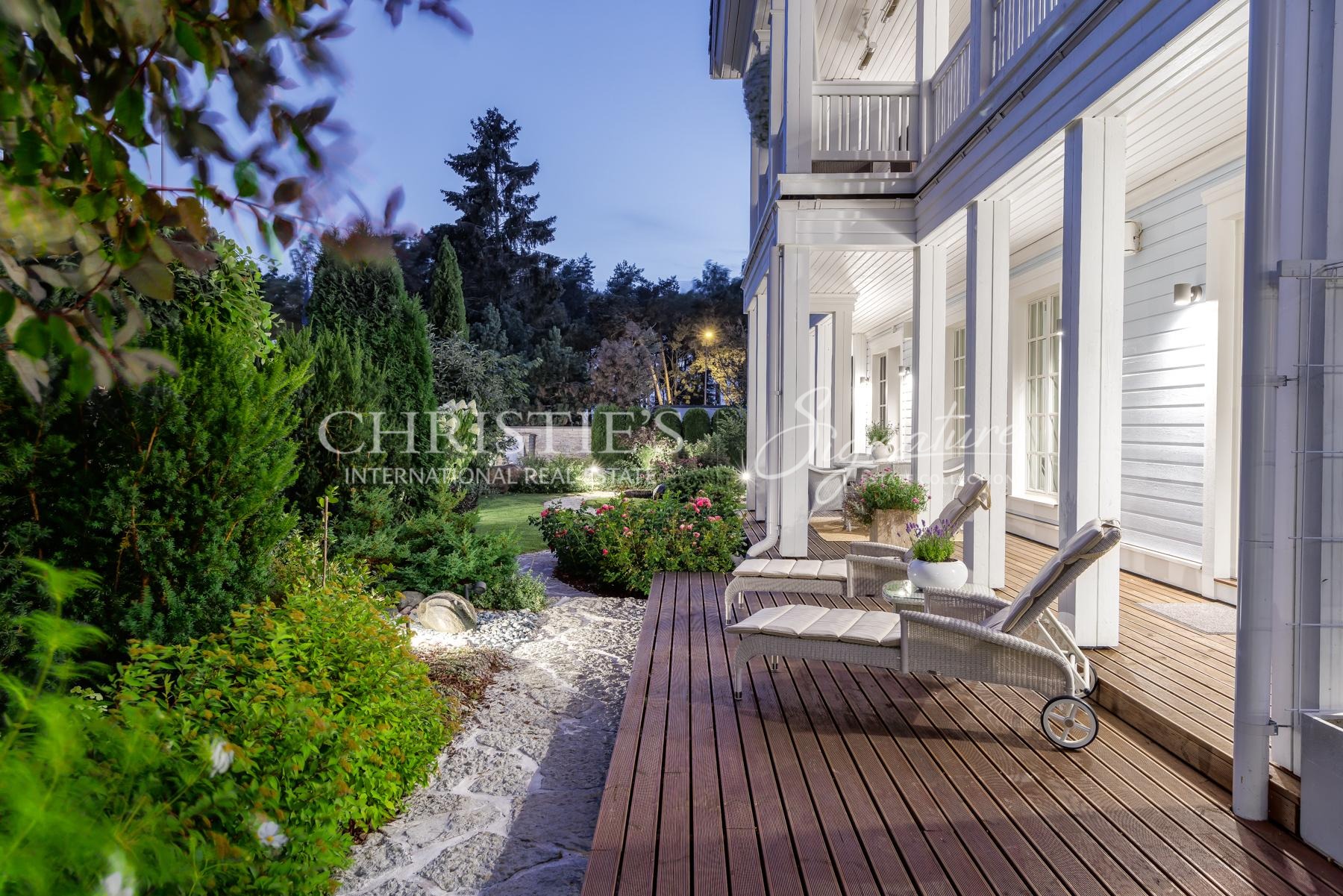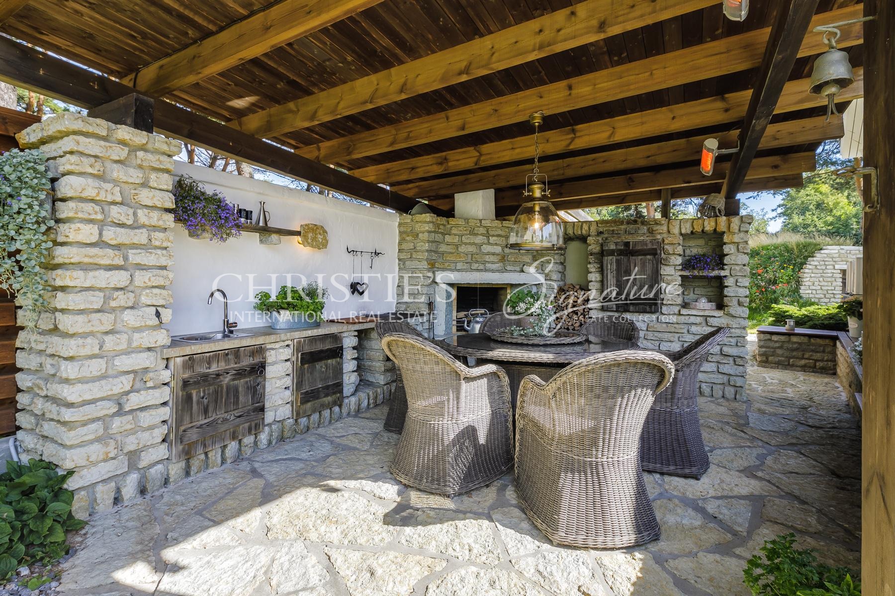 The property consists of a spacious main house with generous balconies and terraces, a separate garage building with space for two cars and a workshop, and several outdoor areas designed for relaxation and leisure. The garden features a summer kitchen with a traditional wood-fired stove and smoke oven, a glass-enclosed outdoor terrace, a greenhouse with an automatic irrigation system, and a wine cellar built into an underground cellar space. The landscaping has been carefully planned and professionally maintained.