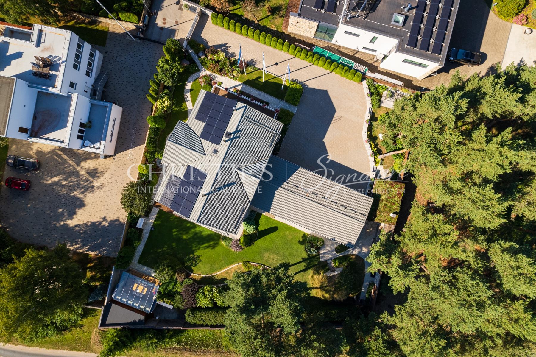 The house is equipped with geothermal heating, solar panels, and water-based underfloor heating throughout. The temperature in each room can be individually adjusted via digital thermostats. The ventilation system includes heat recovery, and cooling is available on the upper floor. The property is connected to the central water and sewer systems.