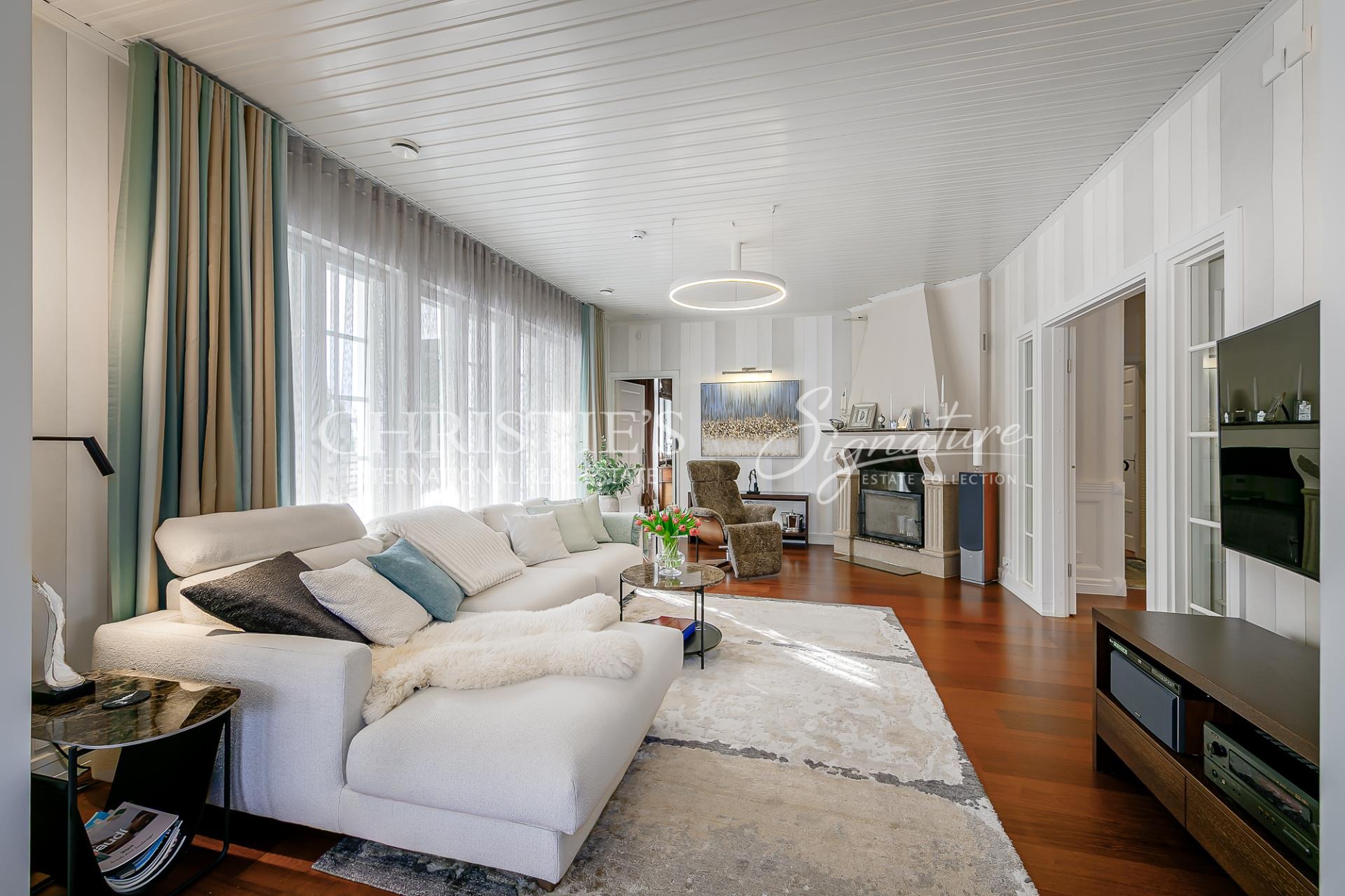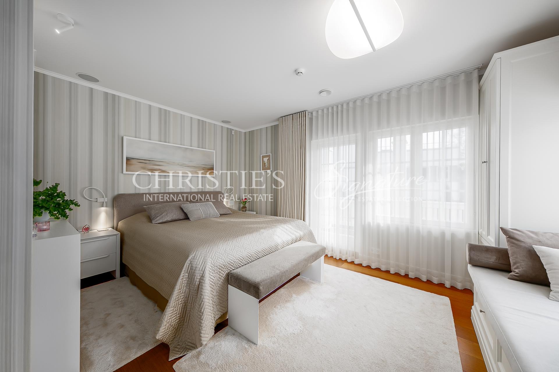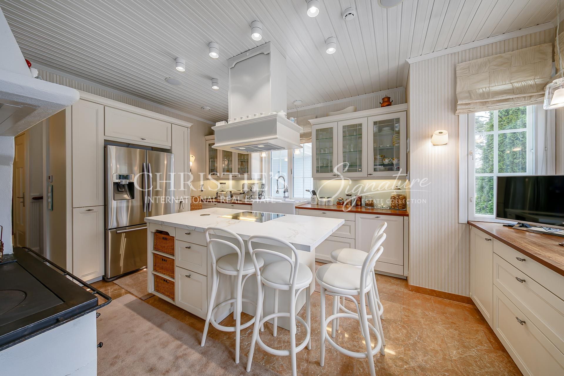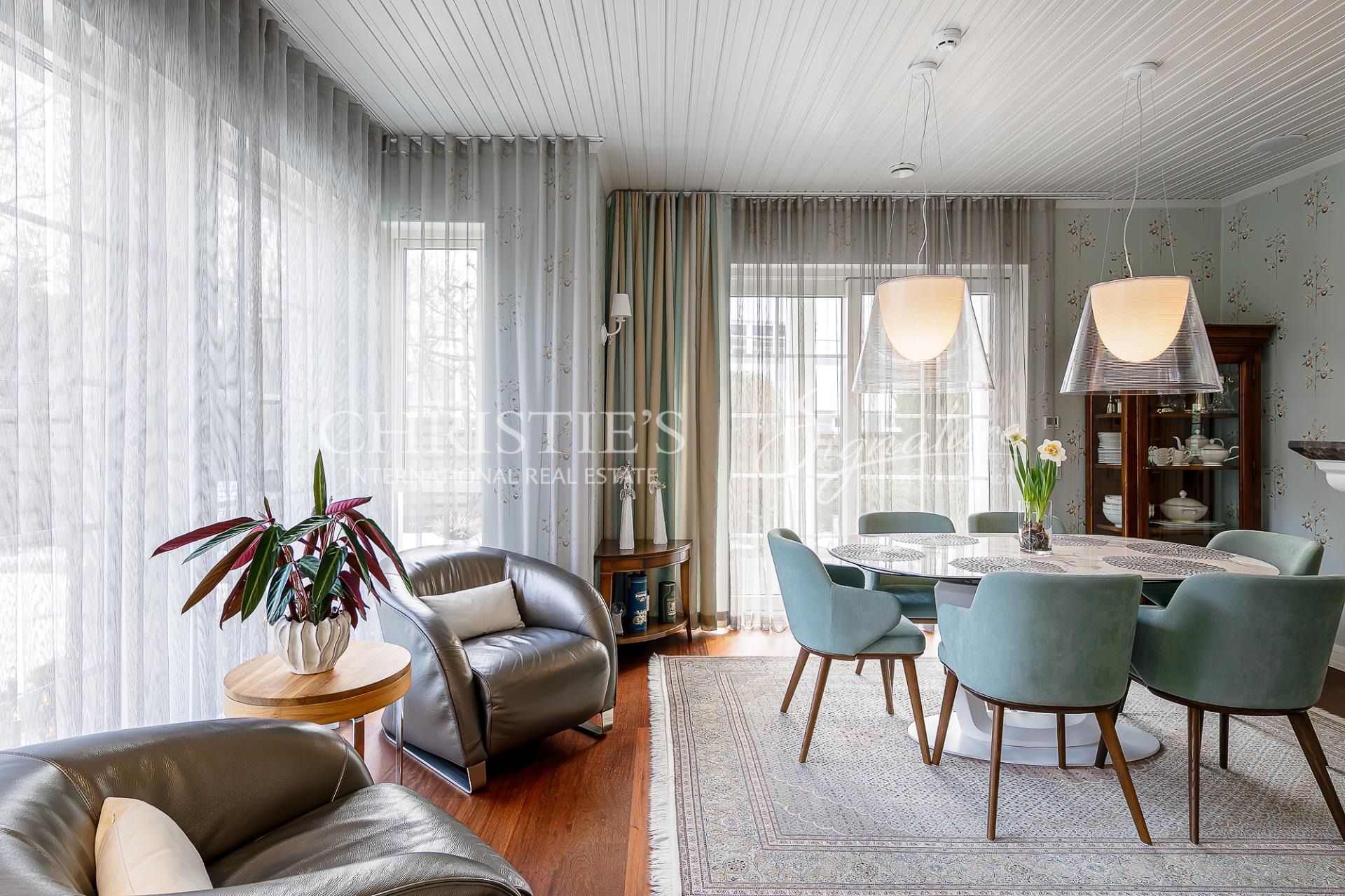 The kitchen is equipped with high-quality cabinetry and premium appliances from renowned manufacturers, including a separate refrigerator and freezer as well as an island workspace with a ventilation hood. The interior design incorporates furniture and lighting from respected international brands, creating a refined and harmonious atmosphere throughout the home.