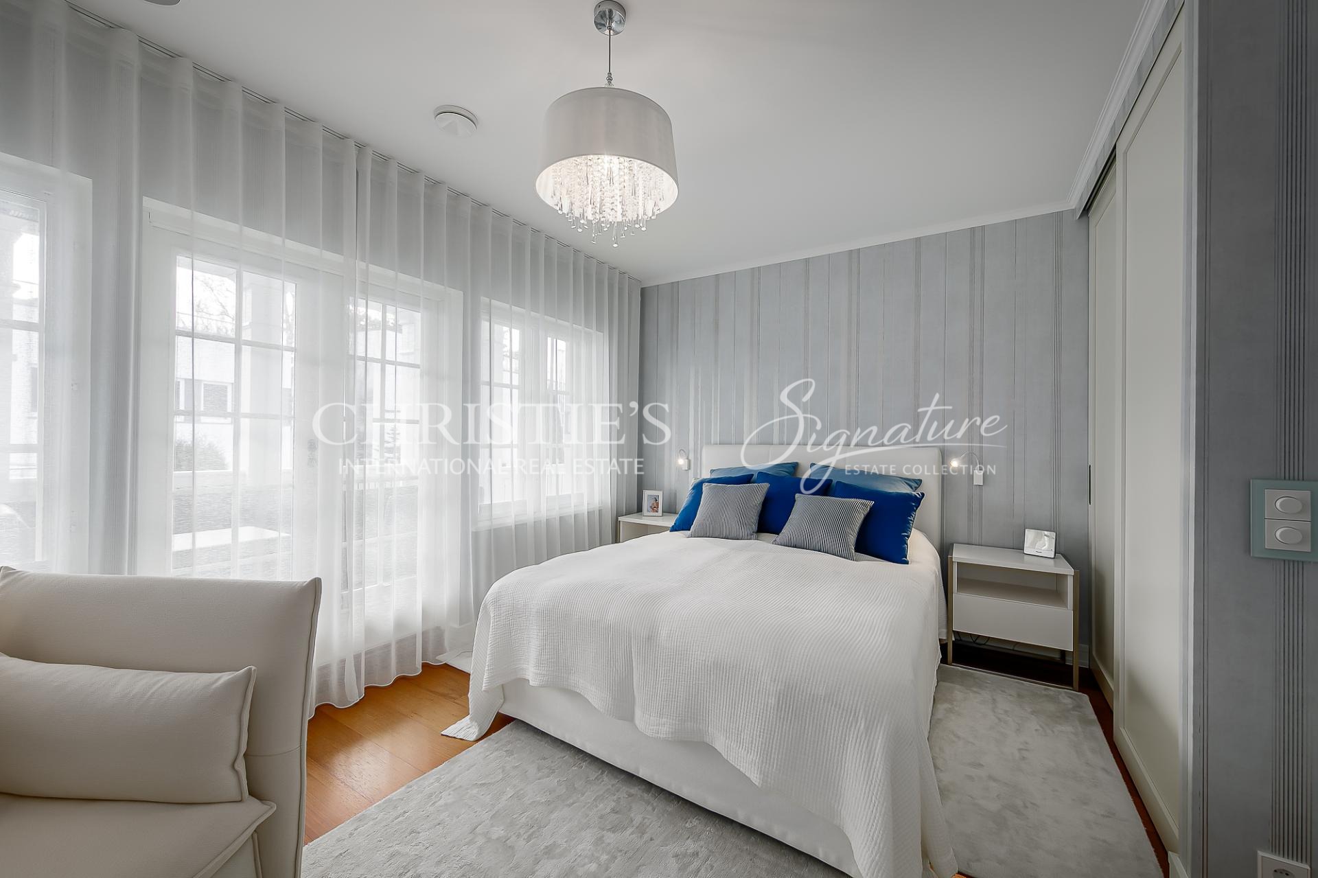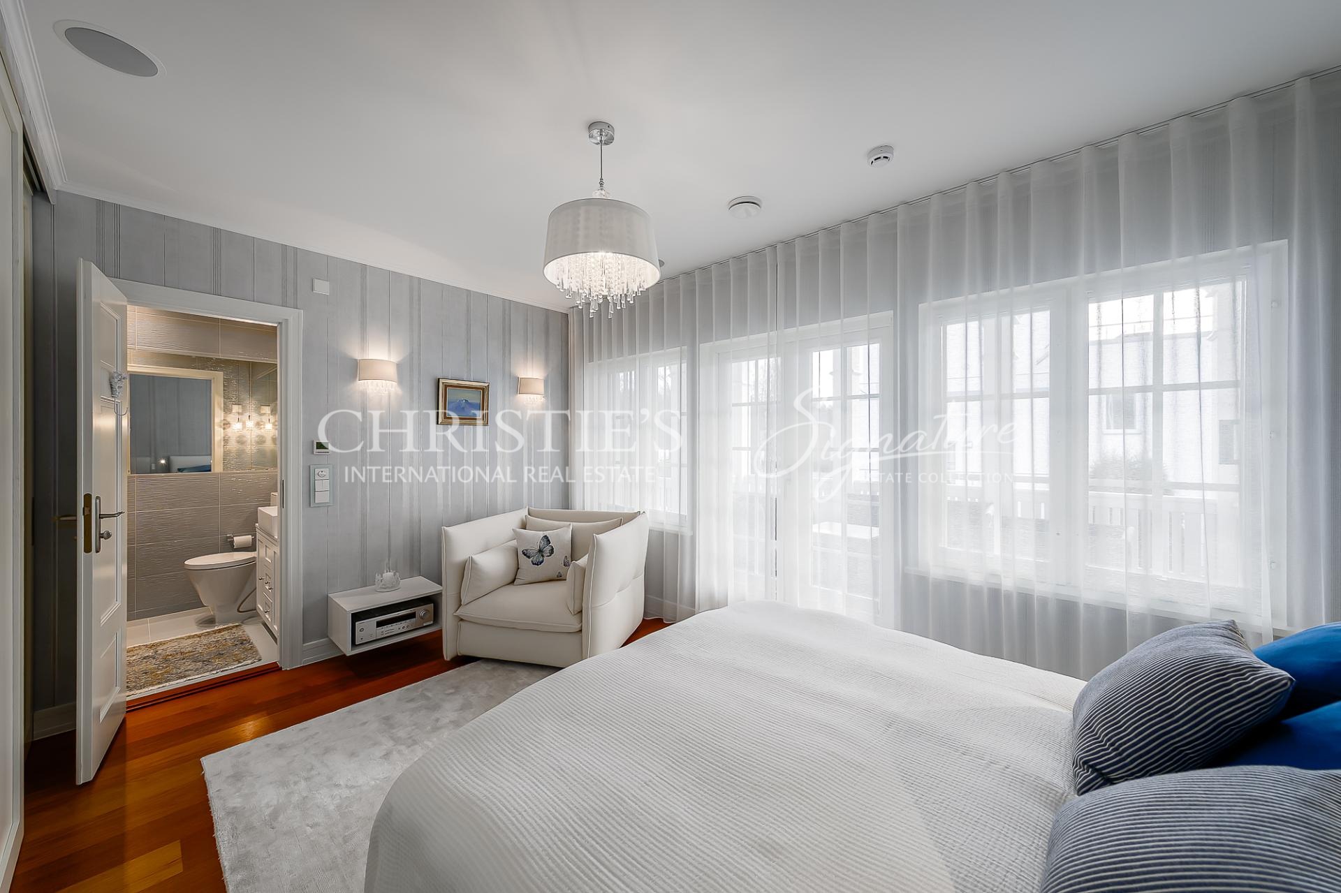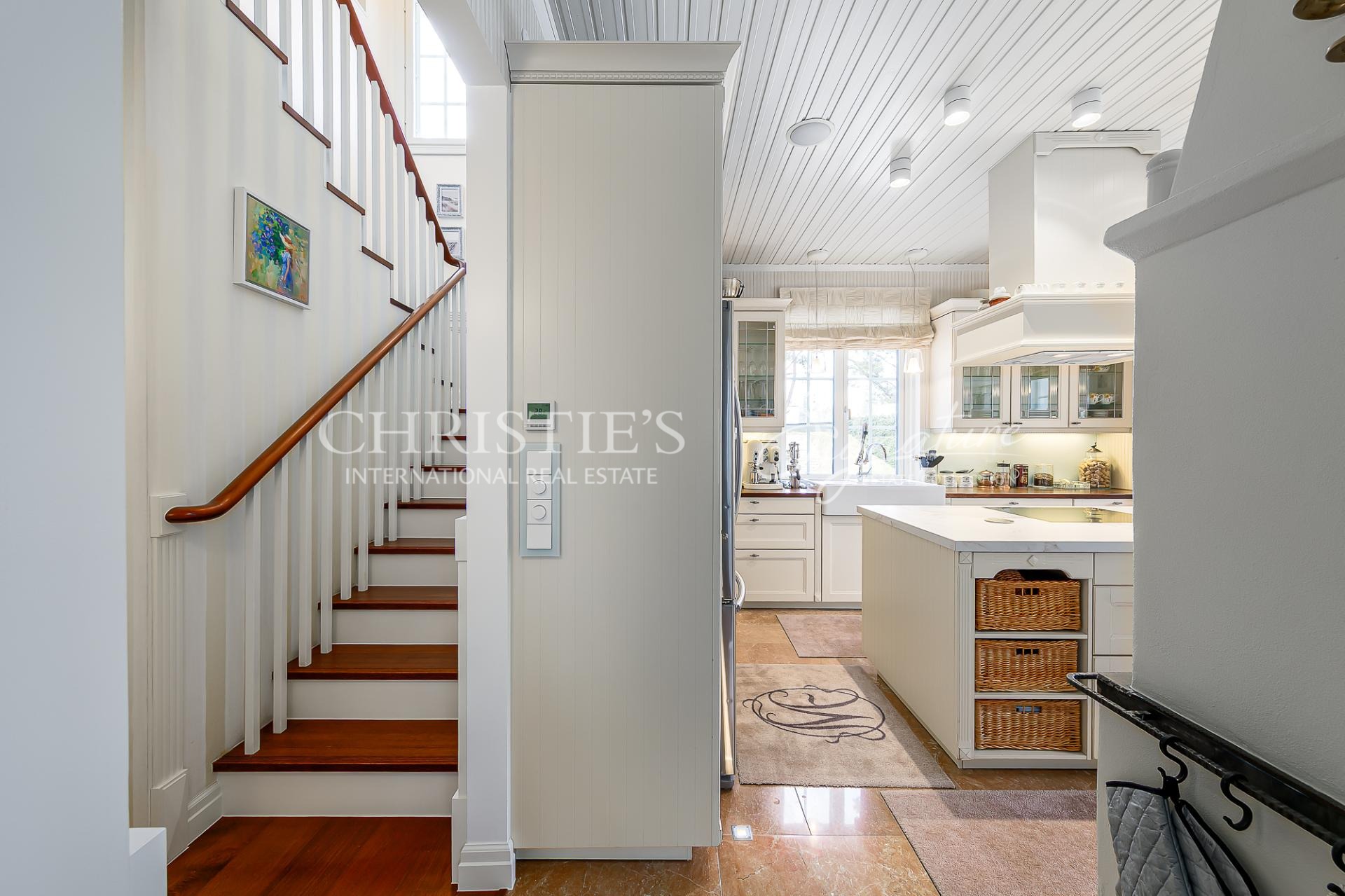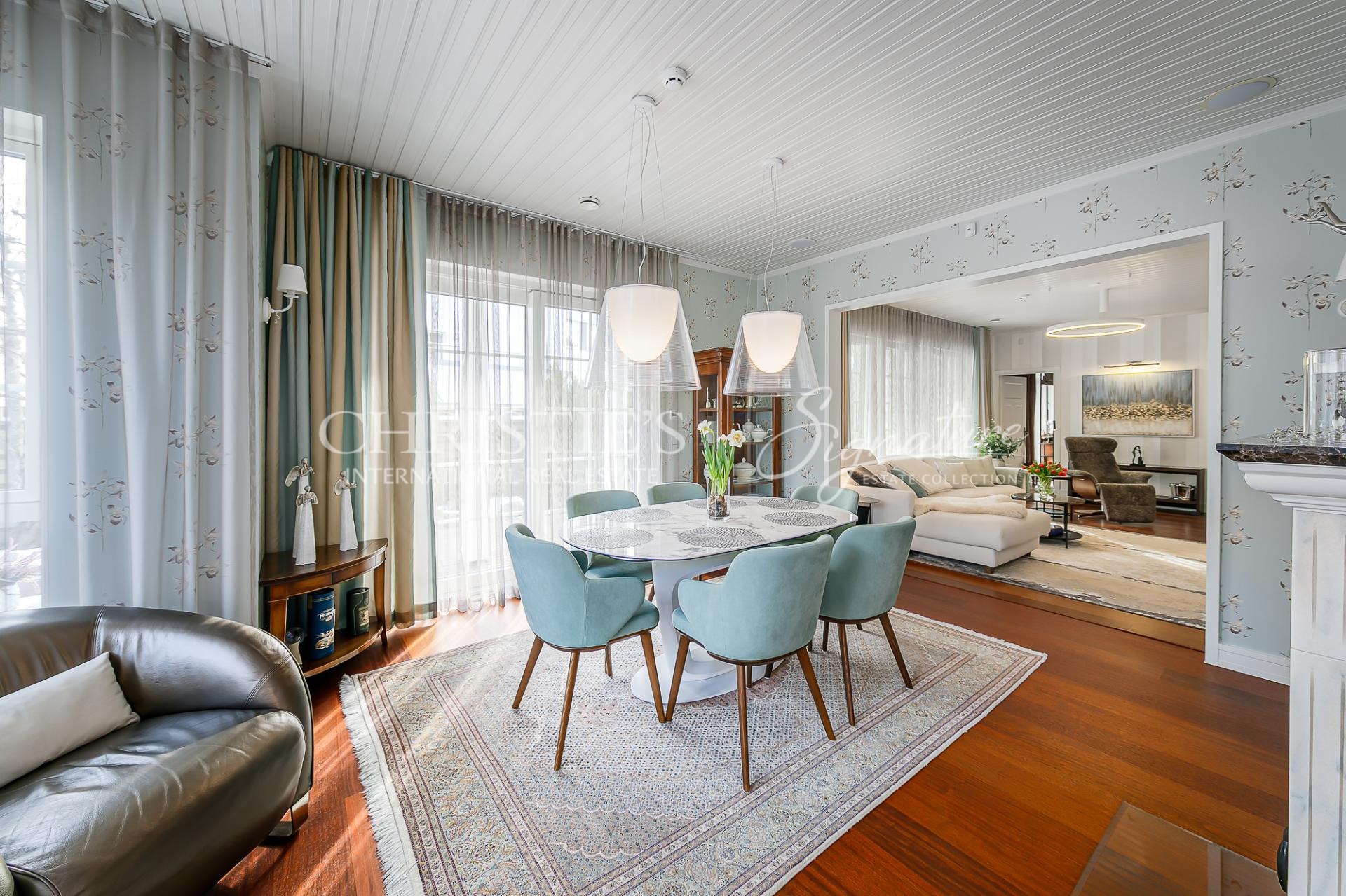 The kitchen is equipped with high-quality cabinetry and premium appliances from renowned manufacturers, including a separate refrigerator and freezer as well as an island workspace with a ventilation hood. The interior design incorporates furniture and lighting from respected international brands, creating a refined and harmonious atmosphere throughout the home.