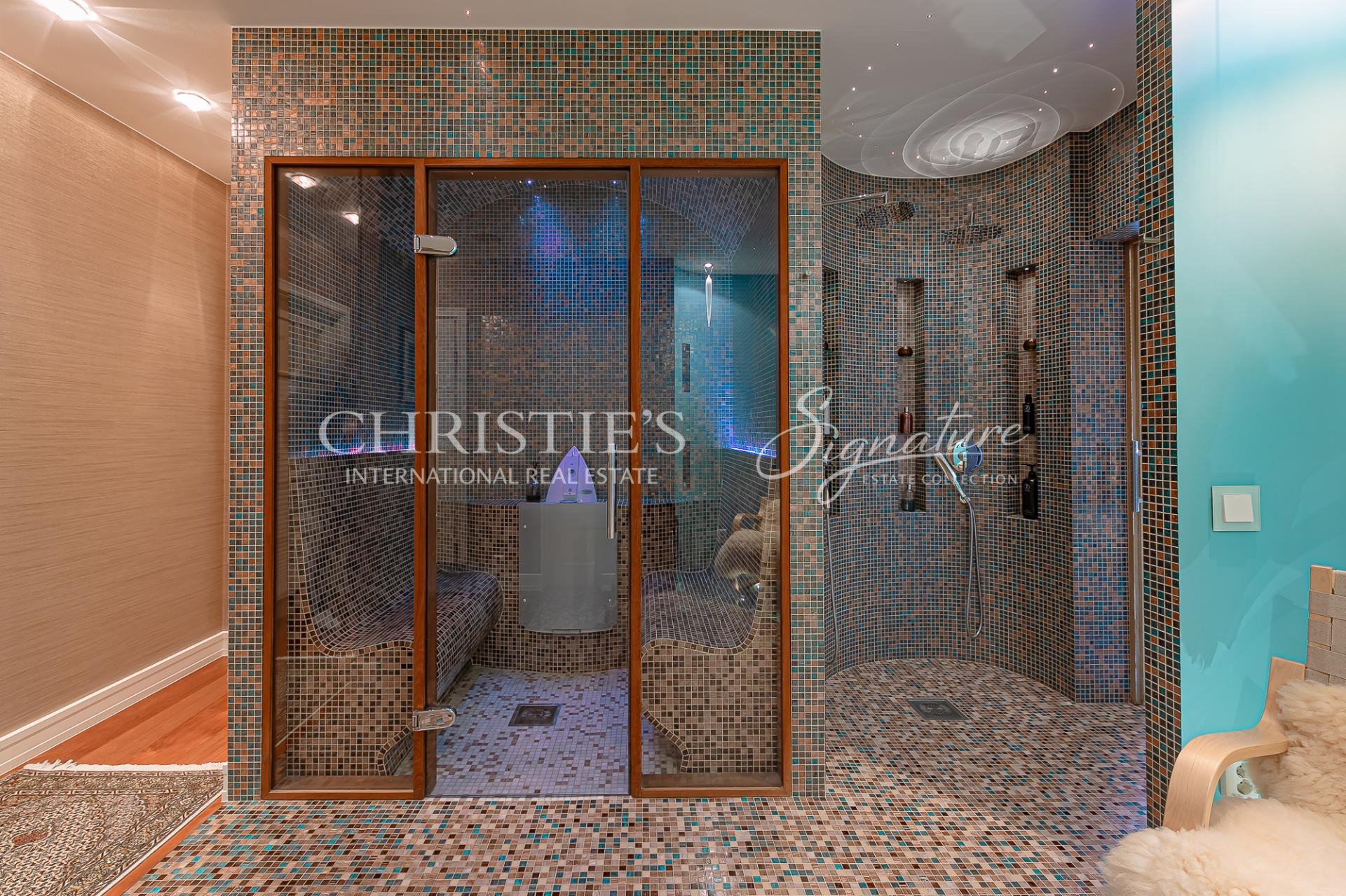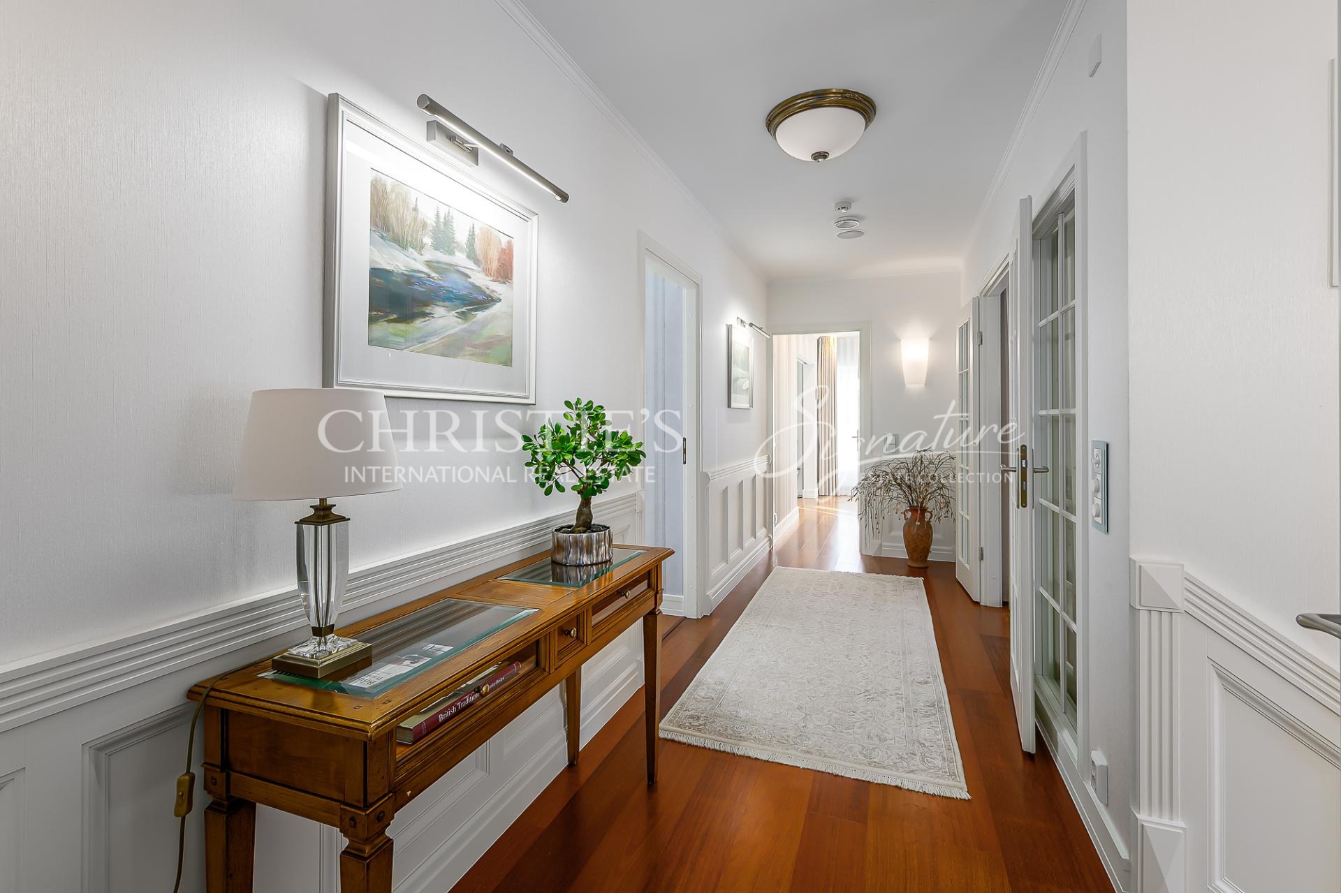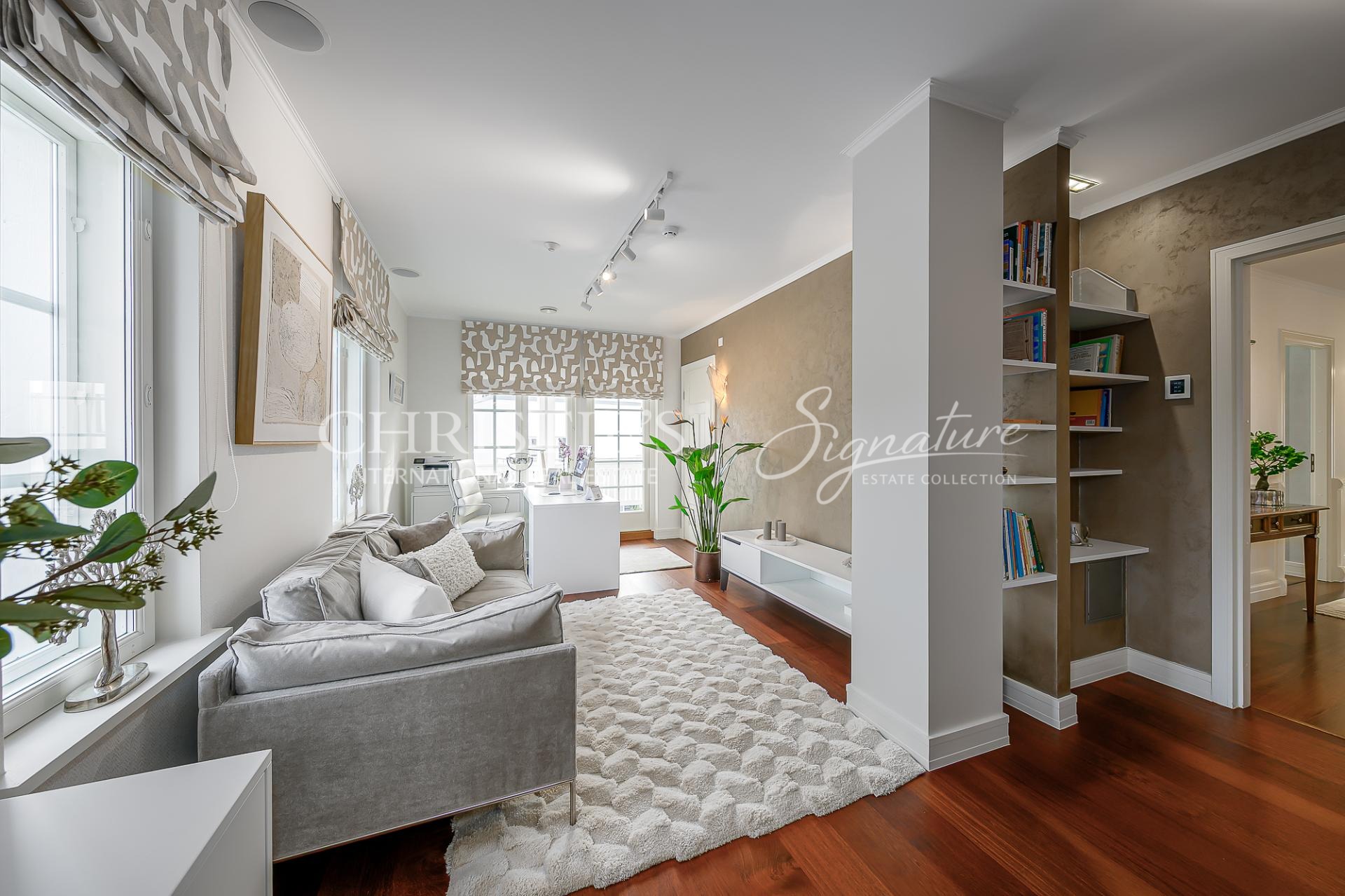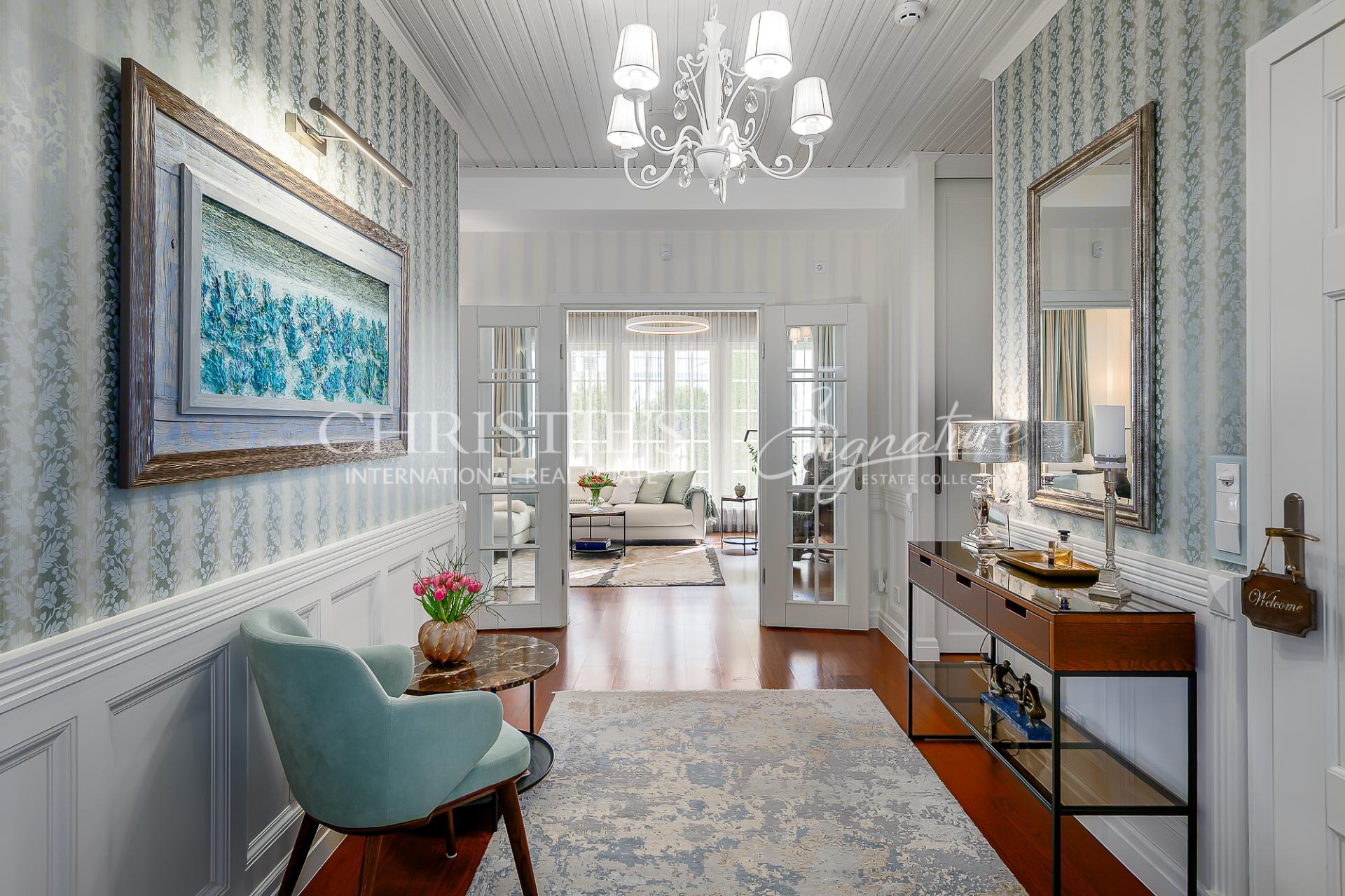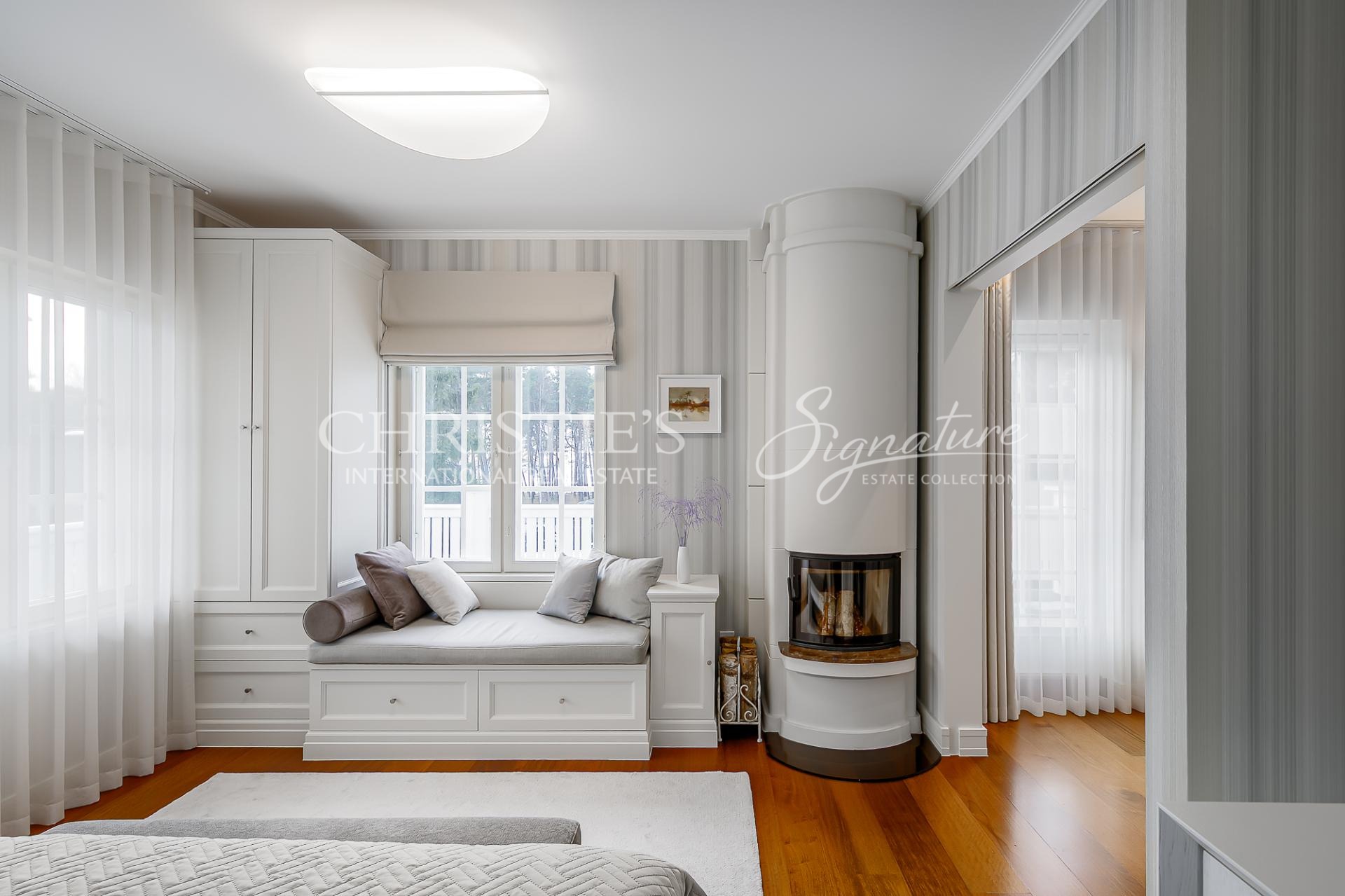 The kitchen is equipped with high-quality cabinetry and premium appliances from renowned manufacturers, including a separate refrigerator and freezer as well as an island workspace with a ventilation hood. The interior design incorporates furniture and lighting from respected international brands, creating a refined and harmonious atmosphere throughout the home.