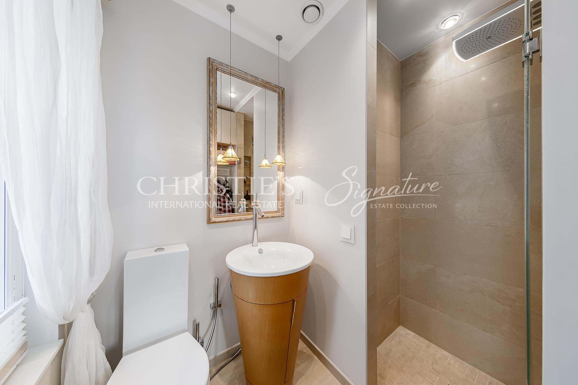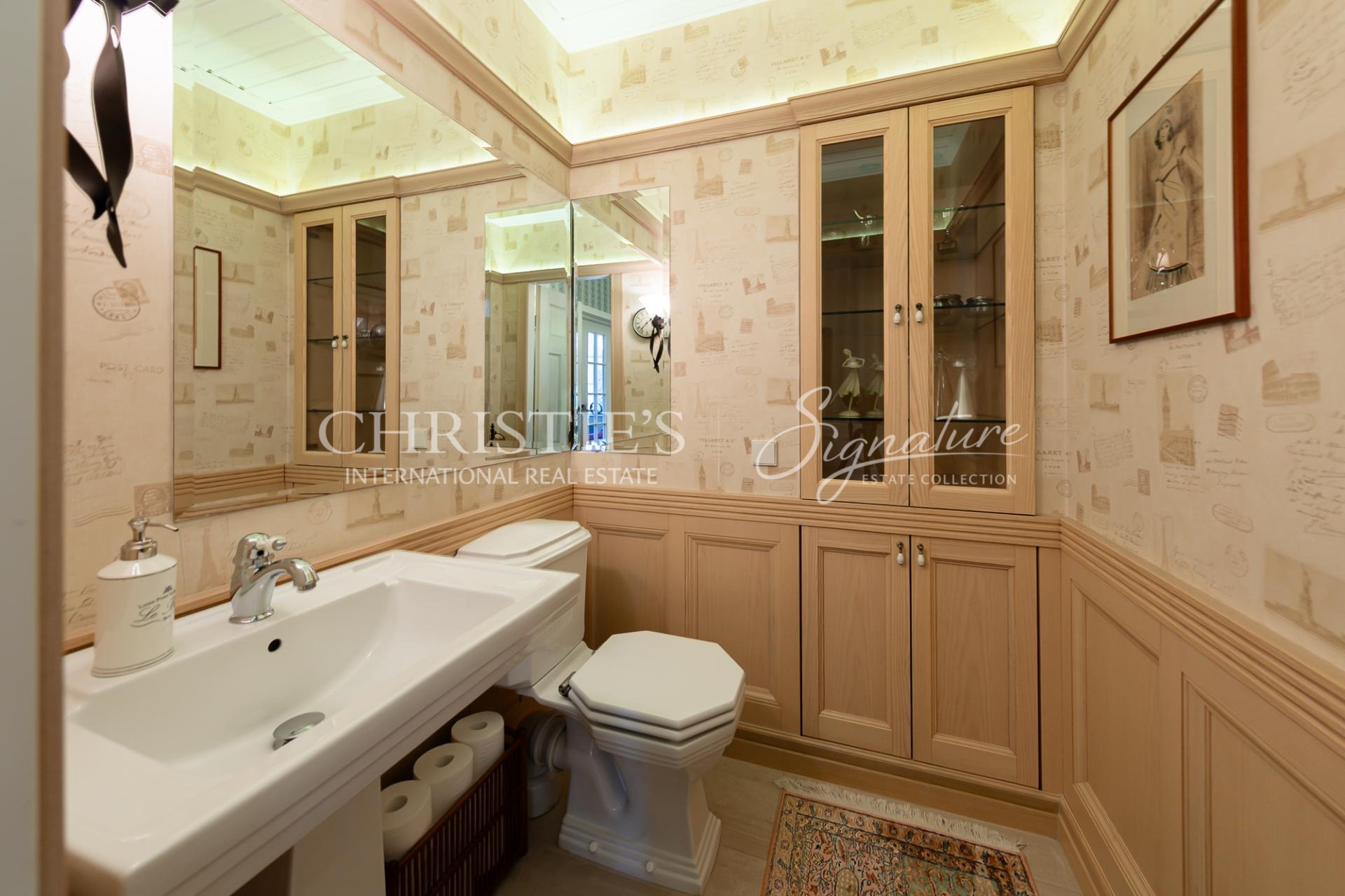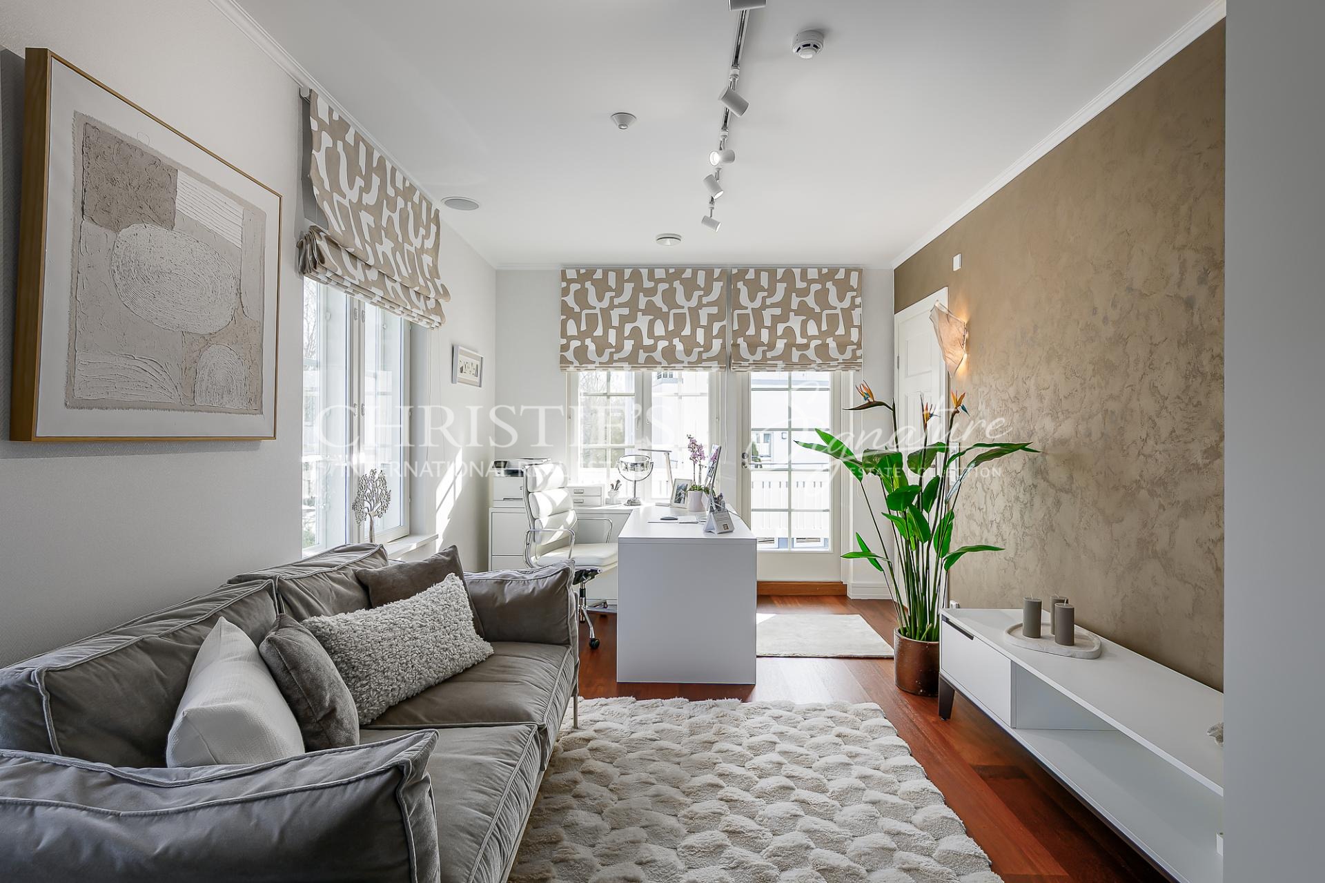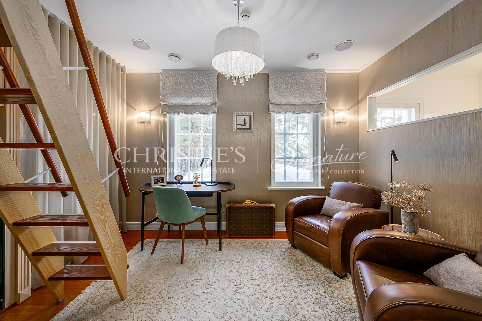 The kitchen is equipped with high-quality cabinetry and premium appliances from renowned manufacturers, including a separate refrigerator and freezer as well as an island workspace with a ventilation hood. The interior design incorporates furniture and lighting from respected international brands, creating a refined and harmonious atmosphere throughout the home.