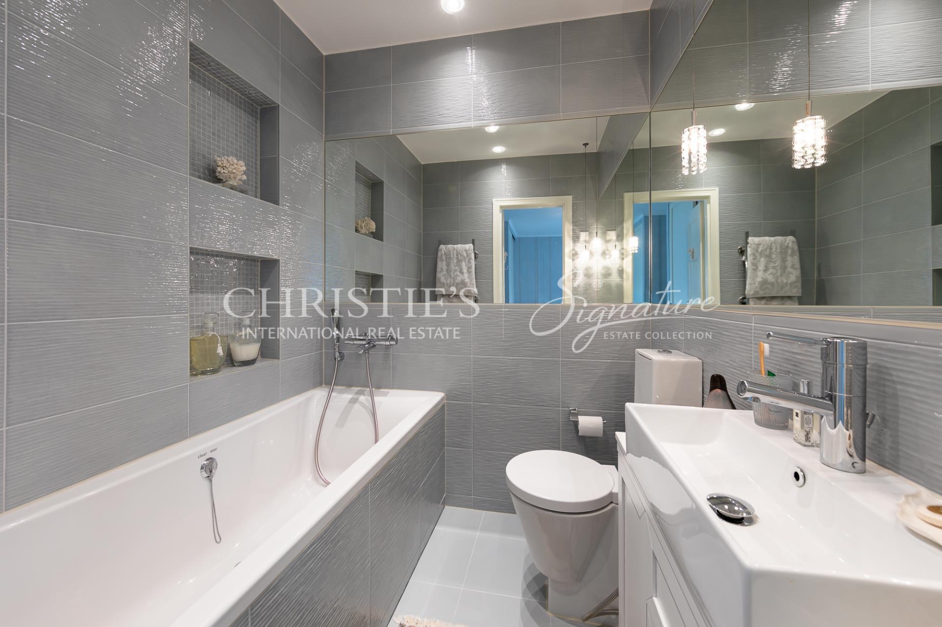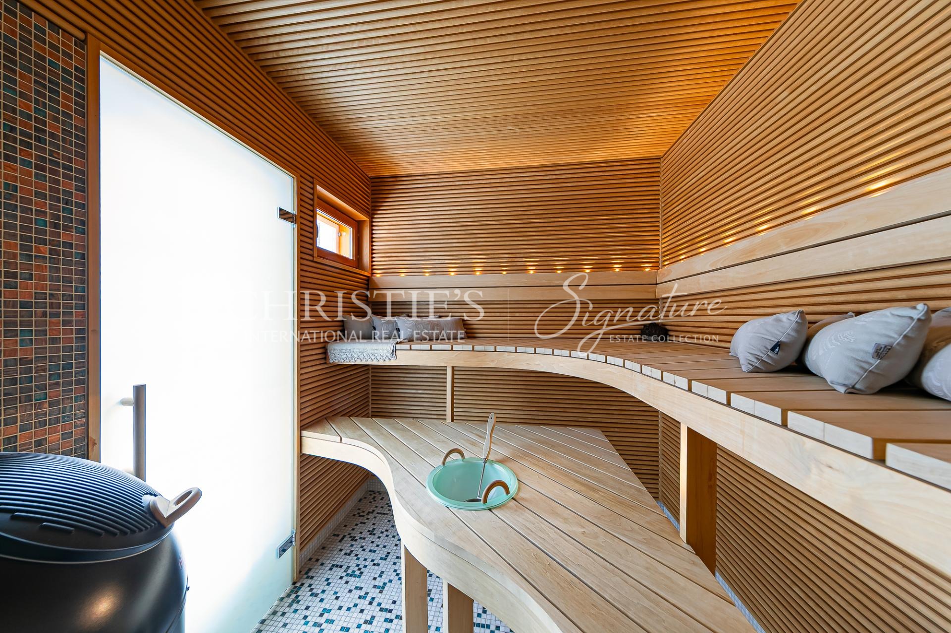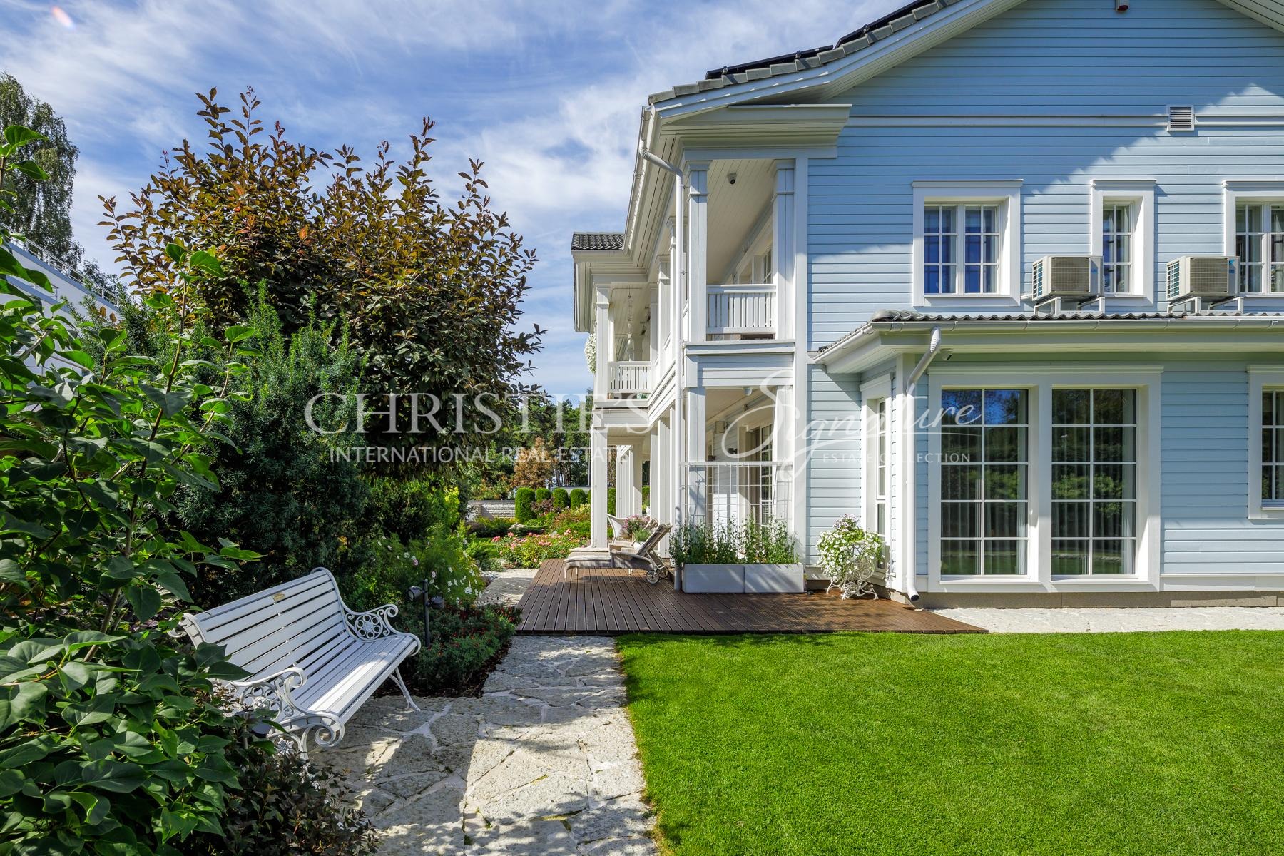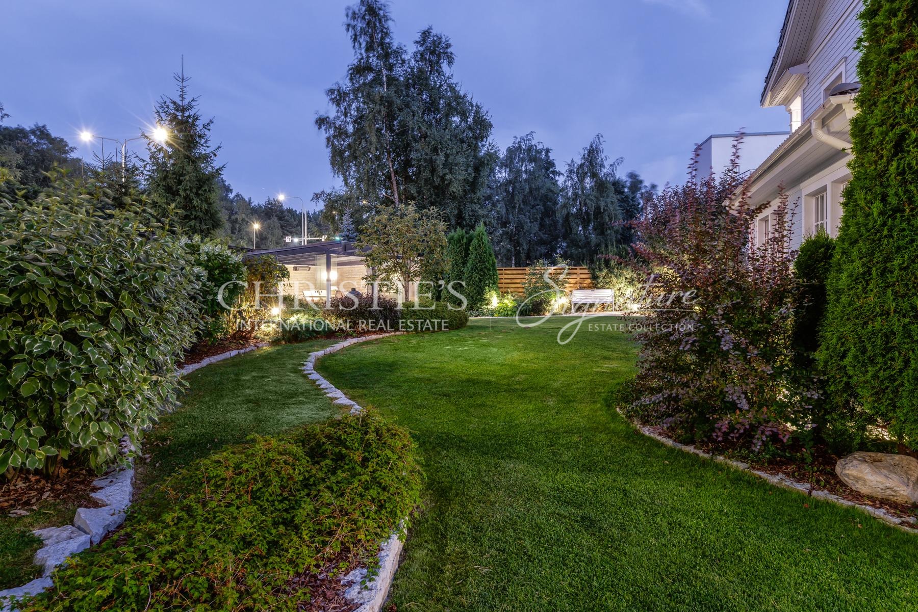 The kitchen is equipped with high-quality cabinetry and premium appliances from renowned manufacturers, including a separate refrigerator and freezer as well as an island workspace with a ventilation hood. The interior design incorporates furniture and lighting from respected international brands, creating a refined and harmonious atmosphere throughout the home.