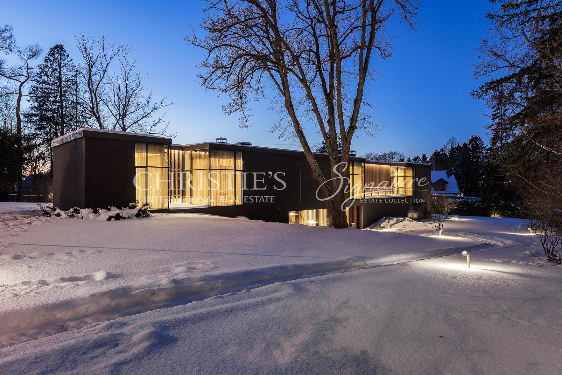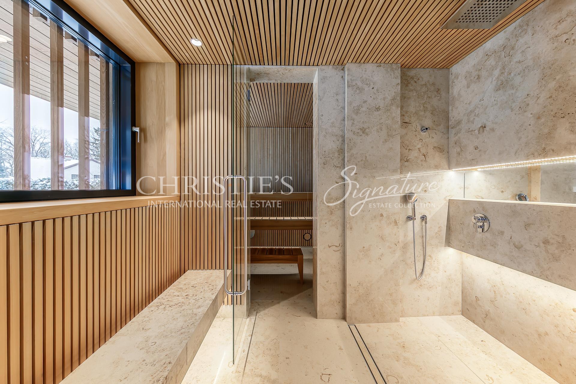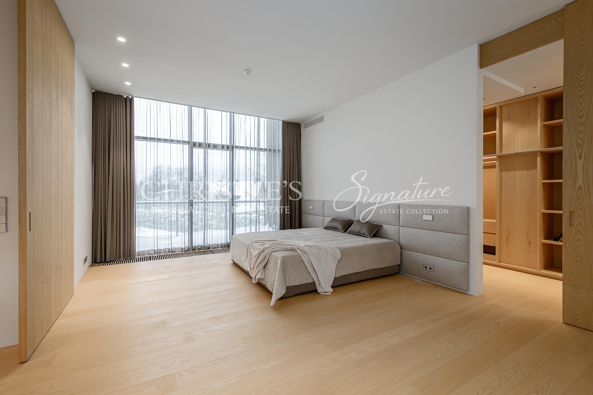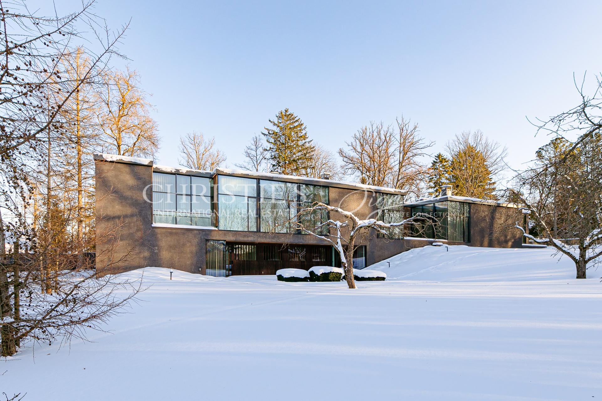 The villa is constructed of monolithic concrete and equipped with modern, energy-efficient technical systems, including a ground-source heat pump, water-based underfloor heating, and heat-recovery ventilation. Triple-glazed aluminium-framed windows, integrated glass façades, and a distinctive exterior finish emphasise the architectural clarity and timeless character of the building. The garage is also treated as an integral part of the architecture and benefits from natural daylight.