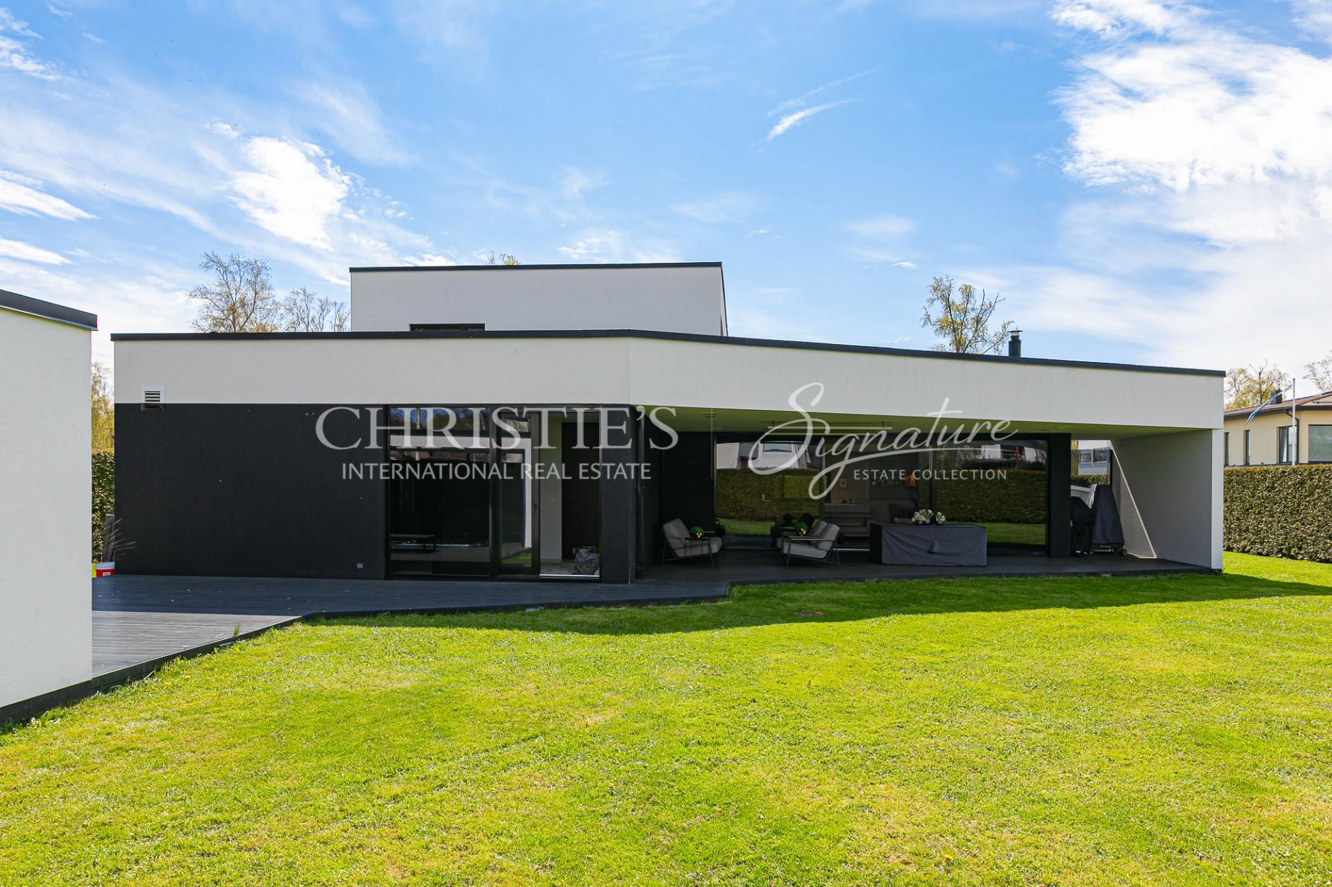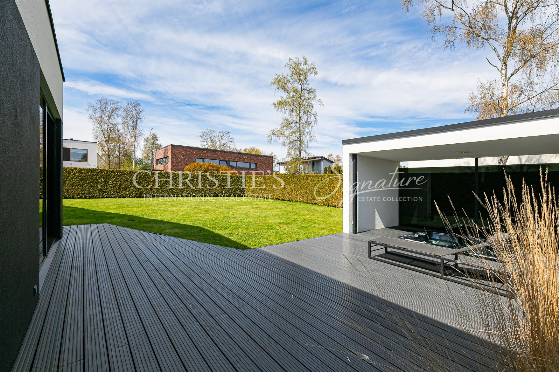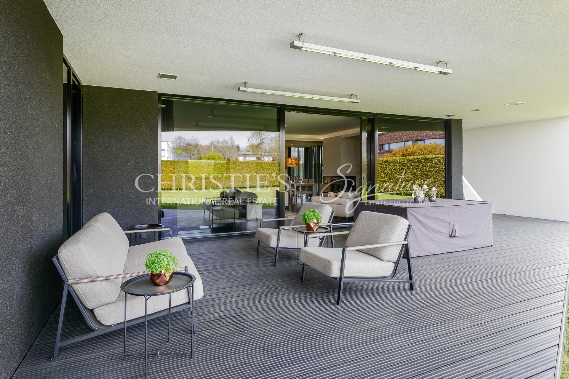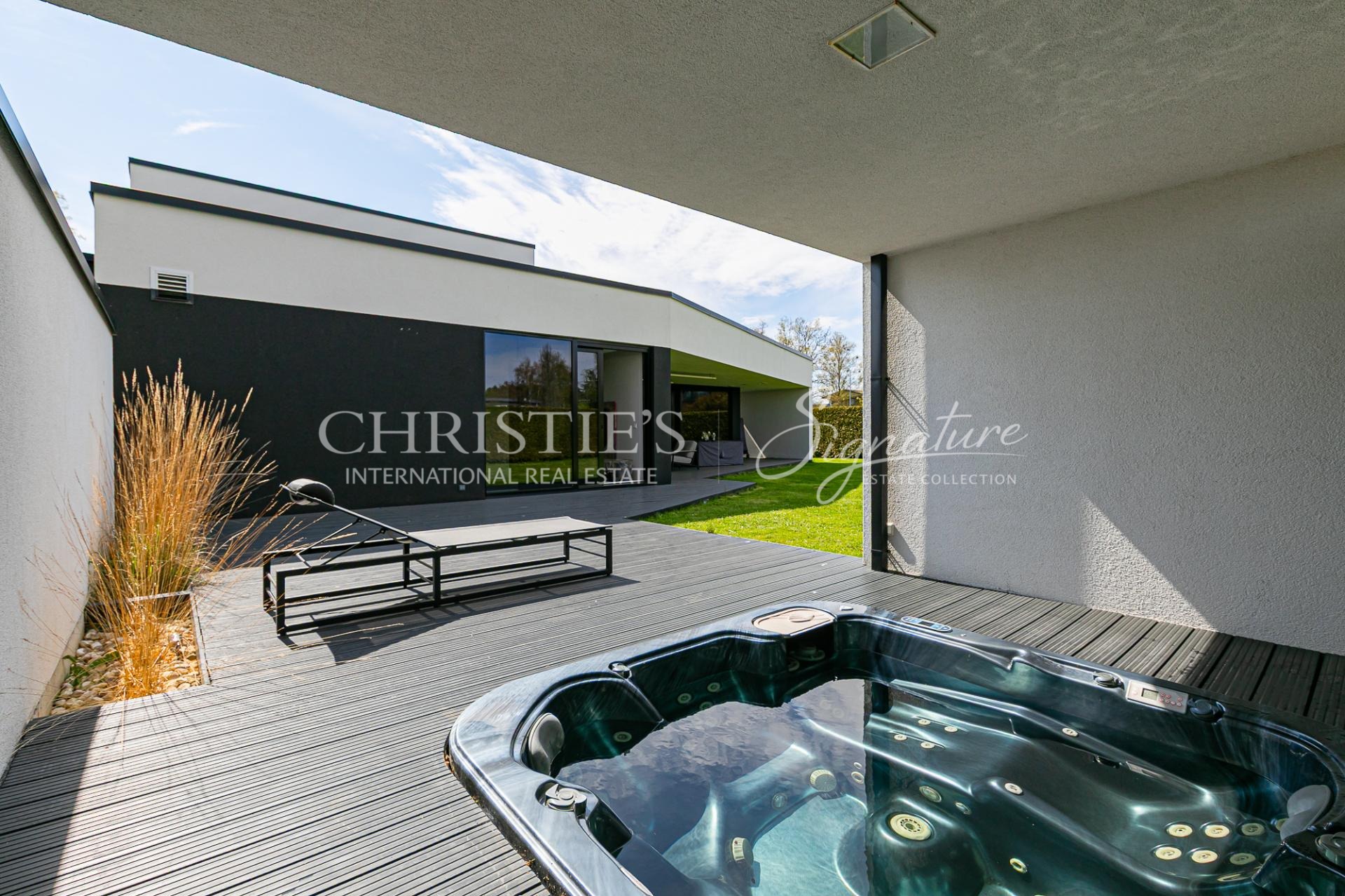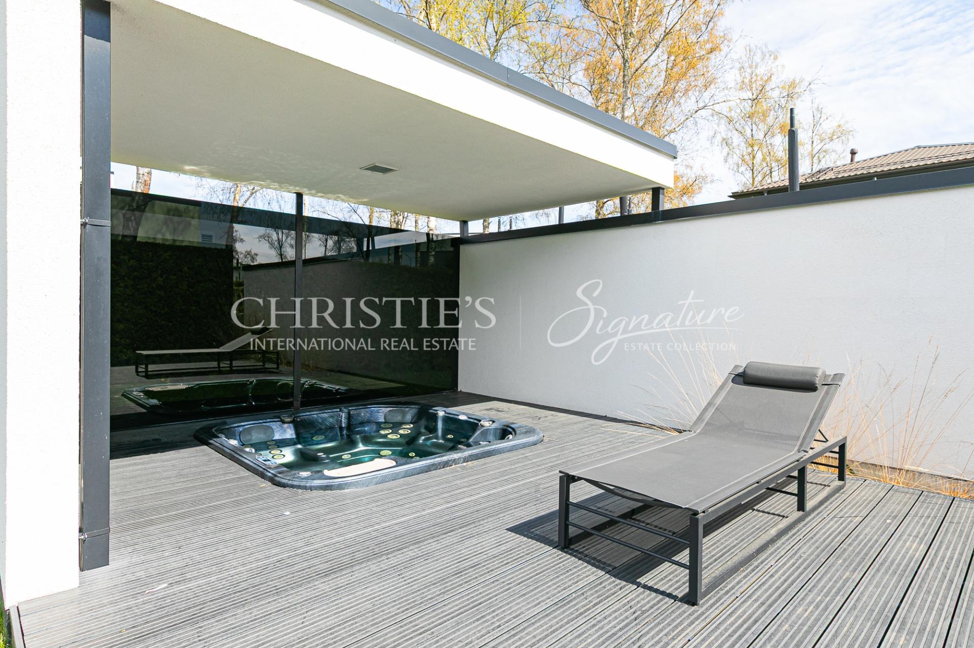 This funk-style villa has a very large living and dining room/kitchen with a fireplace, a sauna complex with a sitting area, which is enhanced by a jacuzzi on the outdoor terrace. On the first floor there is also a practical study, which can easily be used as an additional bedroom. A utility room and a garage, which is currently used as a hobby room.