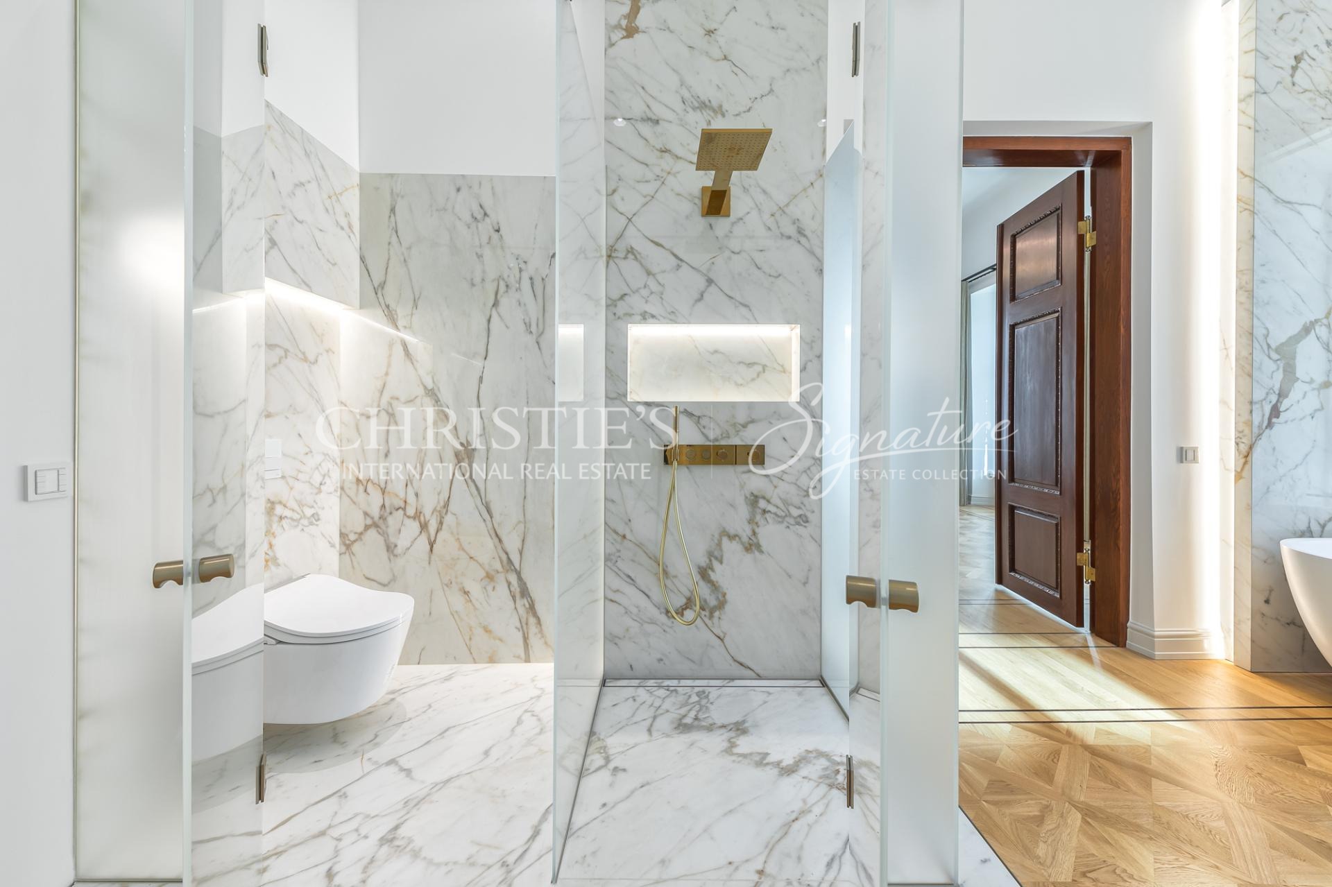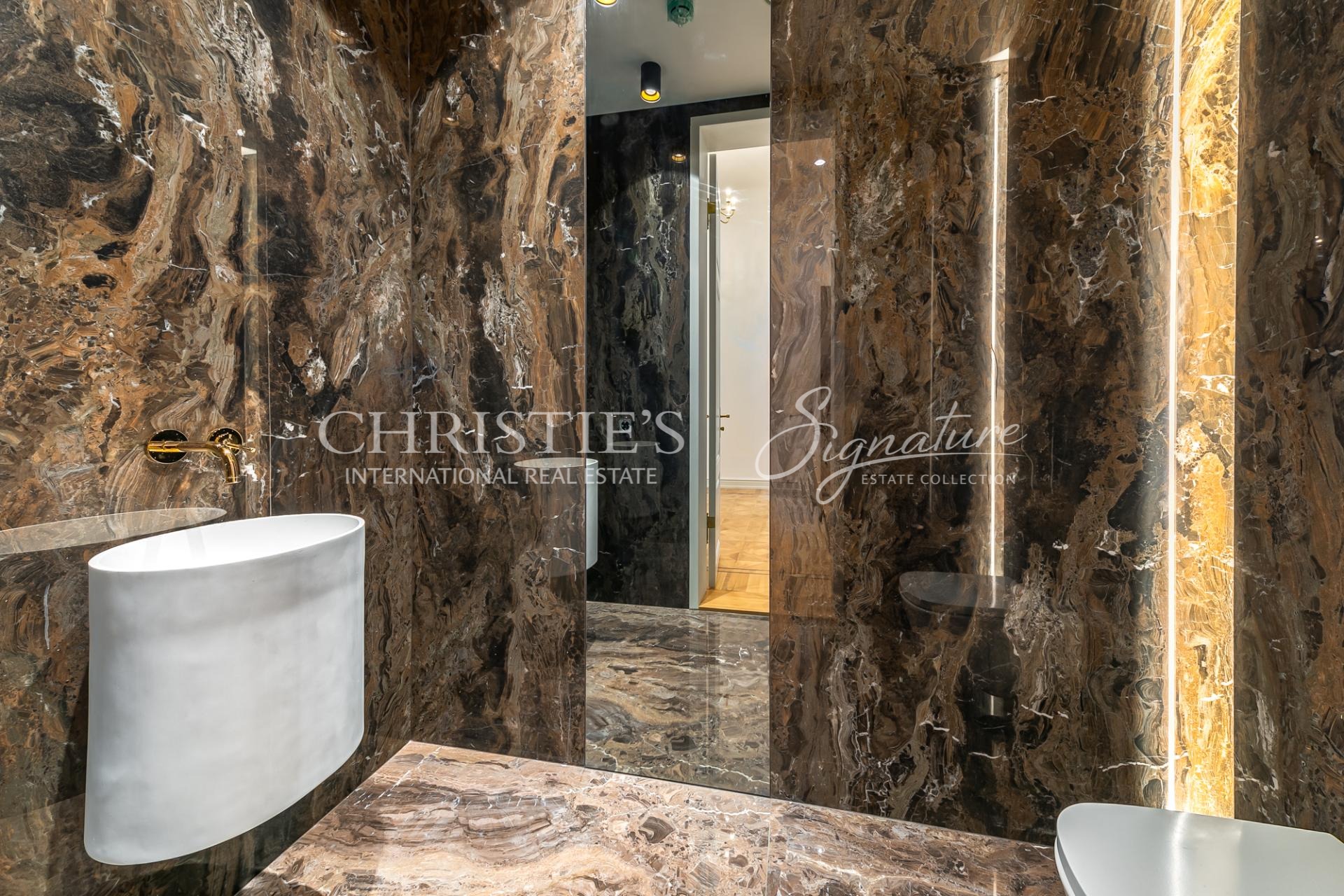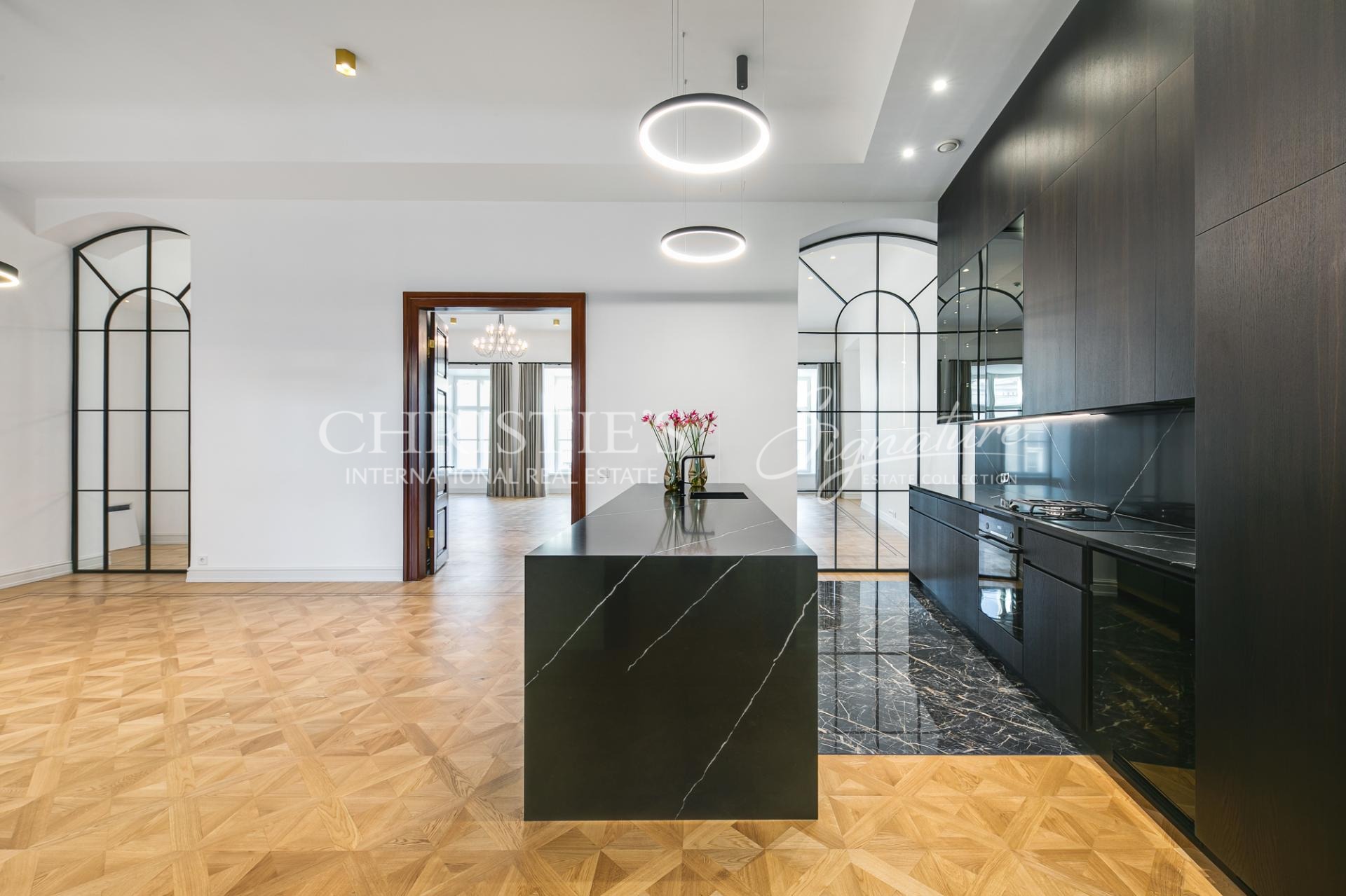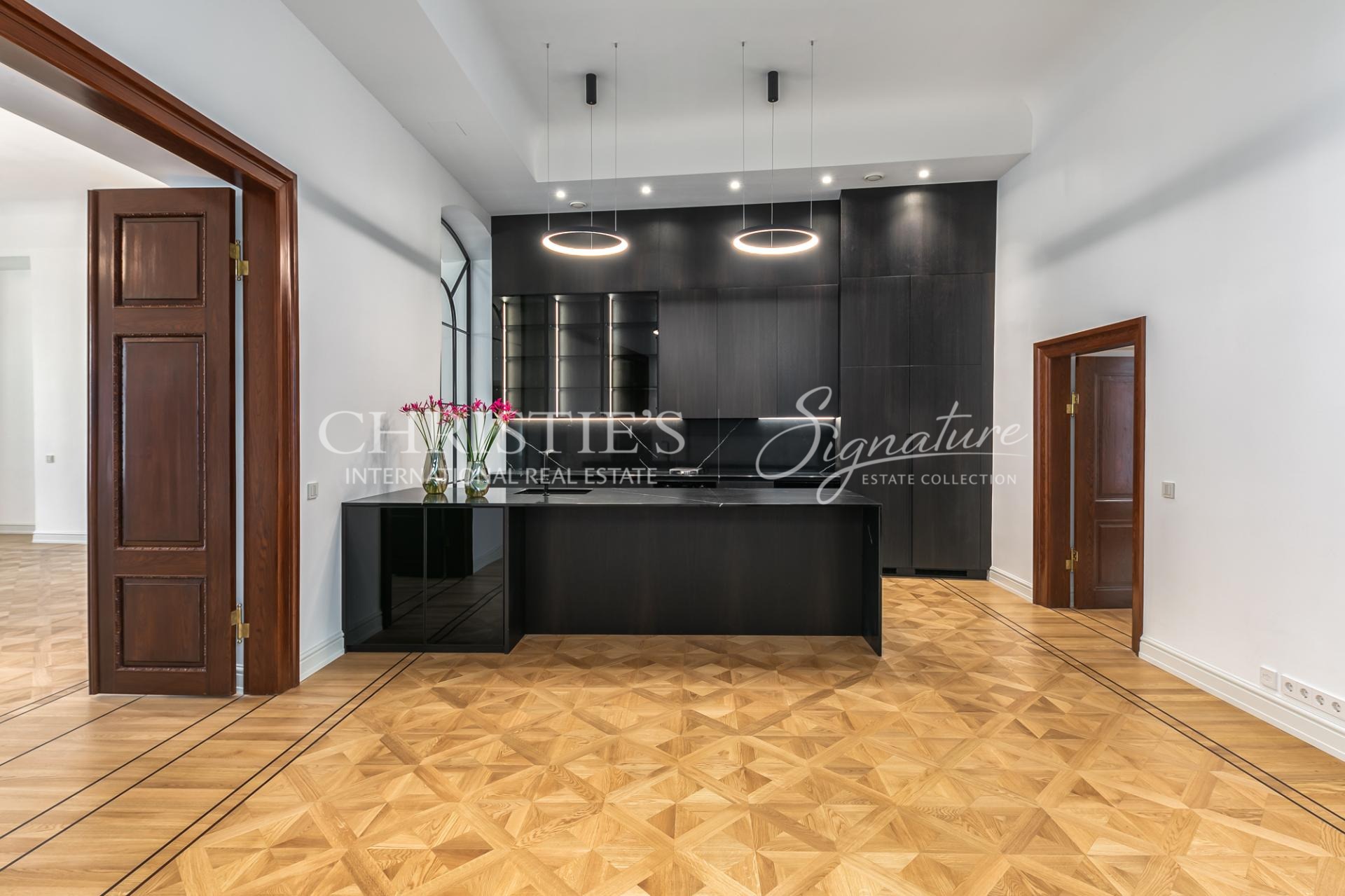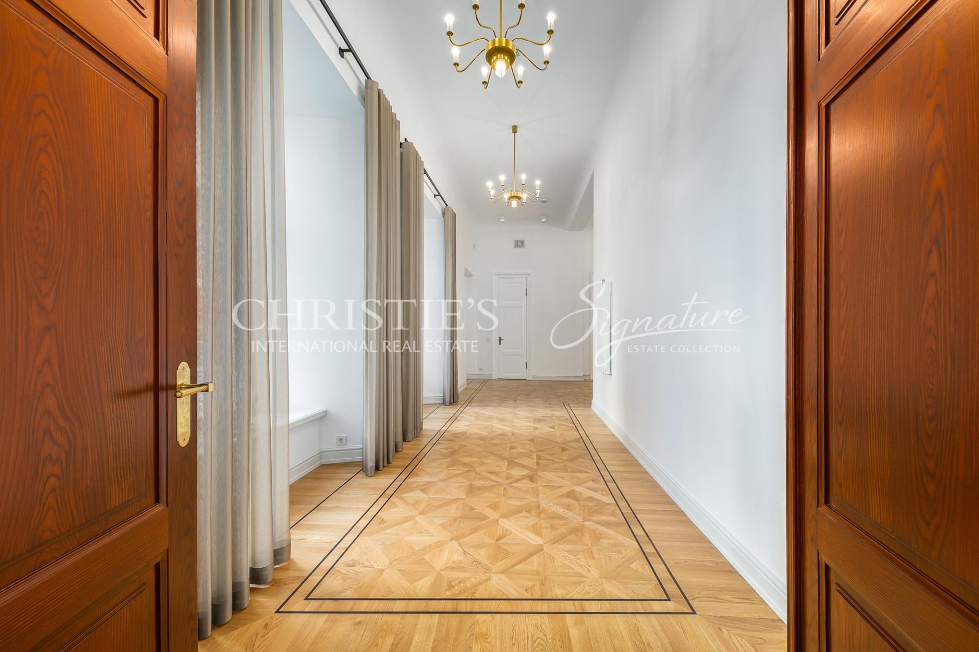 Upon entering the apartment, you will find a spacious hall (39.4 m²) where it is possible to organize a reception, a representative office/library allows you to work remotely and hold meetings, a bright living room (79 m²) for family relaxation is separated from the kitchen by double doors and glass walls.