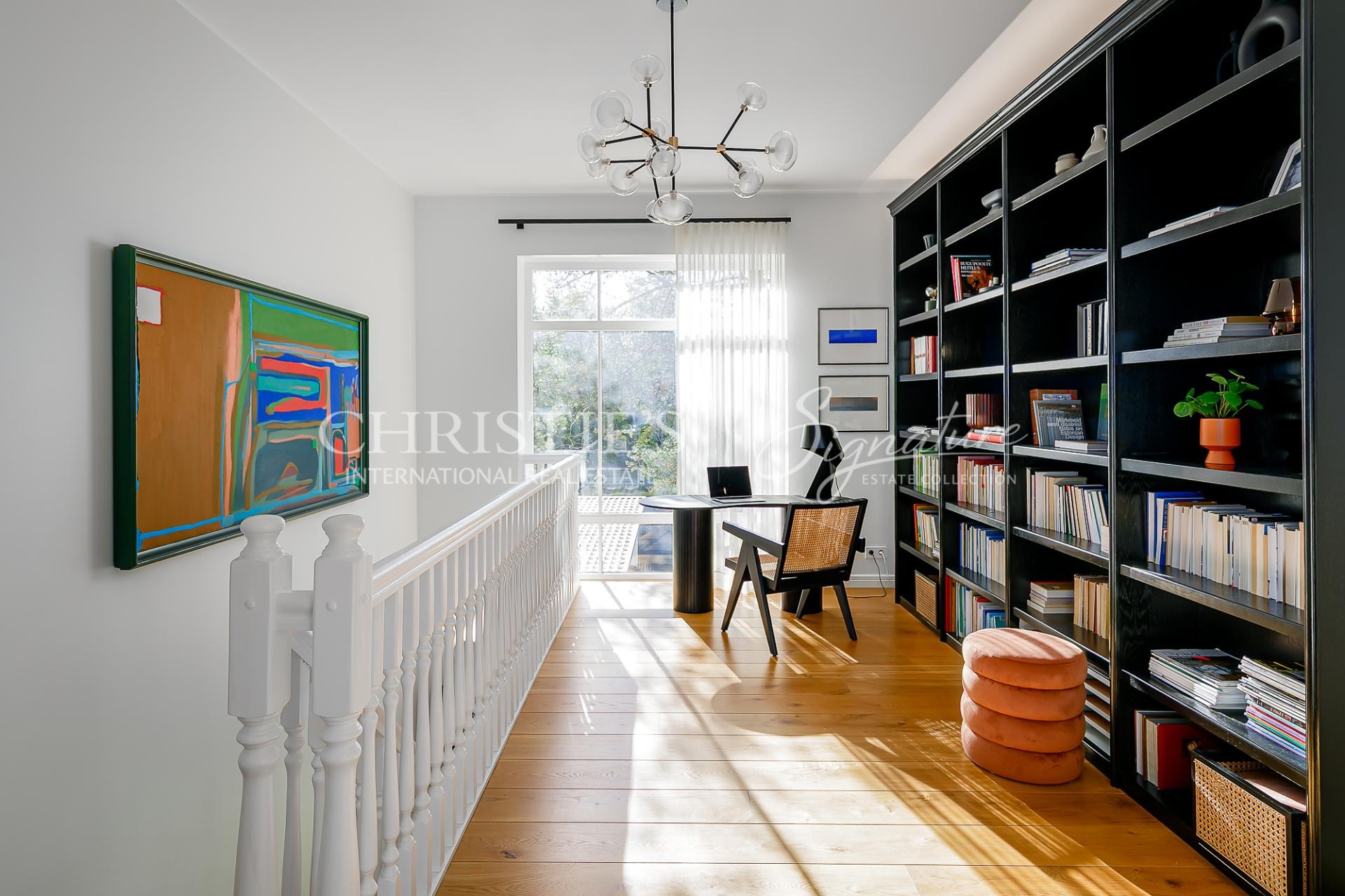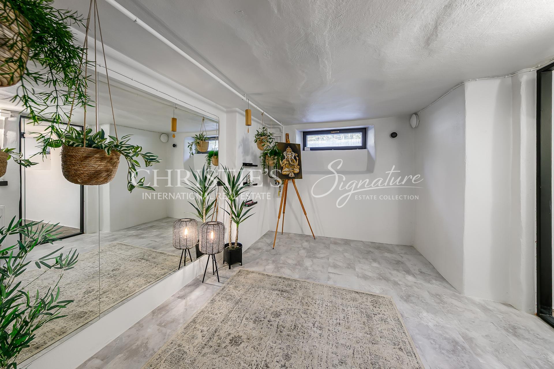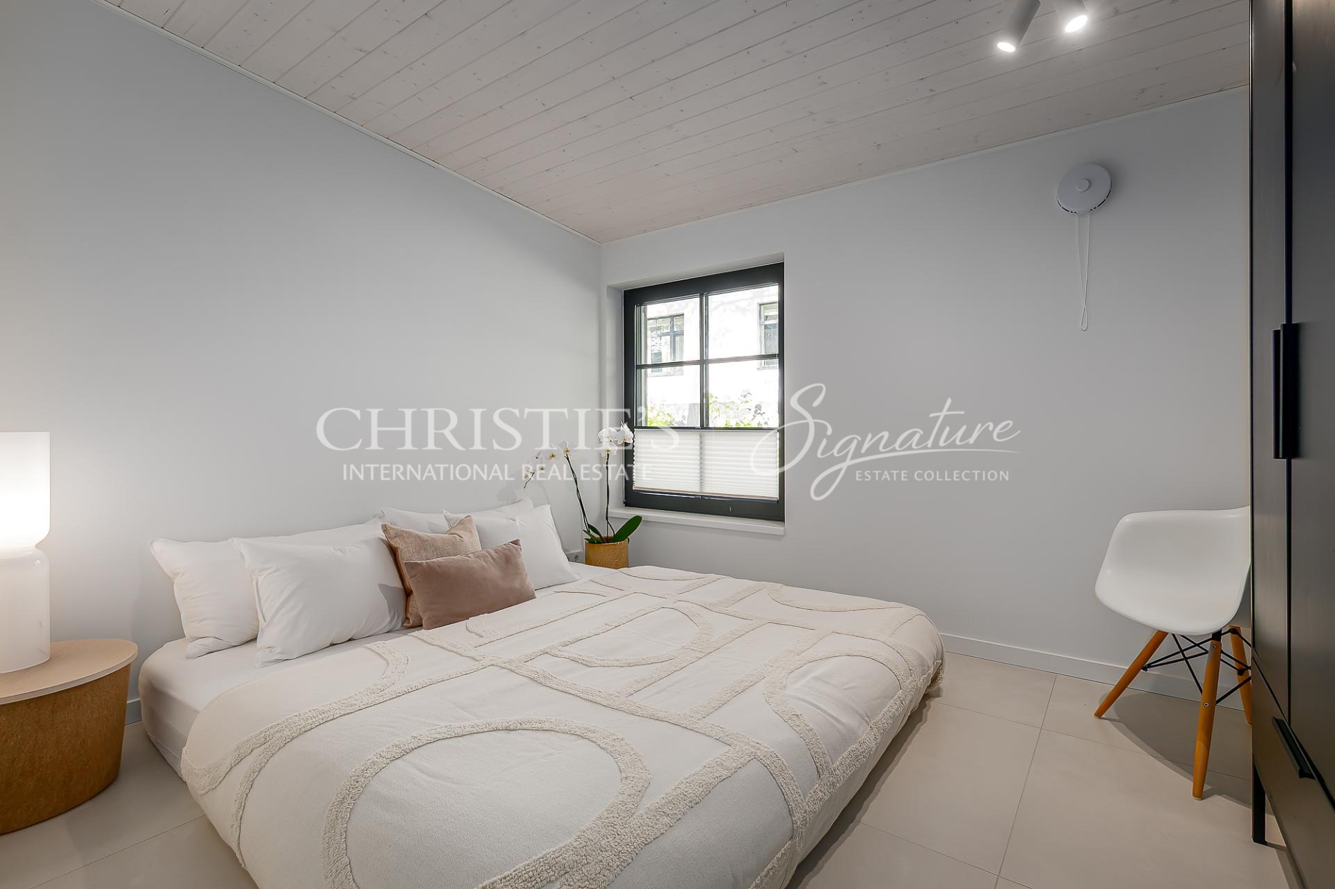The property features a refurbished main house and a brand-new guest house, beautifully connected by elegant landscaping, inviting cozy terraces, and sunny outdoor seating areas.