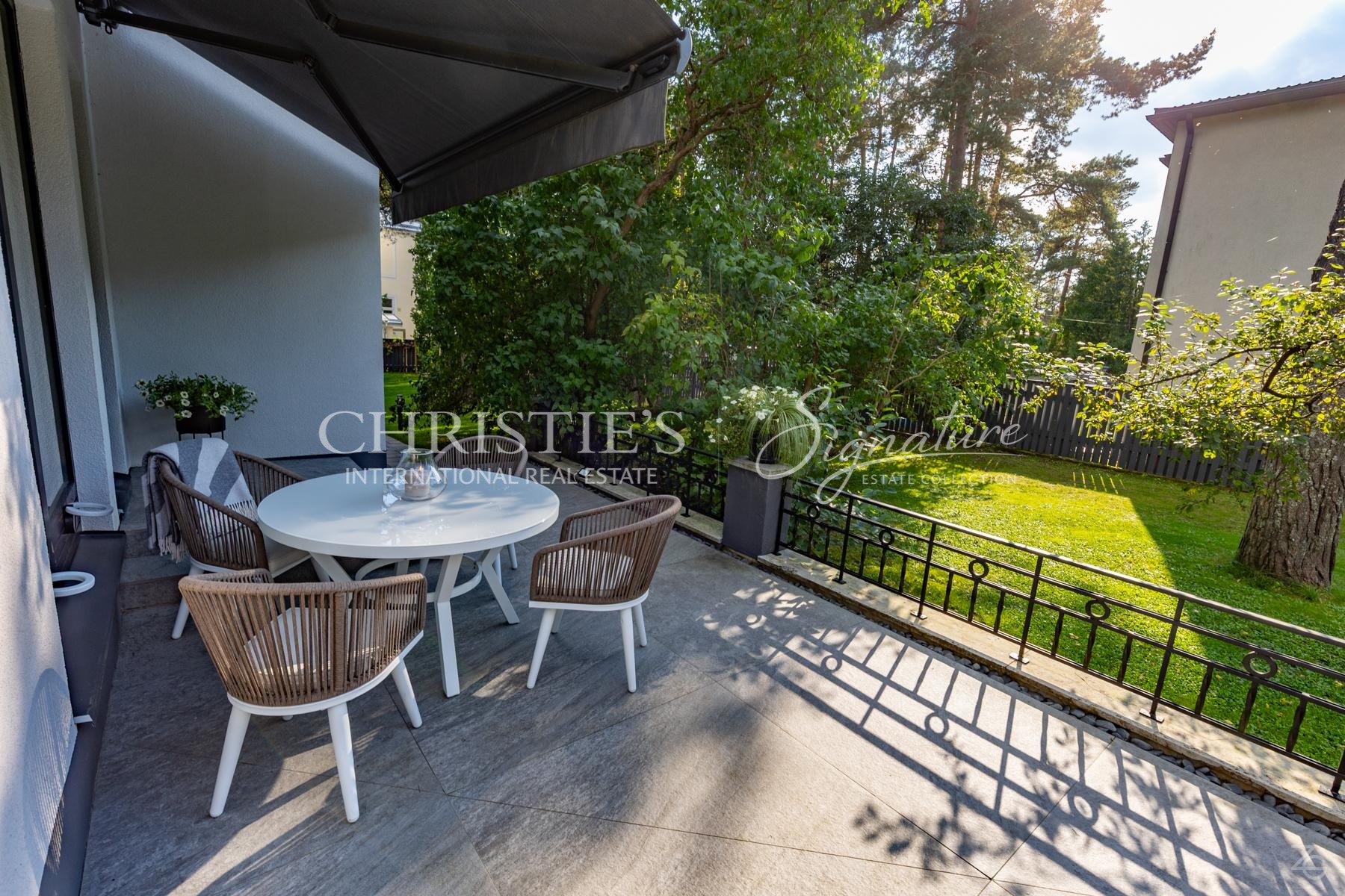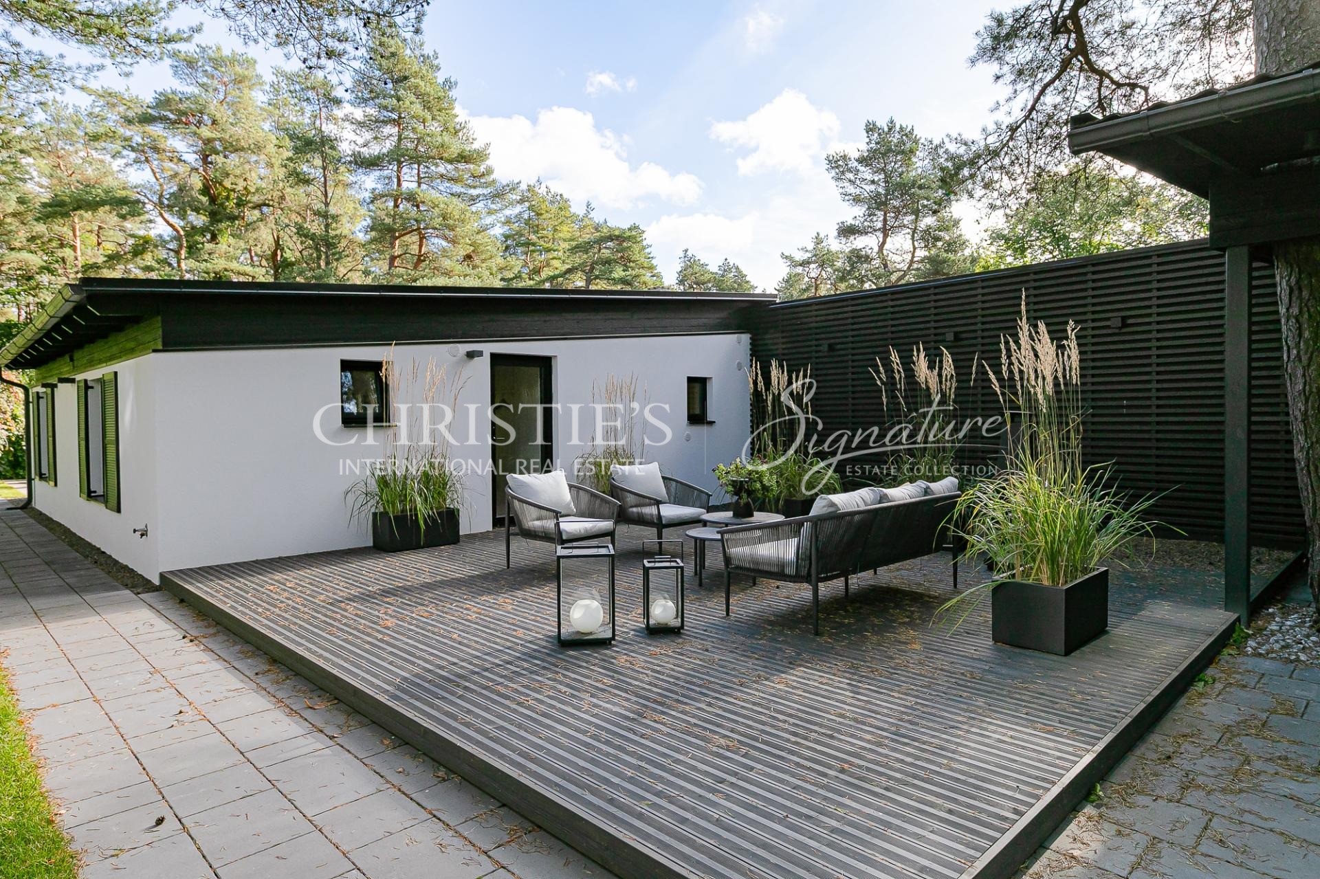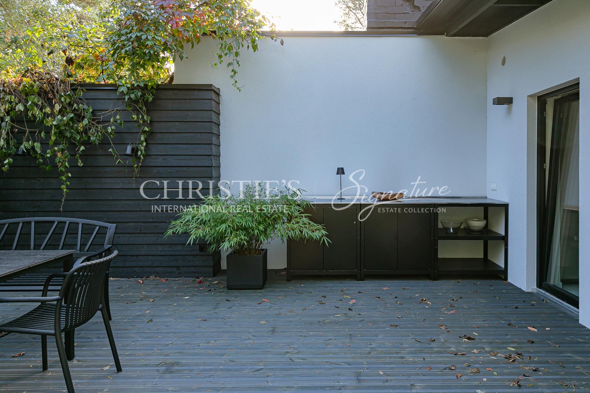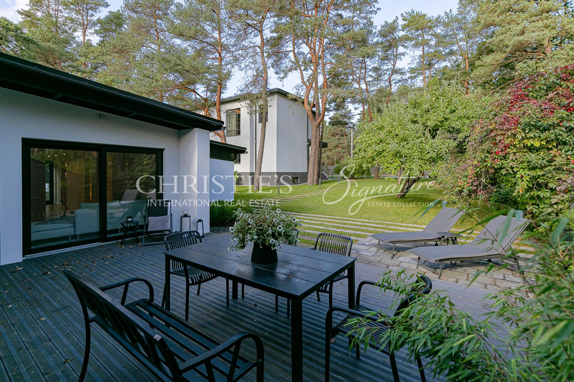 Backyard area features additionally a separate storeroom, multiple terraces and private seating zones, perfect for outdoor living surrounded by nature. This fully furnished property is ready to move in. Located on a quiet street, bordered by a beautiful pine forest and with excellent quick access to the city center. A safe, green, and family-friendly environment that is hard to find.