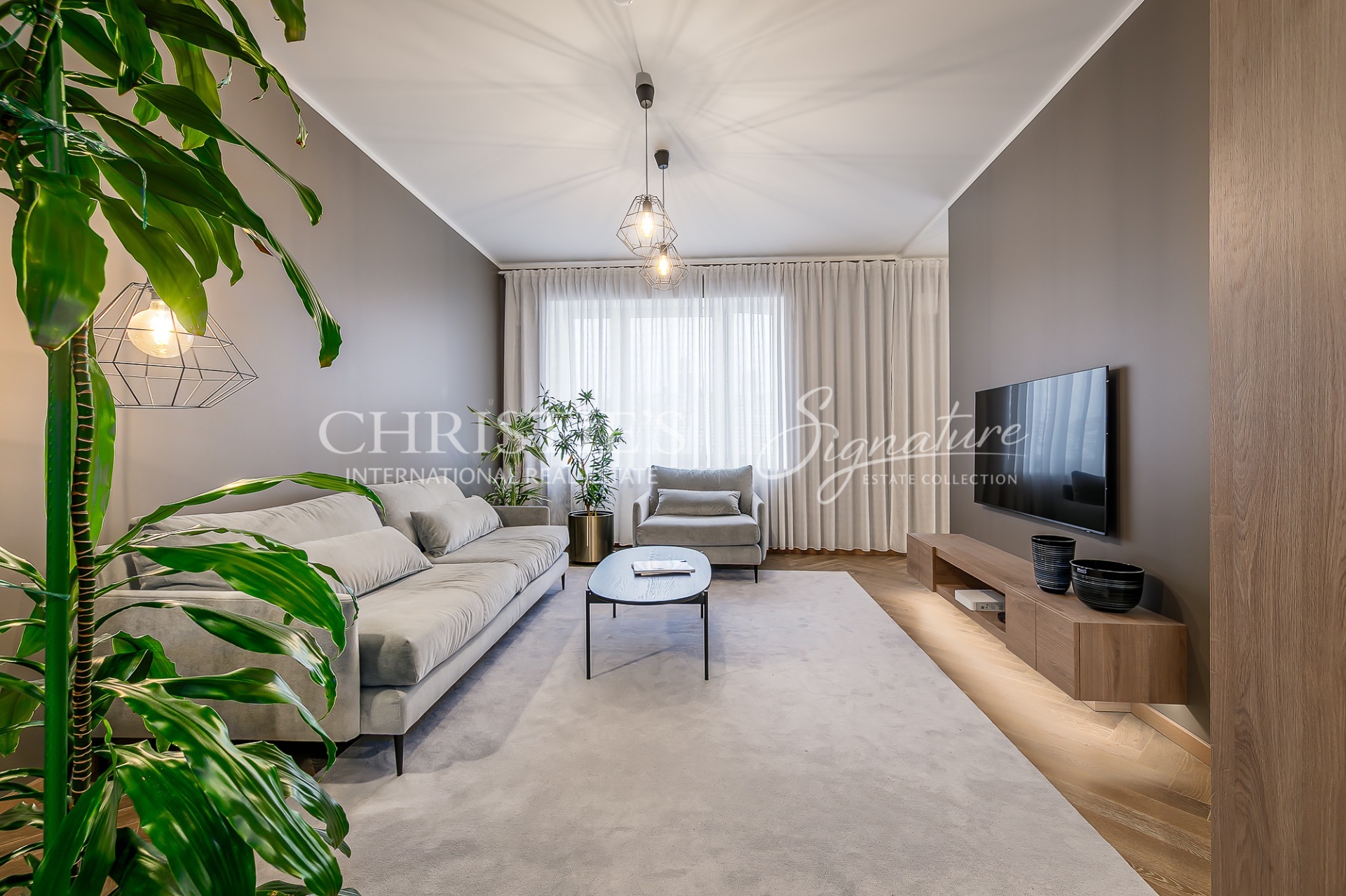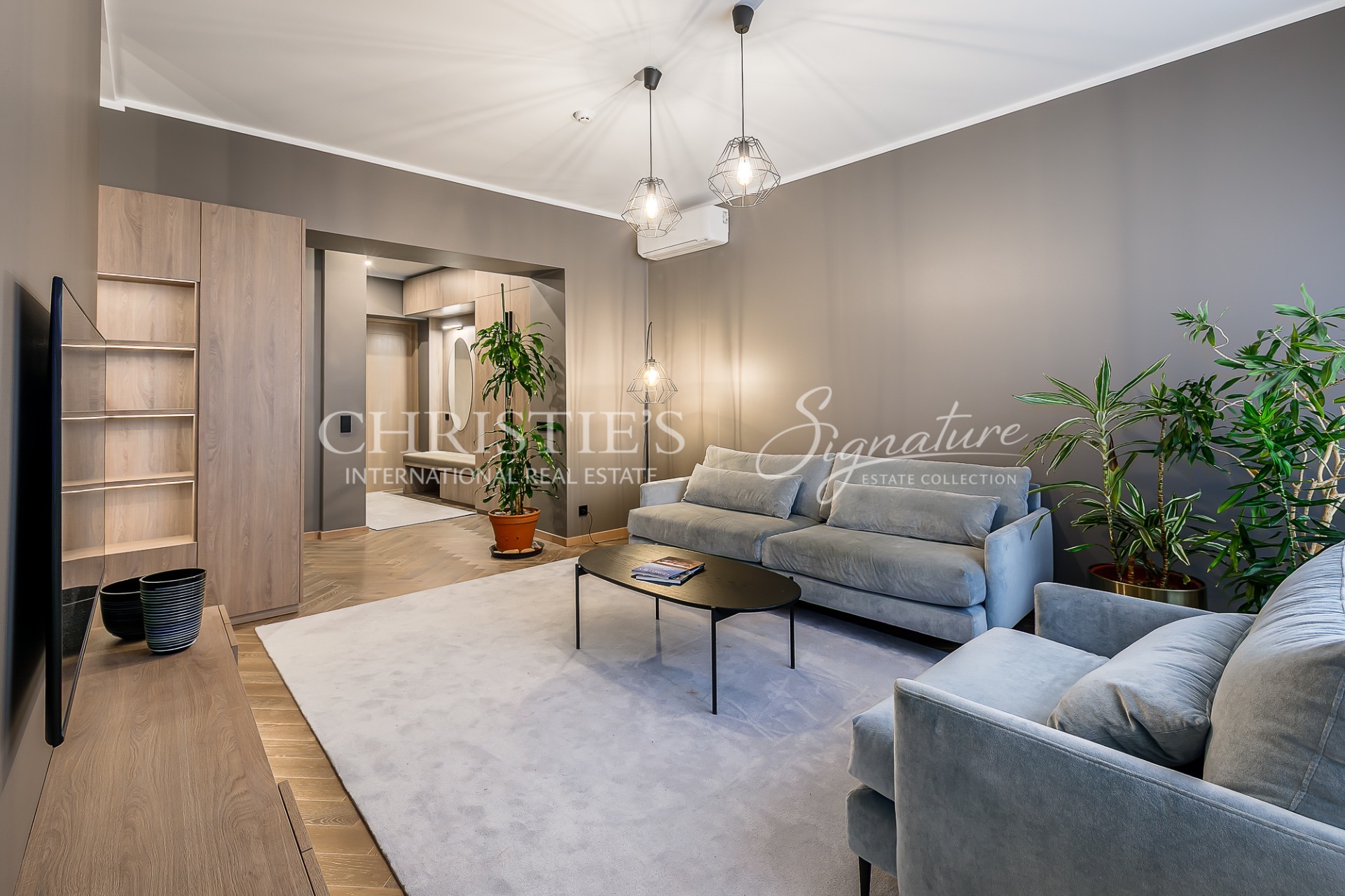In the living room there is a sofa, armchair and a large TV on the wall.