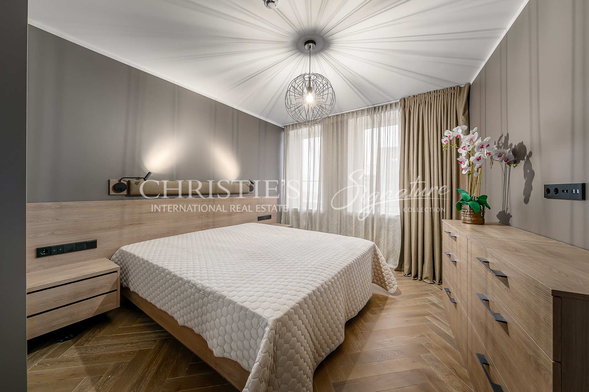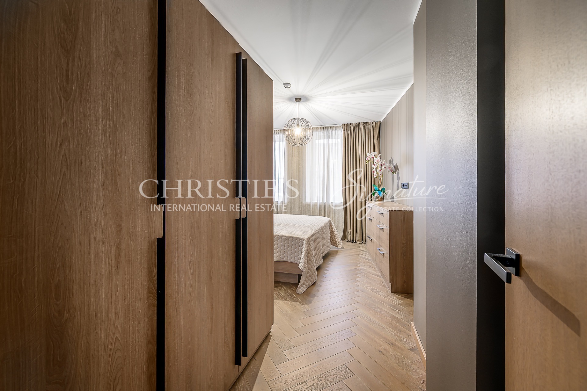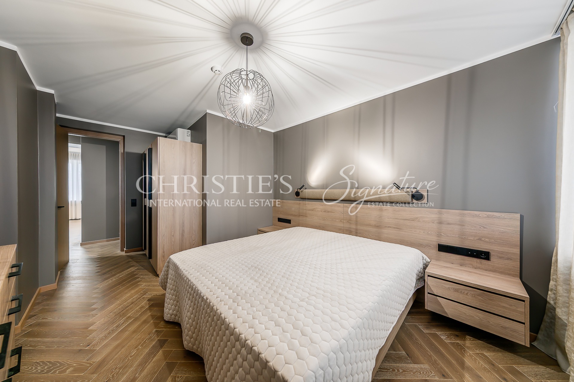 In the bedroom there is a large wardrobe with lights, a bed, bedside tables. The bedroom is fitted with electric blackout curtains, which can be closed and opened without getting out of bed.