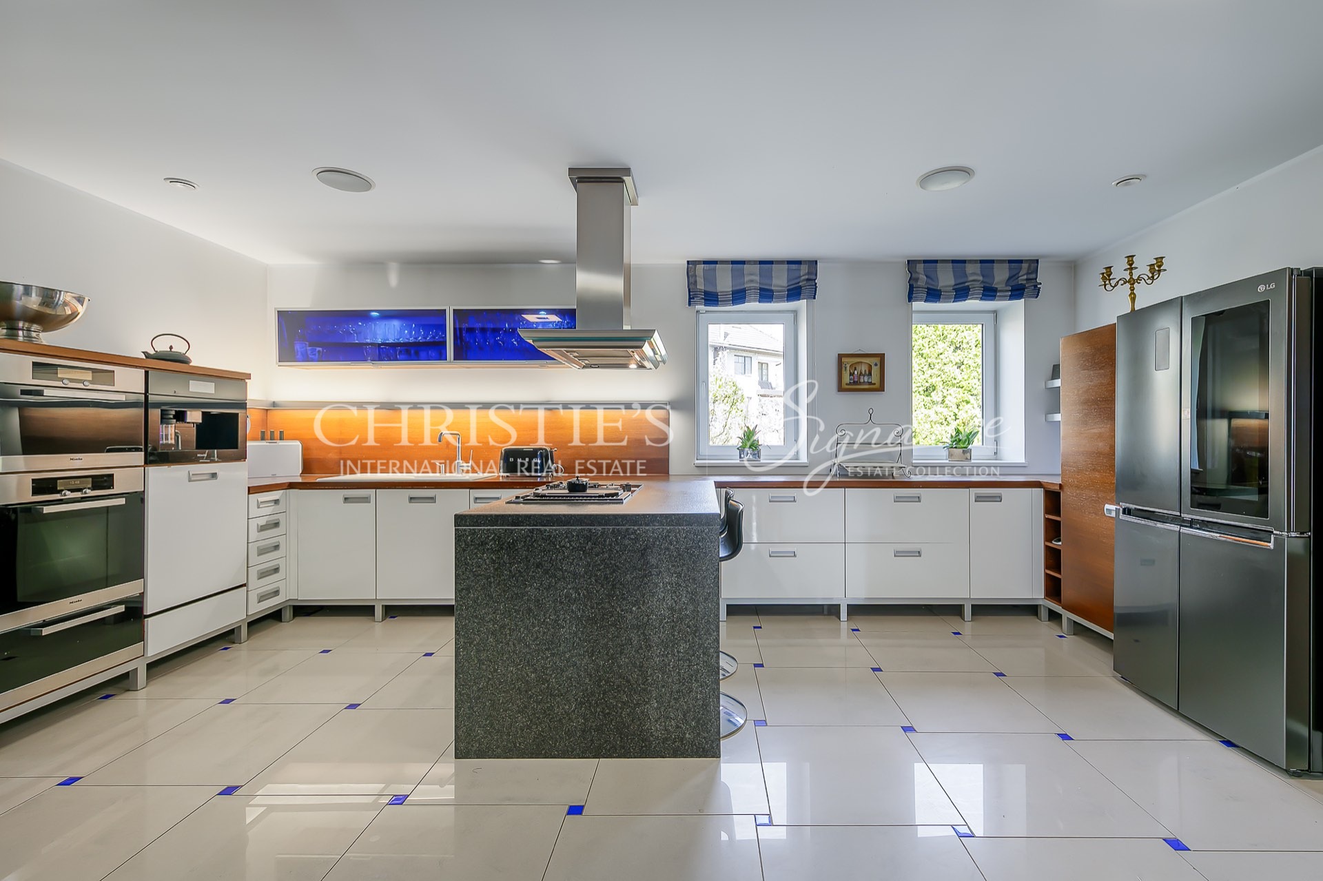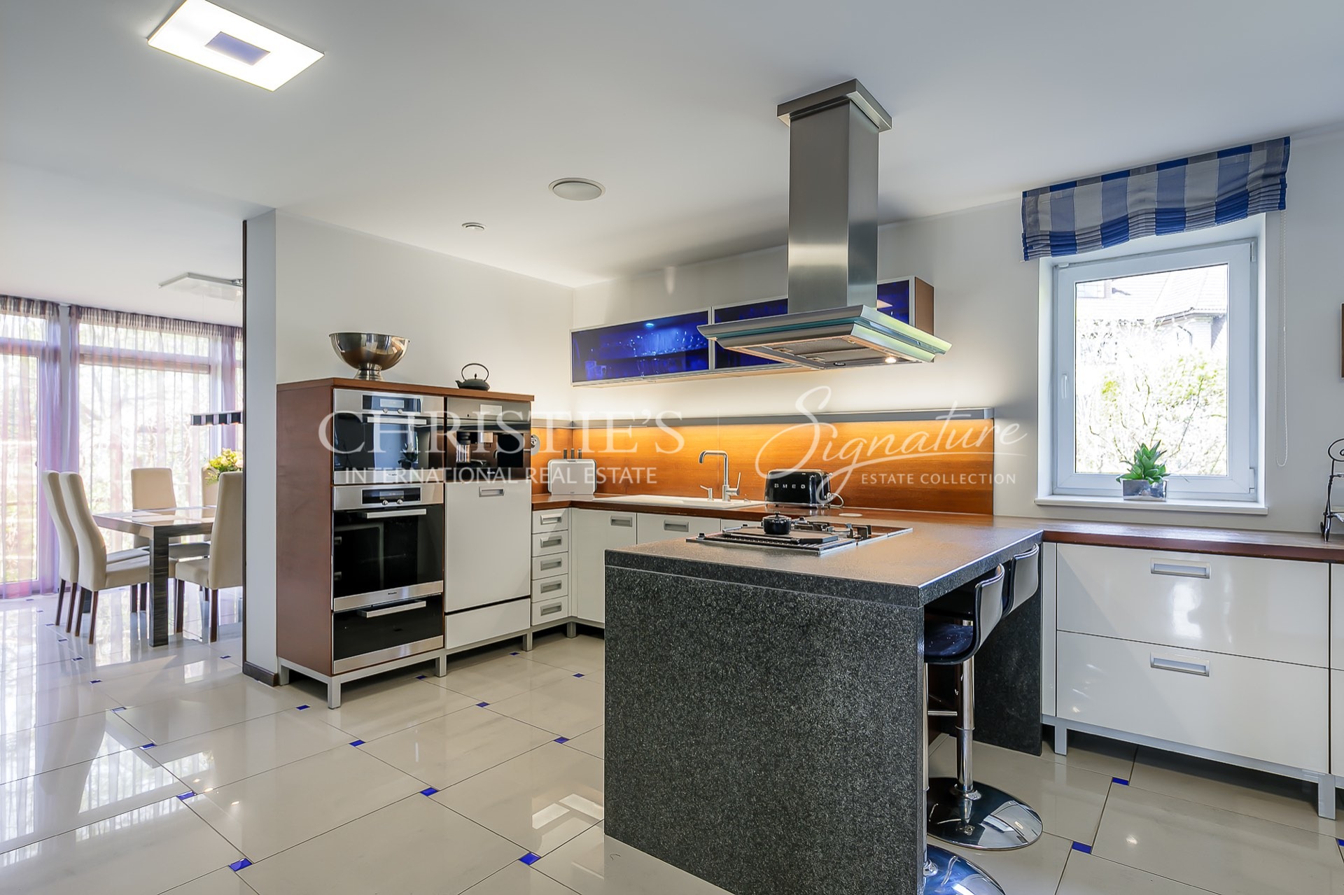The property has a two-story house with a spacious and cozy living room with a fireplace on the first floor. From the living room you can access the light-filled separate dining room, from which you can go directly outside. The large kitchen is also separate and equipped with high-quality Miele appliances.