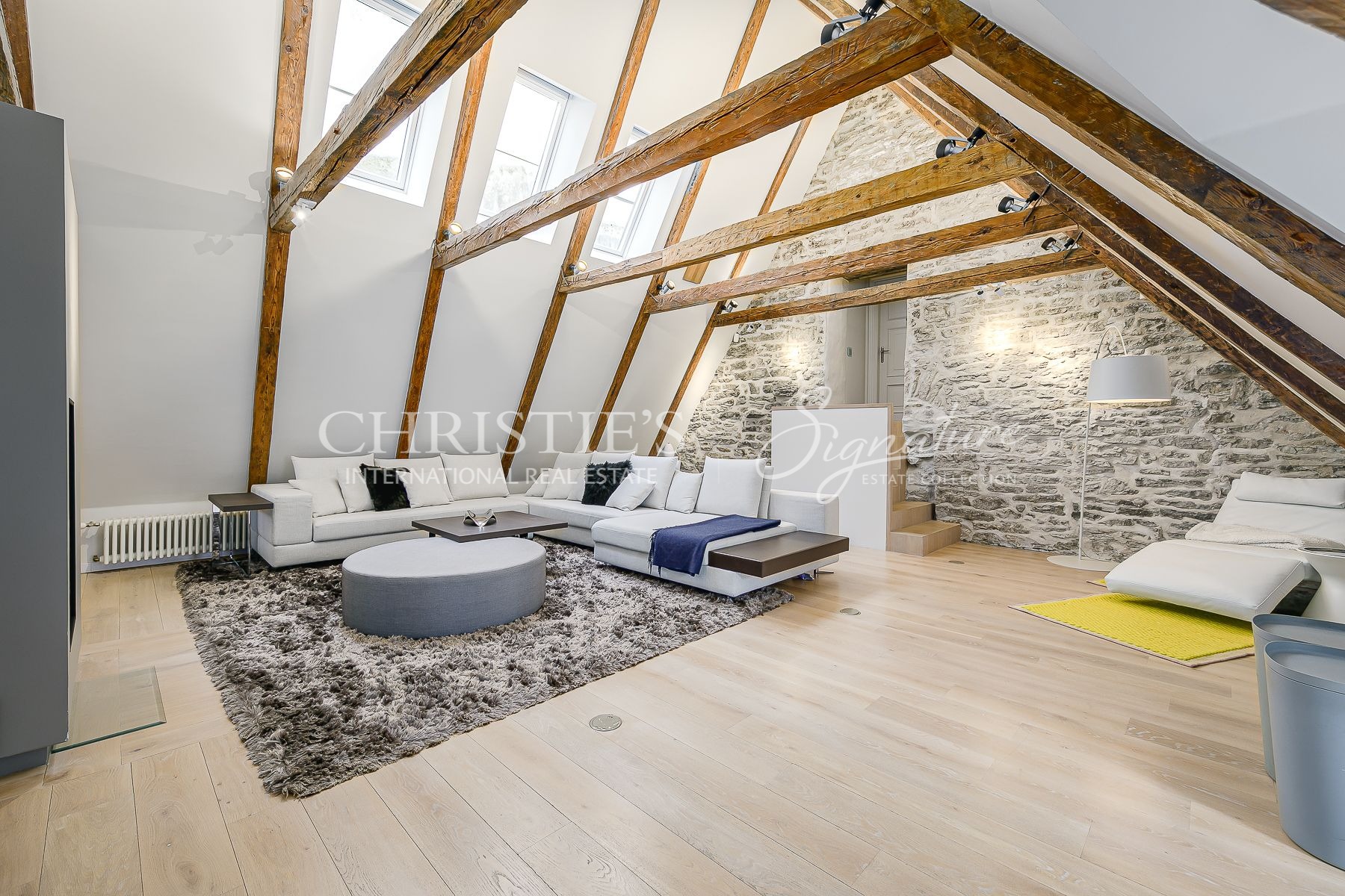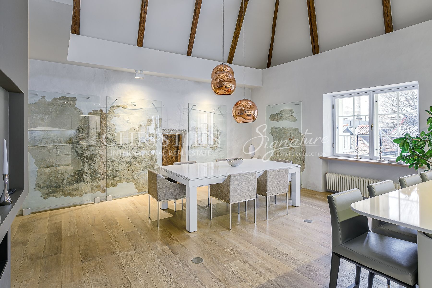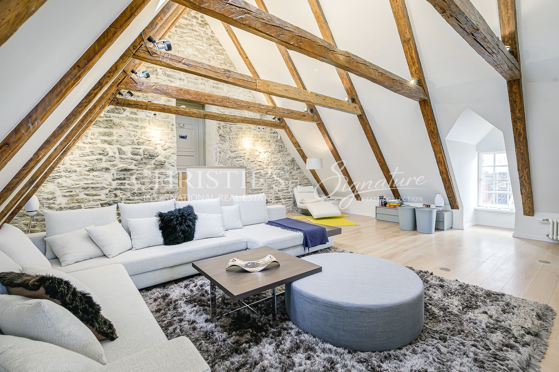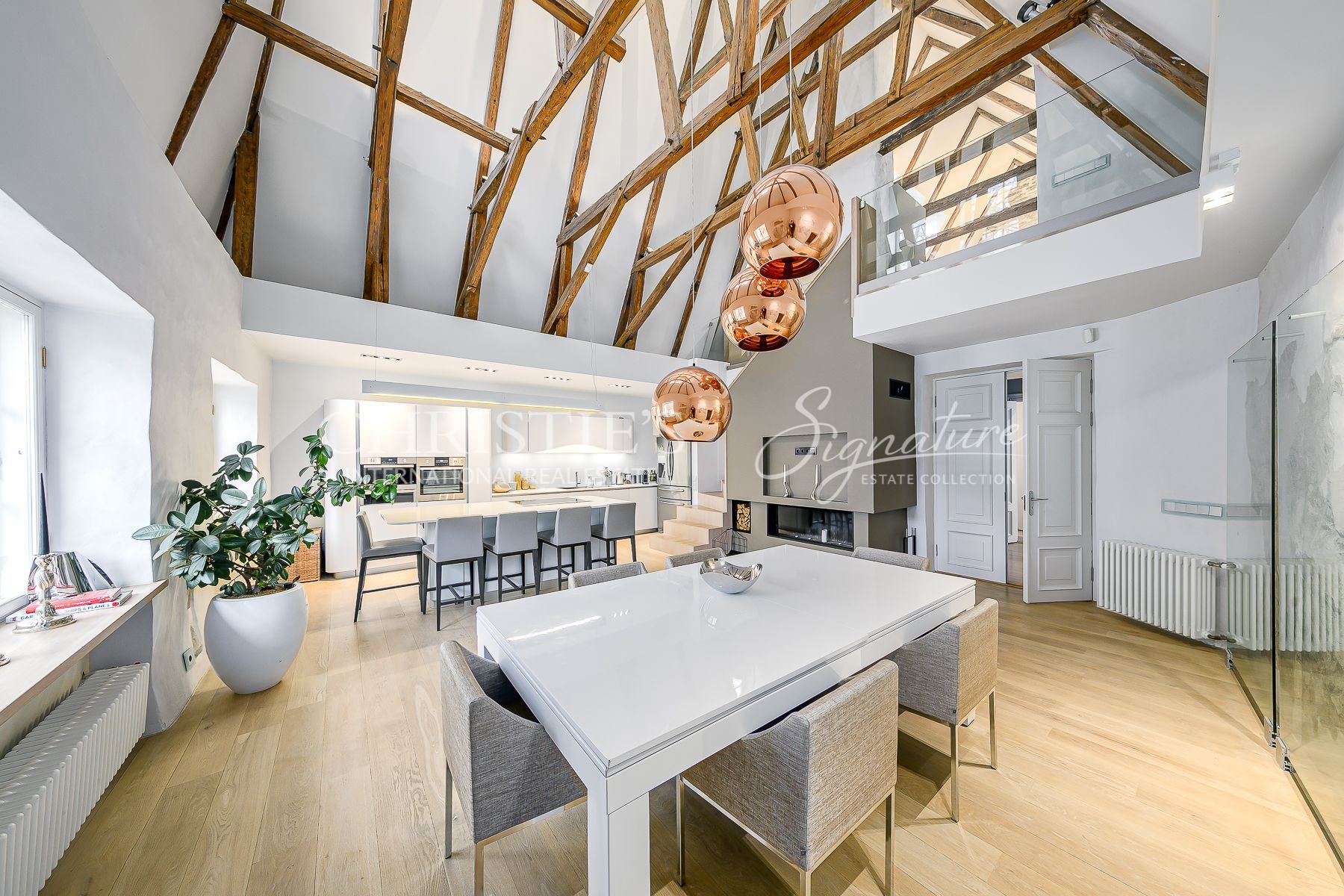 A massive selection of old and thick wooden beans decorate the ceiling in the living room and kitchen where the room height reaches close to 8 meters.