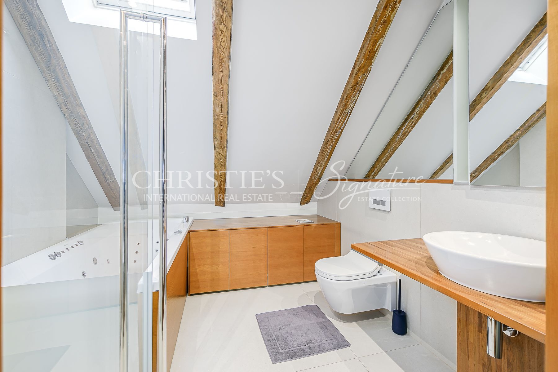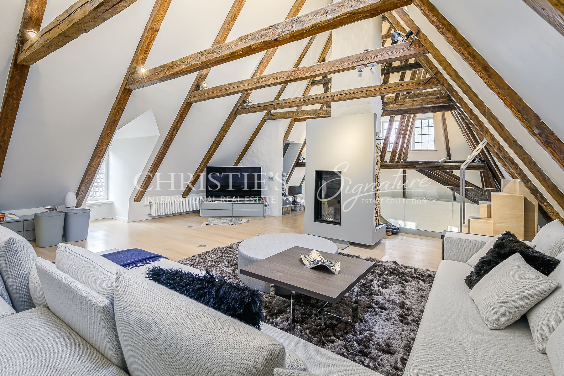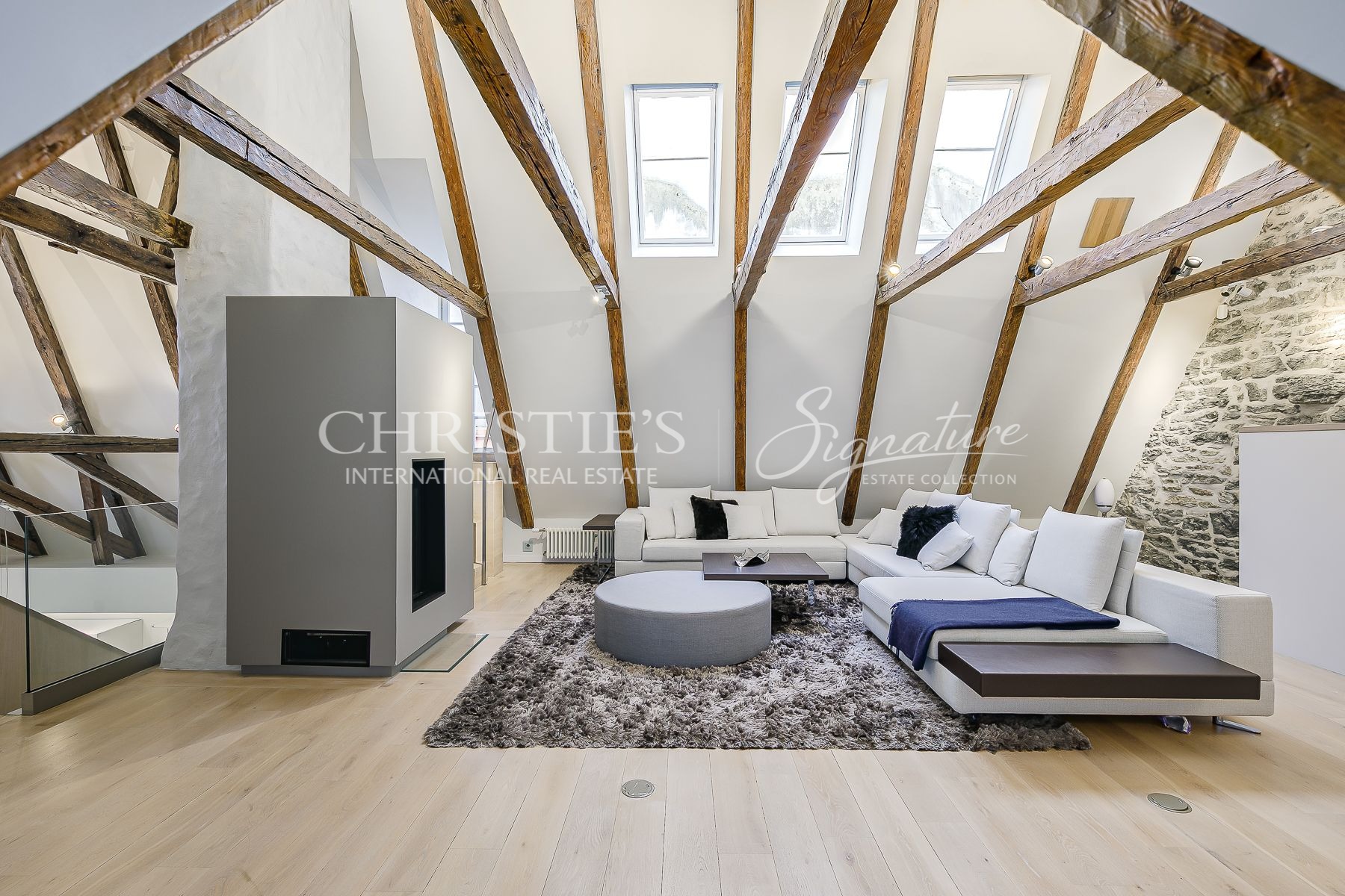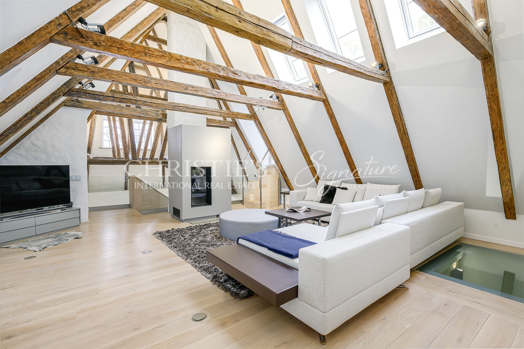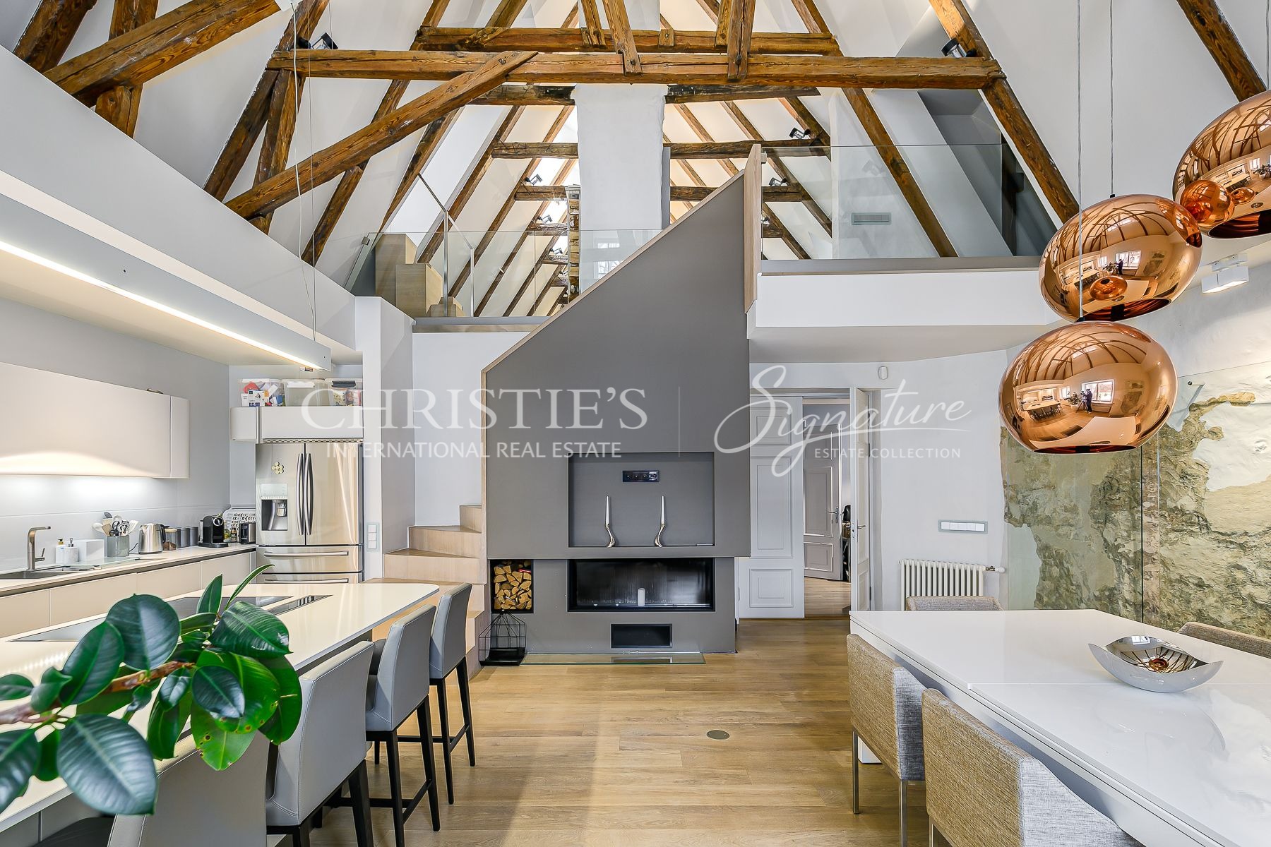 A massive selection of old and thick wooden beans decorate the ceiling in the living room and kitchen where the room height reaches close to 8 meters.