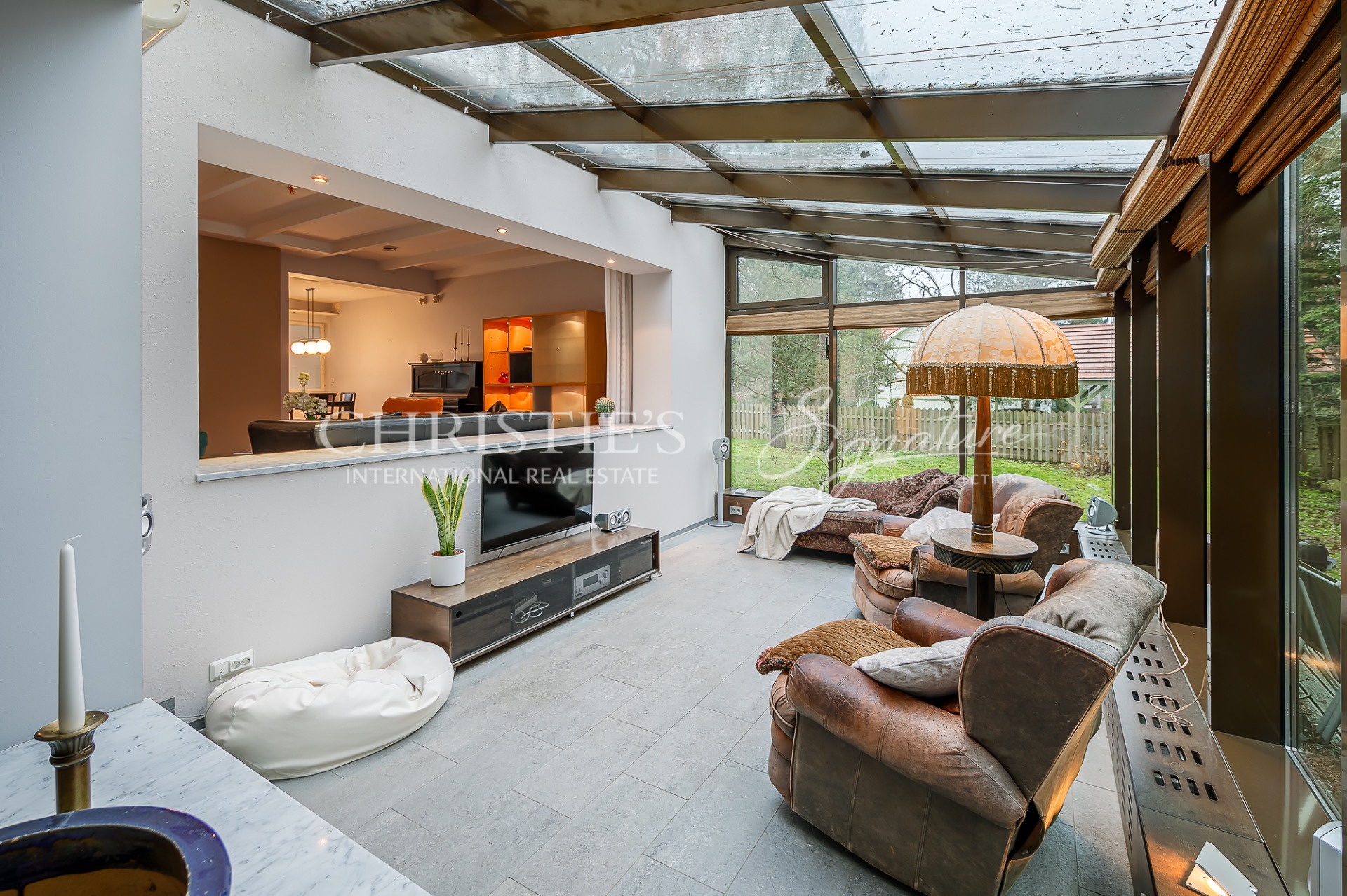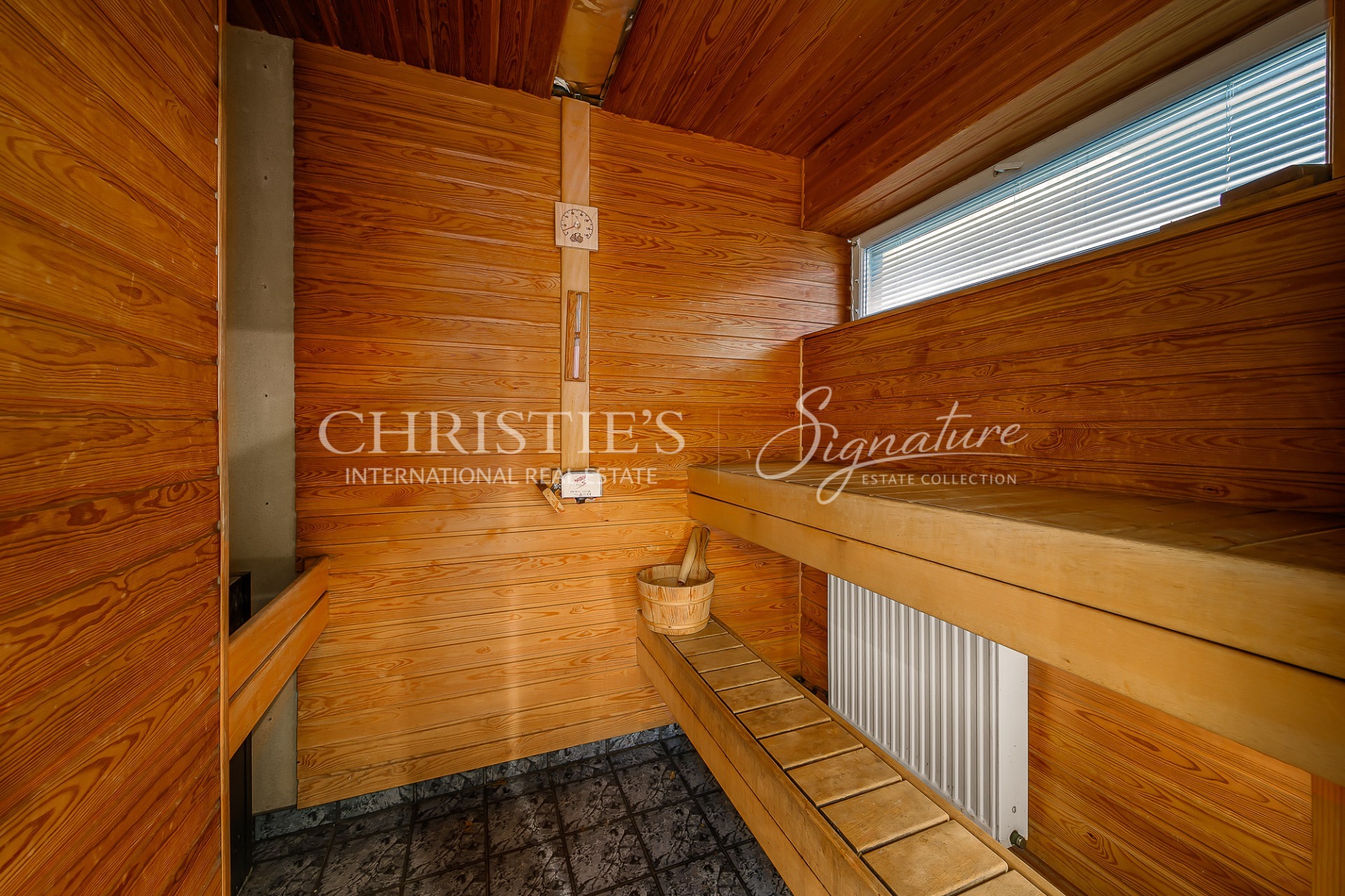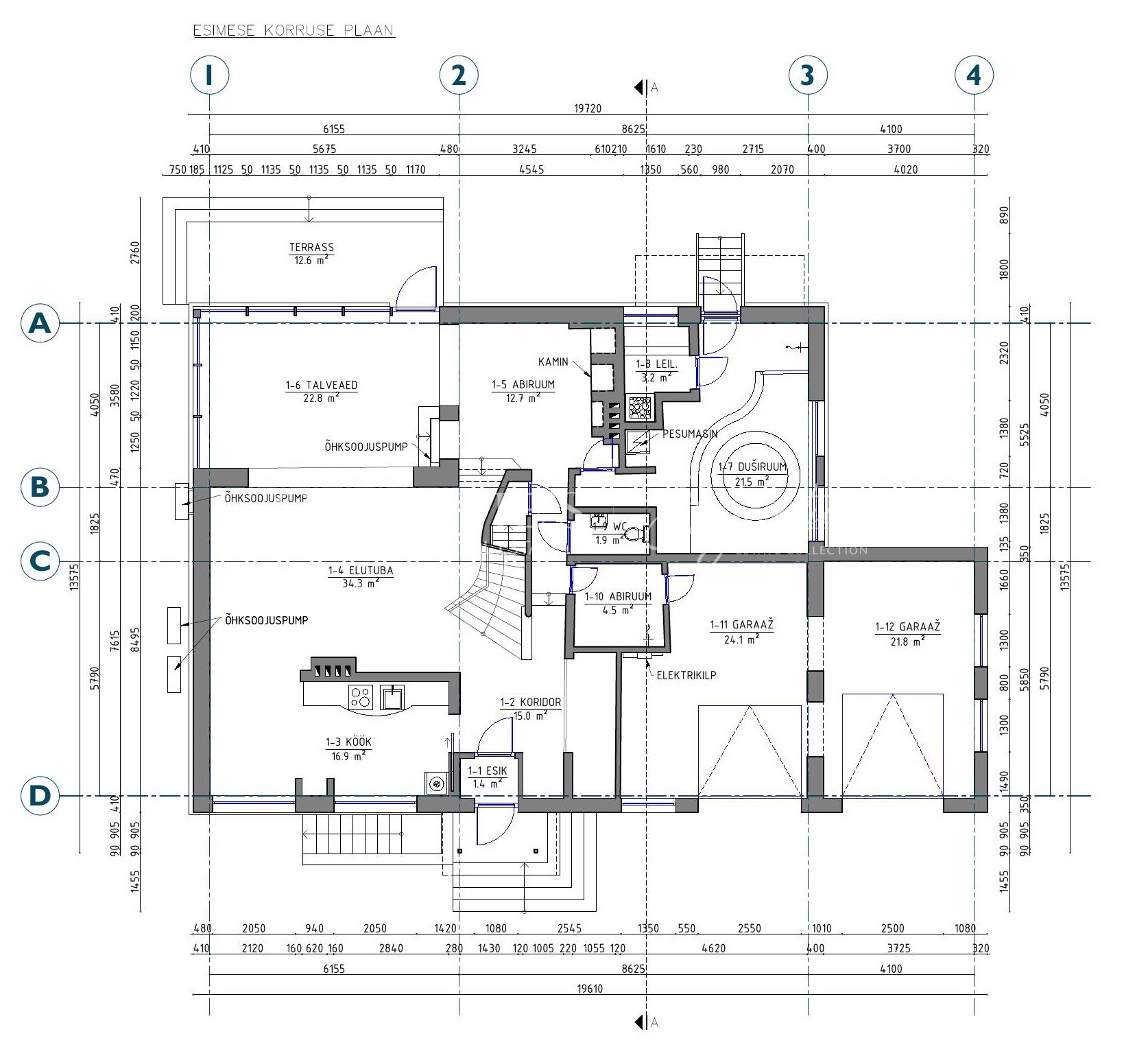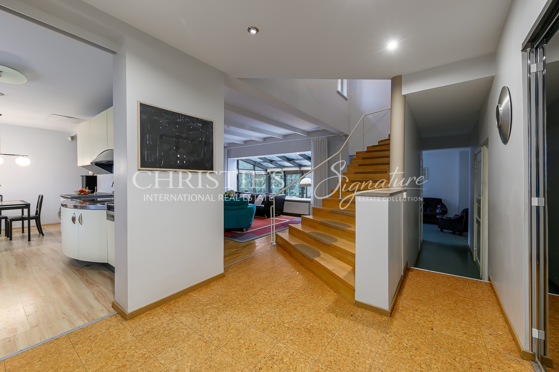 1st floor - hallway, living room with open kitchen, conservatory with access to the terrace, fireplace room, spacious sauna with jacuzzi, garage and laundry room leading from there to the hall.