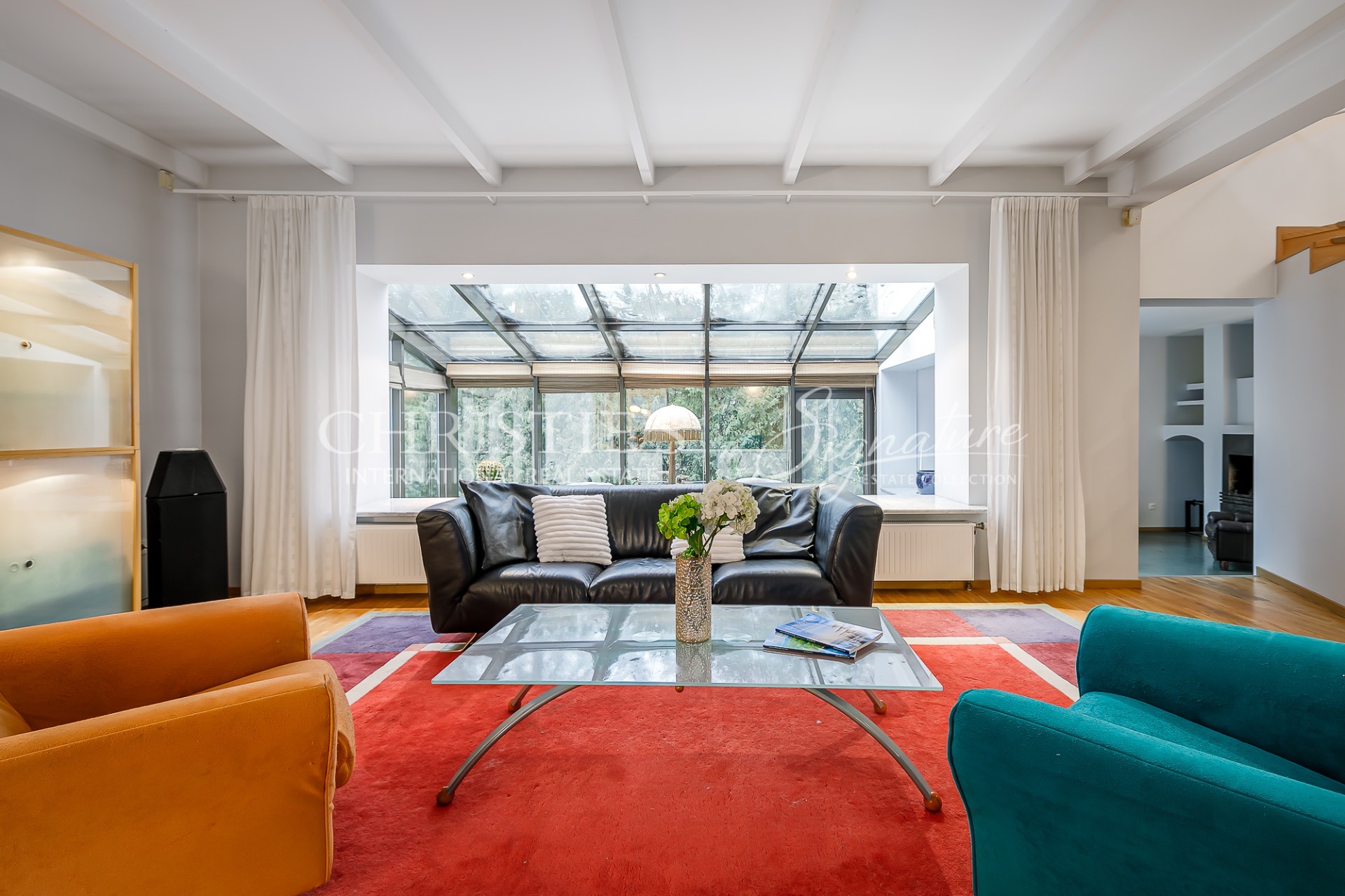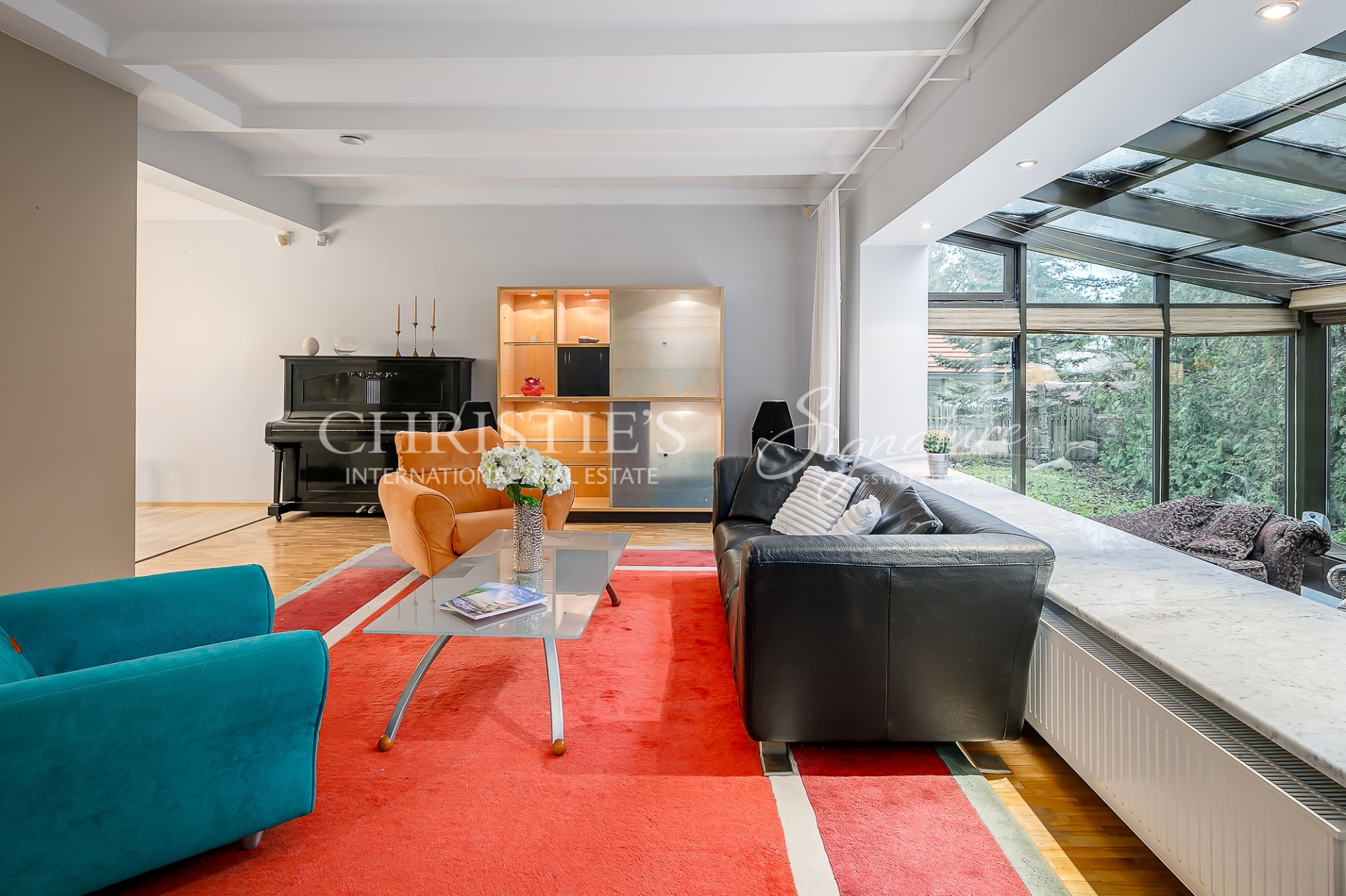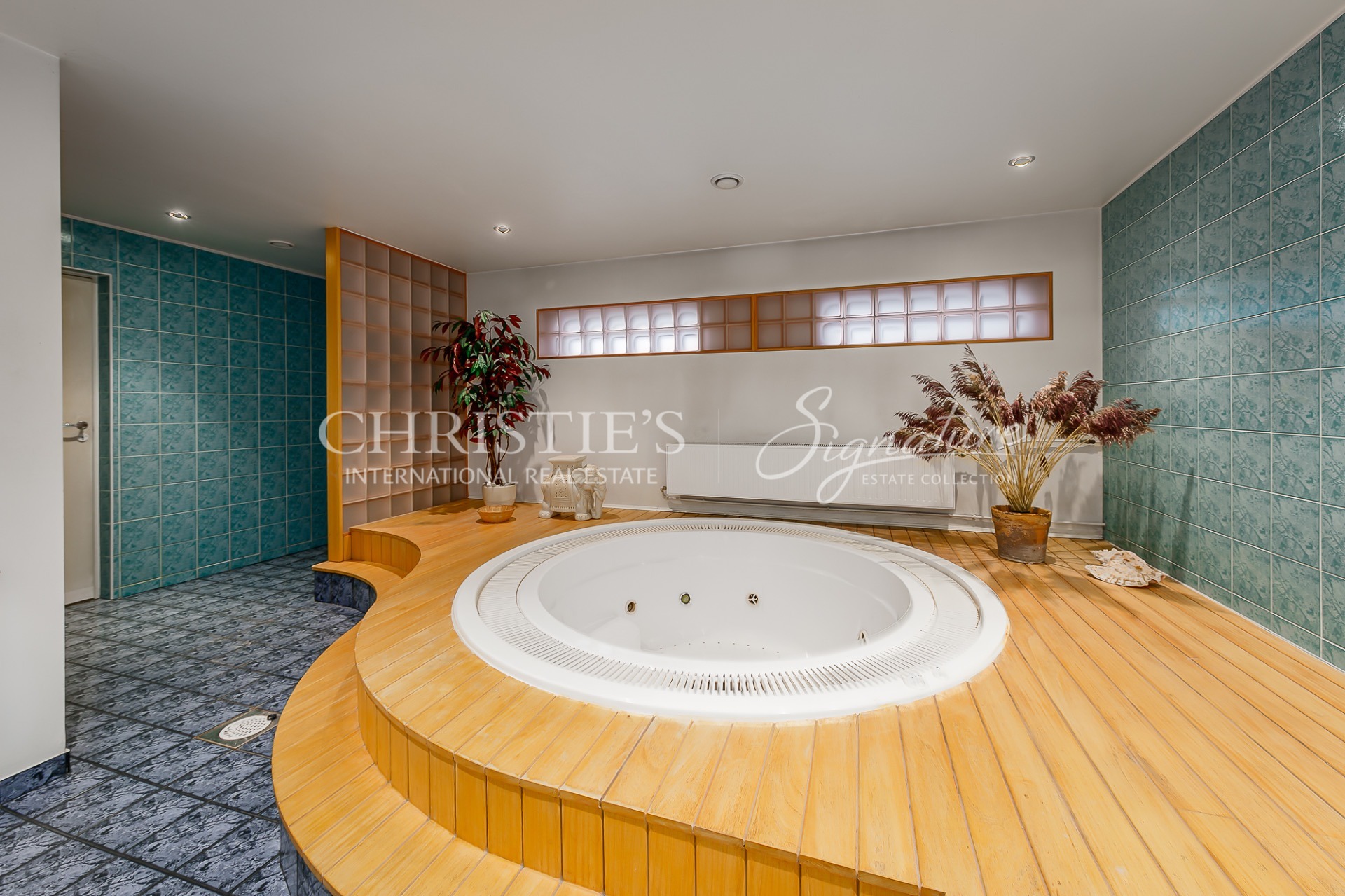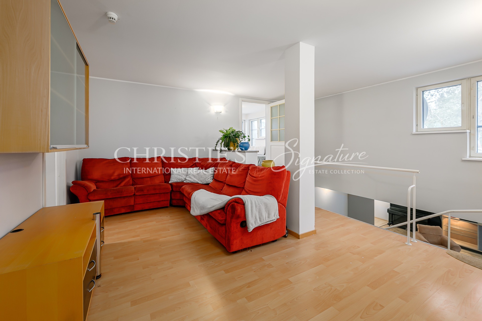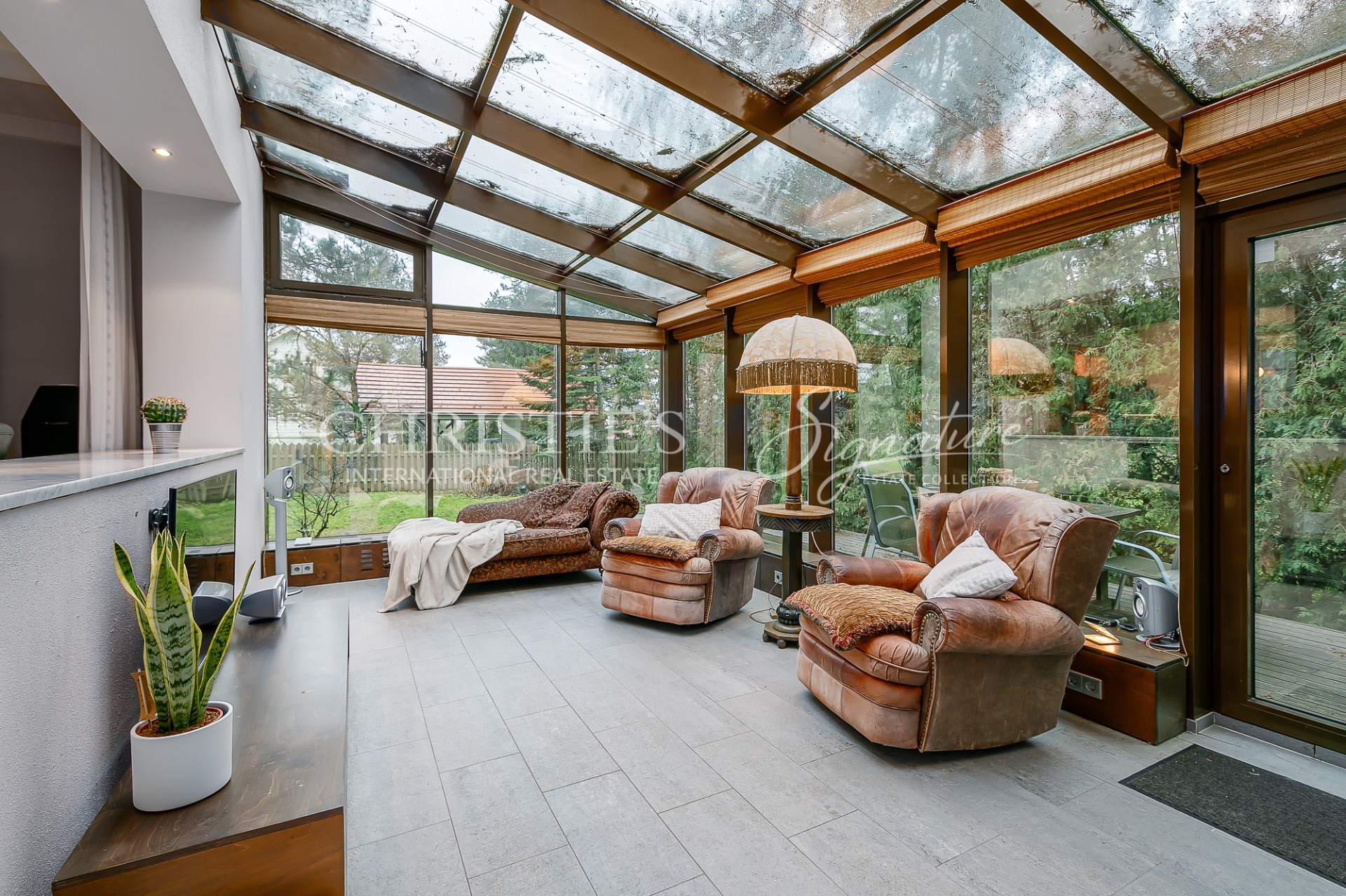 1st floor - hallway, living room with open kitchen, conservatory with access to the terrace, fireplace room, spacious sauna with jacuzzi, garage and laundry room leading from there to the hall.