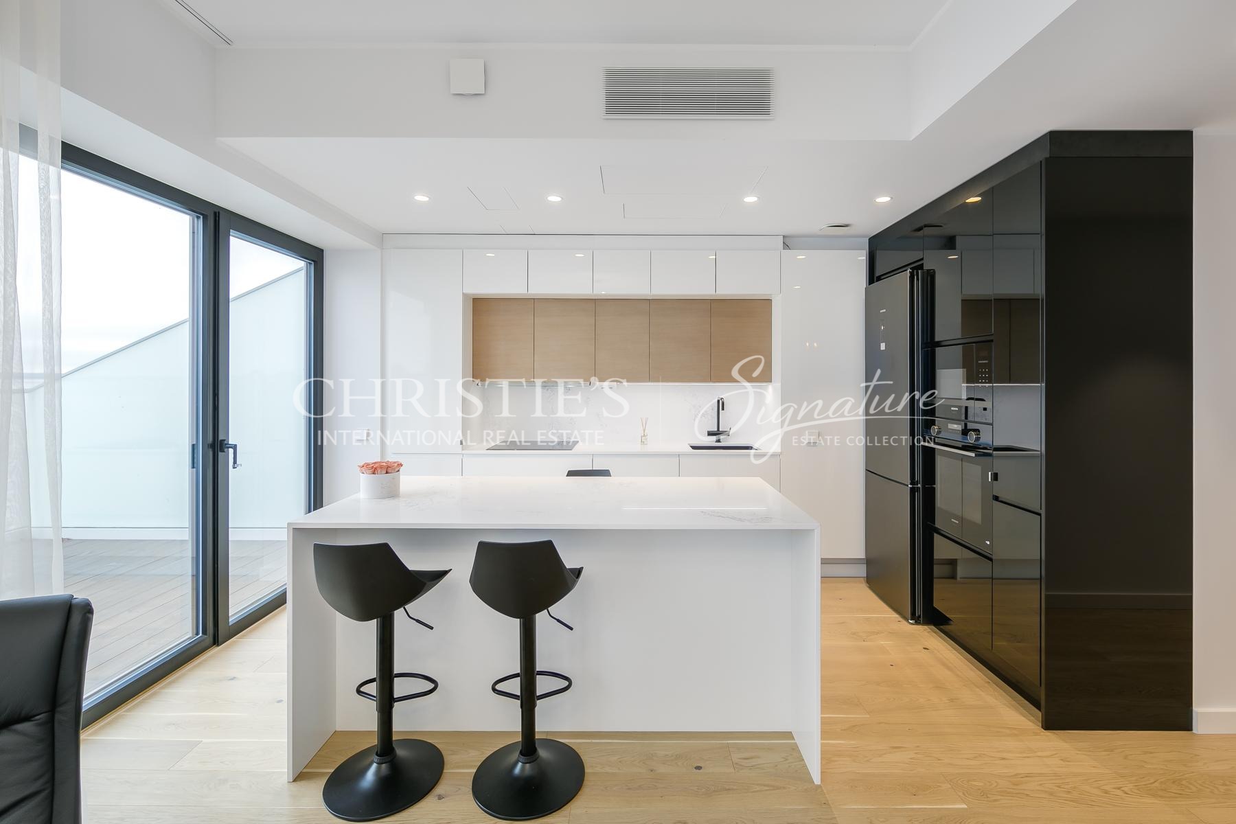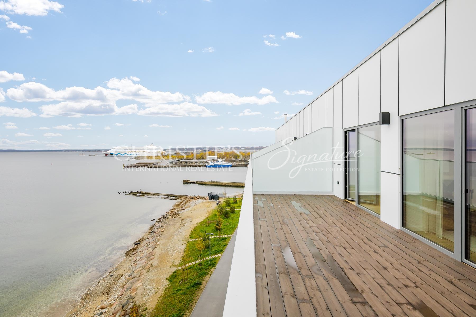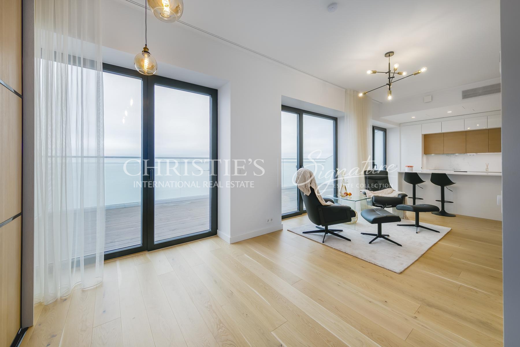 A living room with an open kitchen and high-quality Puustelli kitchen furniture and access to a roof terrace measuring 26.5 m²
