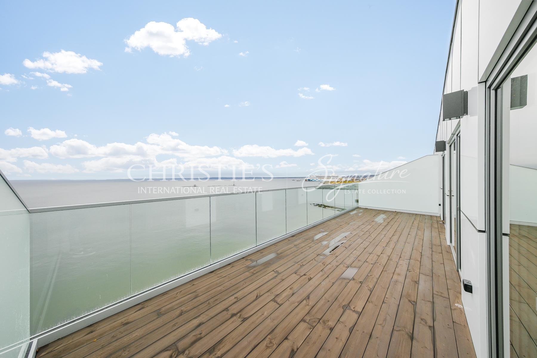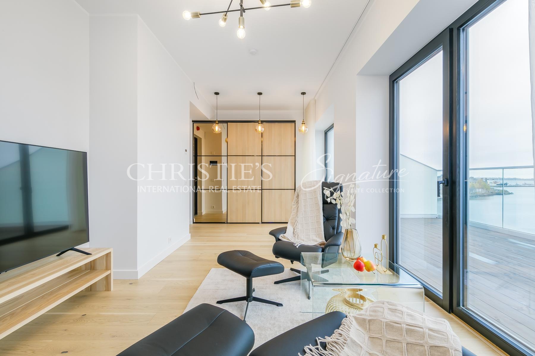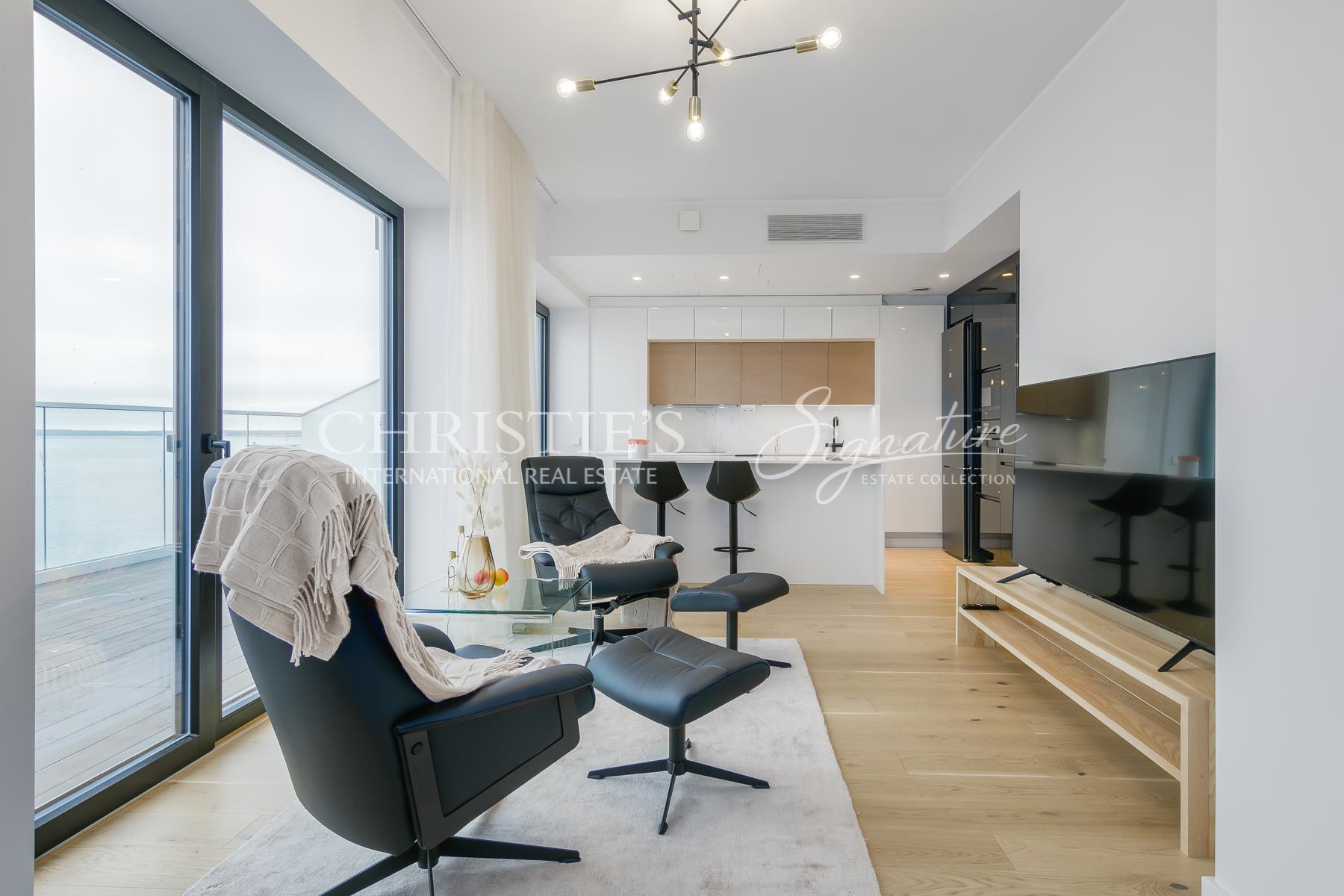 A living room with an open kitchen and high-quality Puustelli kitchen furniture and access to a roof terrace measuring 26.5 m²