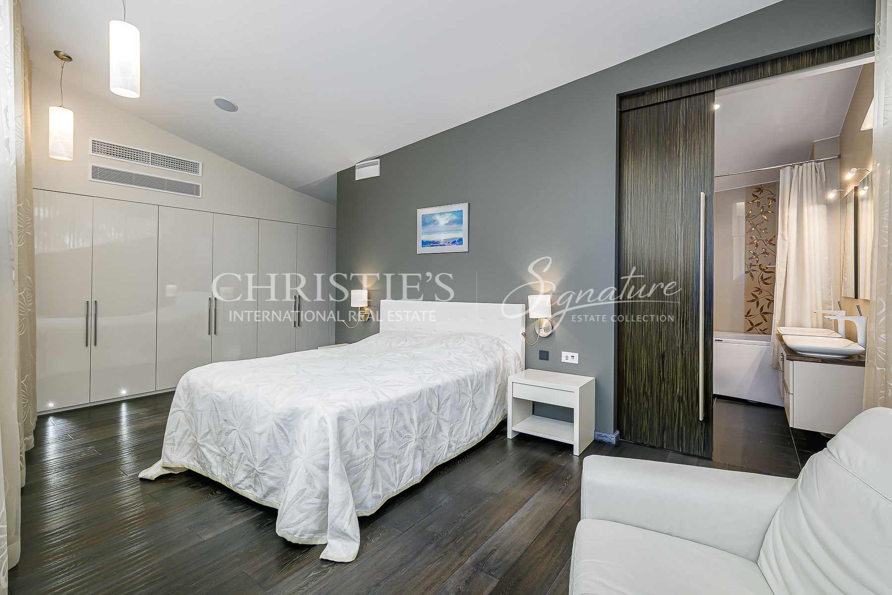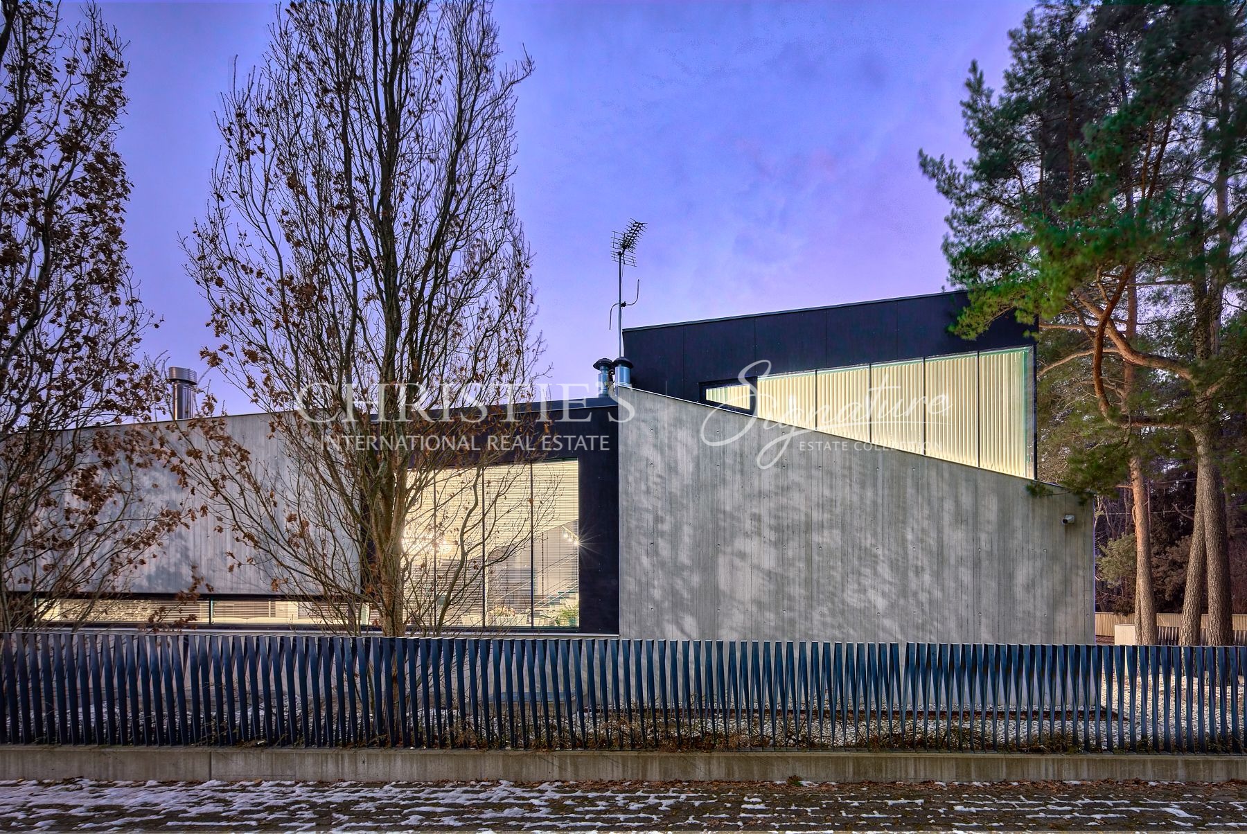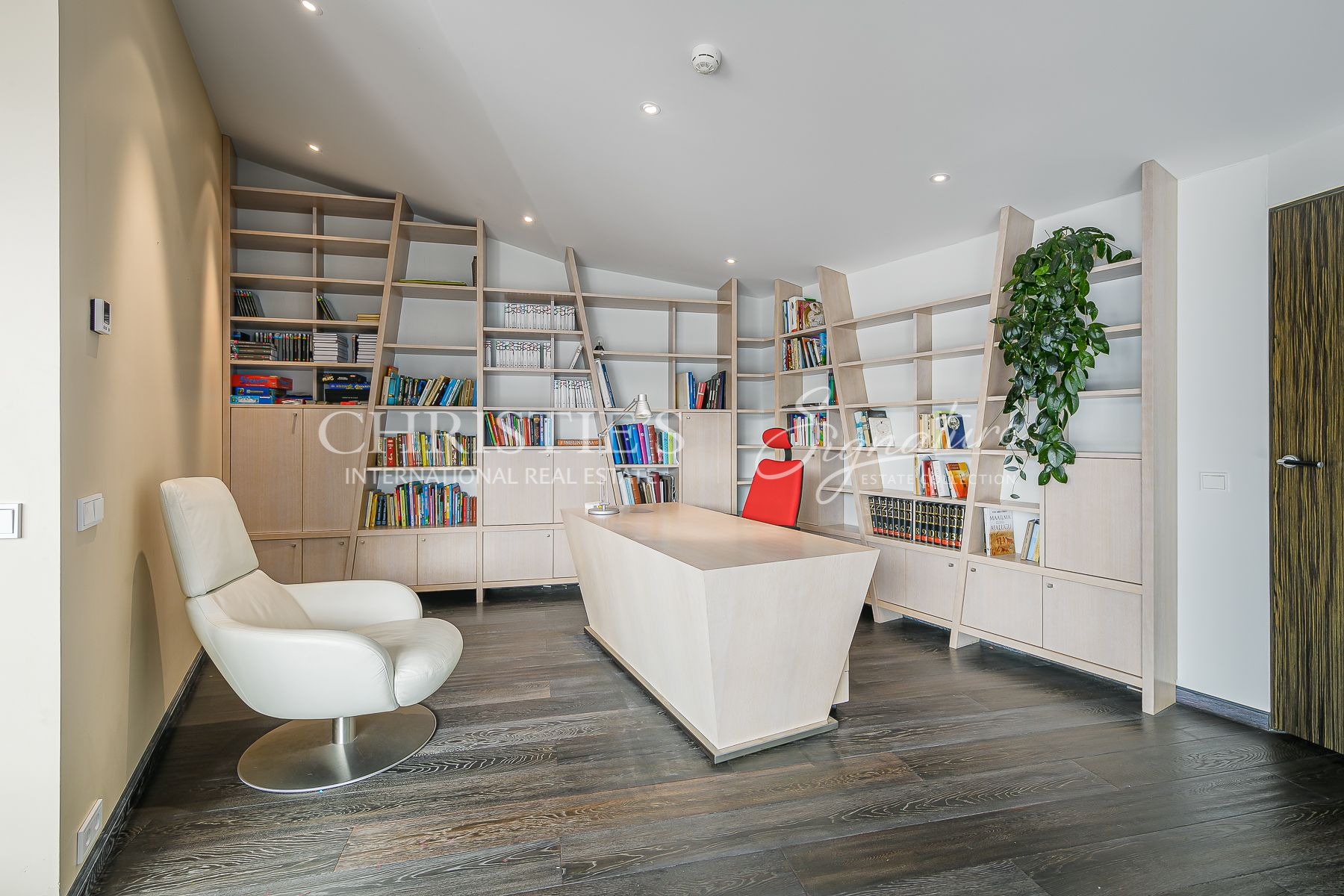 On the first floor there is an office, a guest bedroom, a living room-kitchen, a sauna. From the living room there is access to a terrace with expressive landscaping. On the second floor there is a library and 3 bedrooms, 2 bathrooms.
