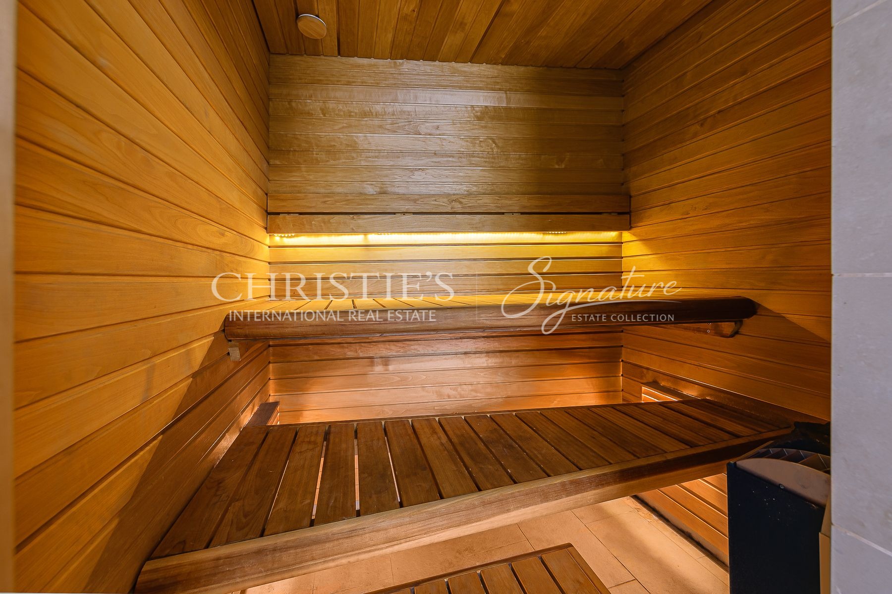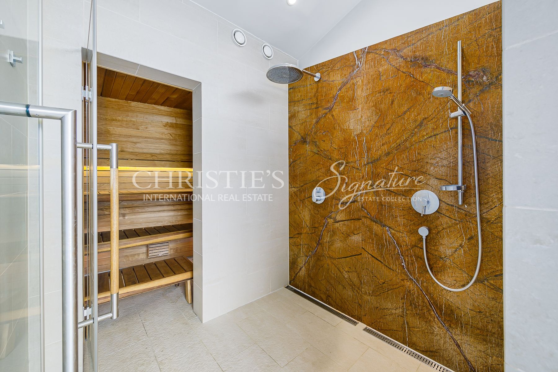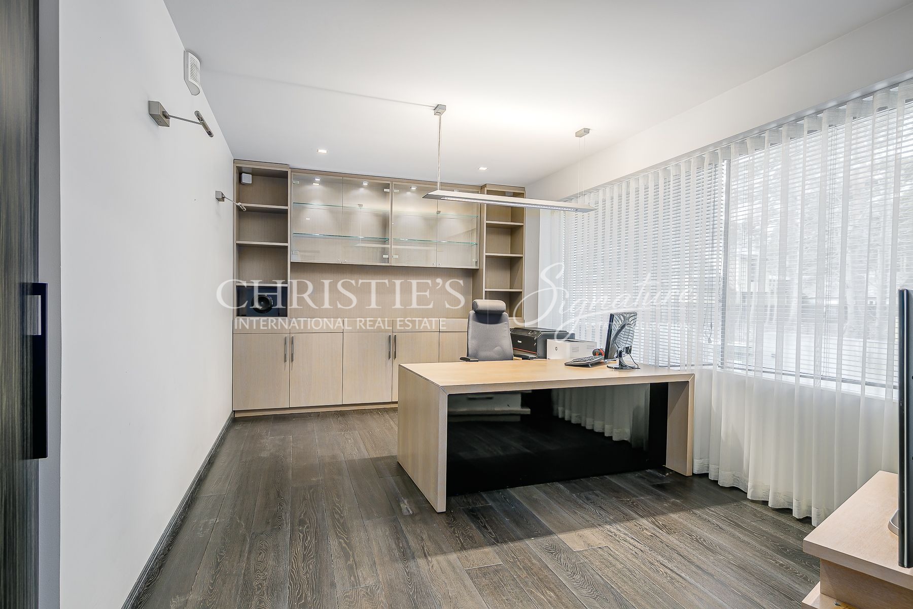 On the first floor there is an office, a guest bedroom, a living room-kitchen, a sauna. From the living room there is access to a terrace with expressive landscaping. On the second floor there is a library and 3 bedrooms, 2 bathrooms.