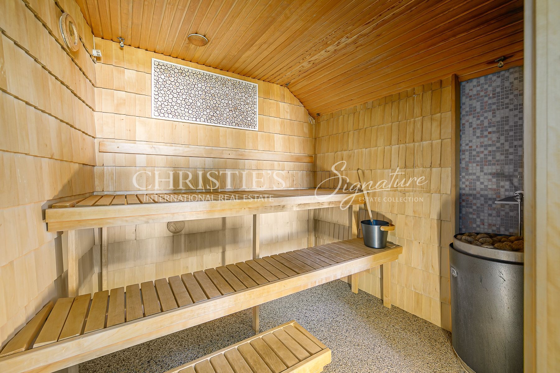 The first floor of the house includes a large 90 sqm living room with an open kitchen and dining area, a guest room, a small spa area with a Finnish sauna, a steam sauna, a jacuzzi, and a separate lounge room. The first floor also features a heated enclosed terrace and a large open terrace with sea views.