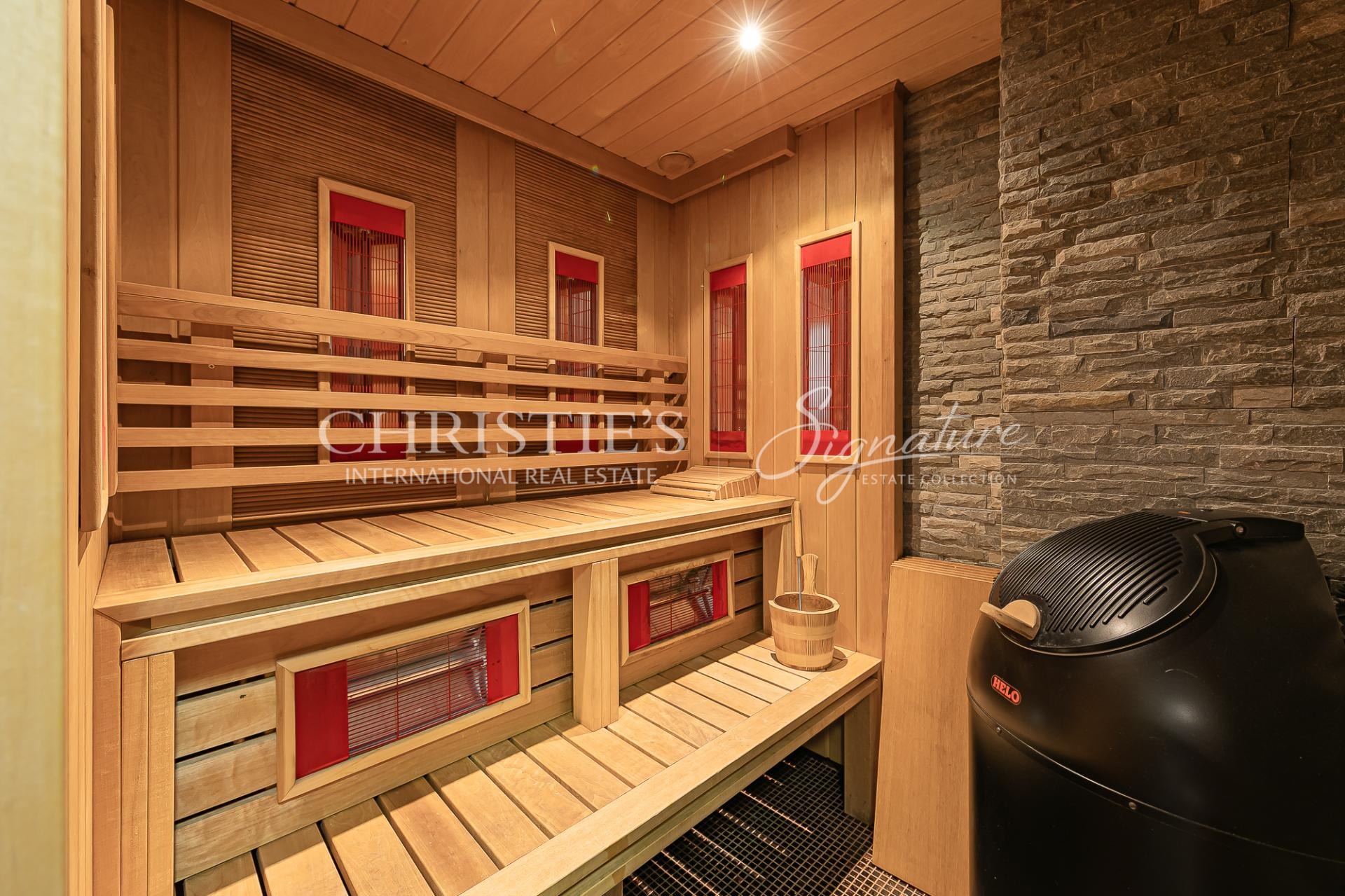 The first floor features a spacious kitchen and living area, complemented by a bright, double-height atrium dining space. On the same level, there is a private sauna complex with a shower room and a guest toilet—an ideal place to unwind after a long day.