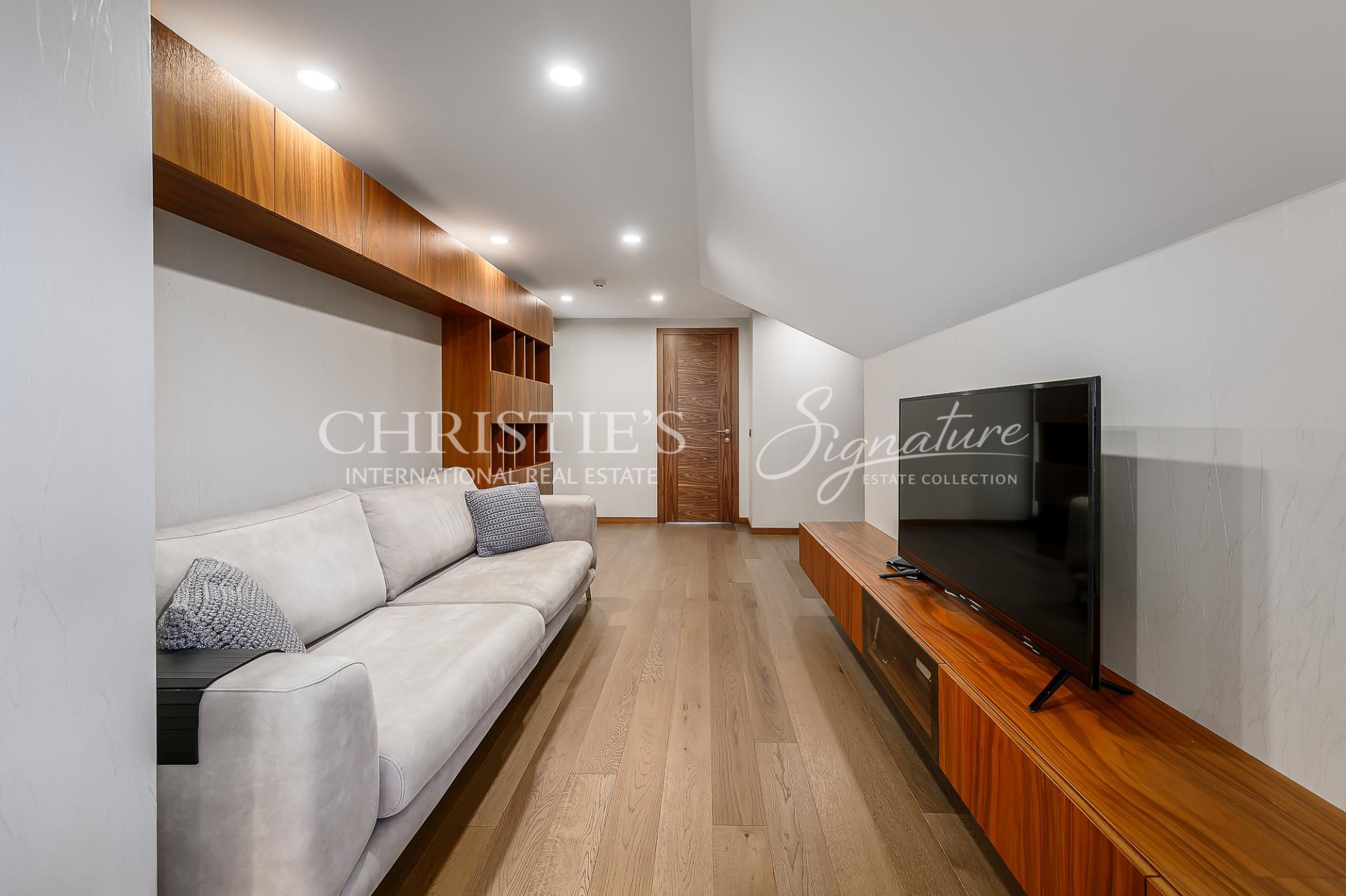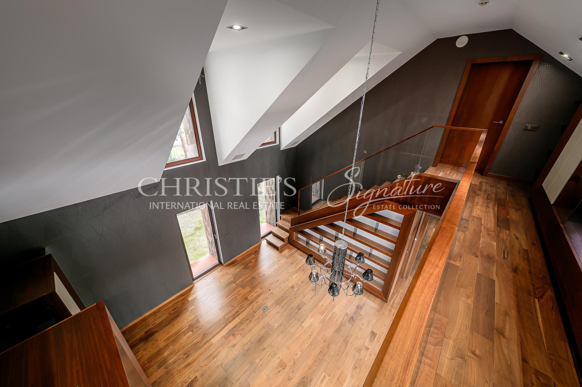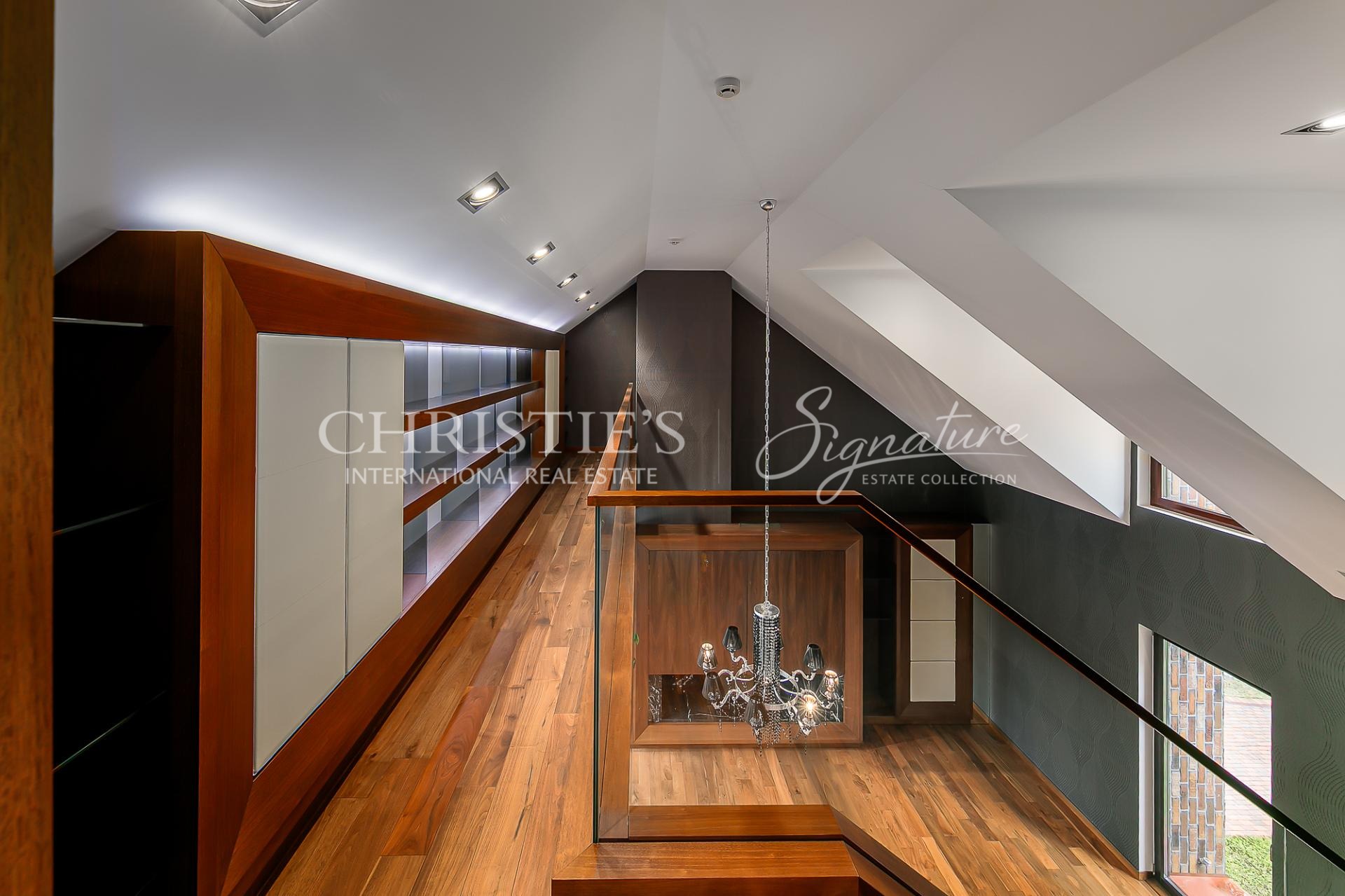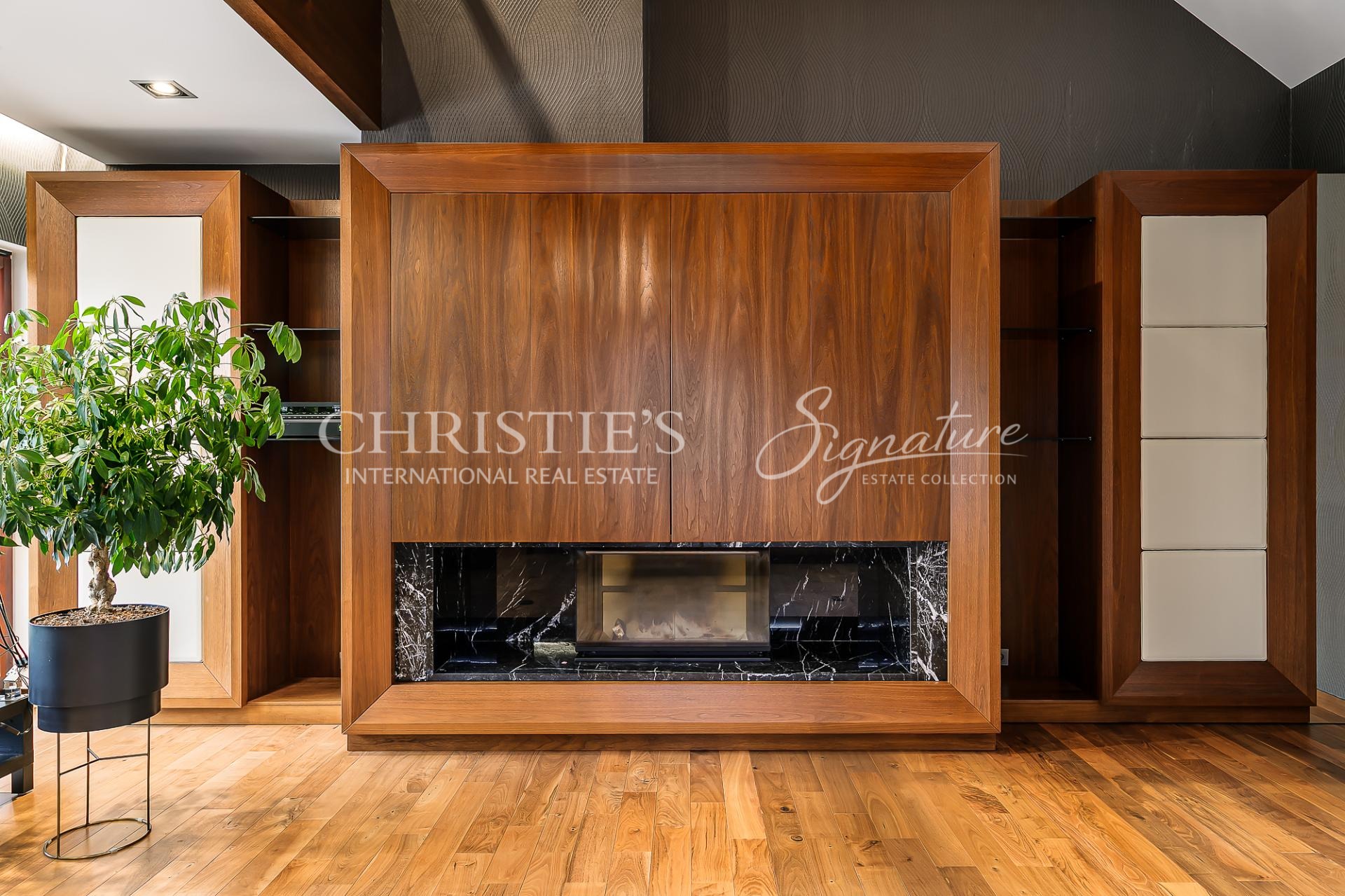 There is also a cozy living room with a large fireplace, which can be used as a home cinema—fully prepared for a large screen and sound system. The living room opens onto a balcony that also serves as a library space.