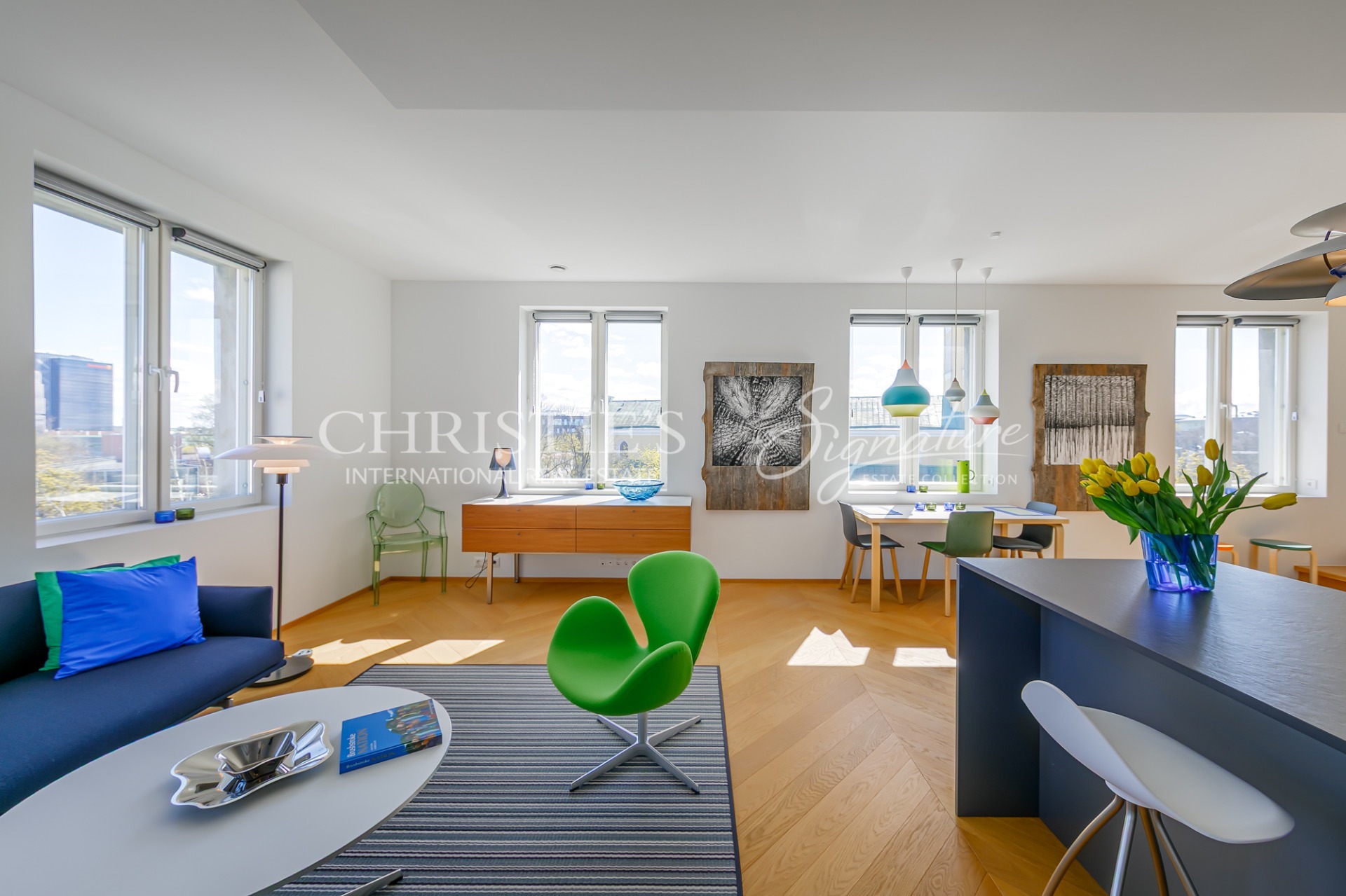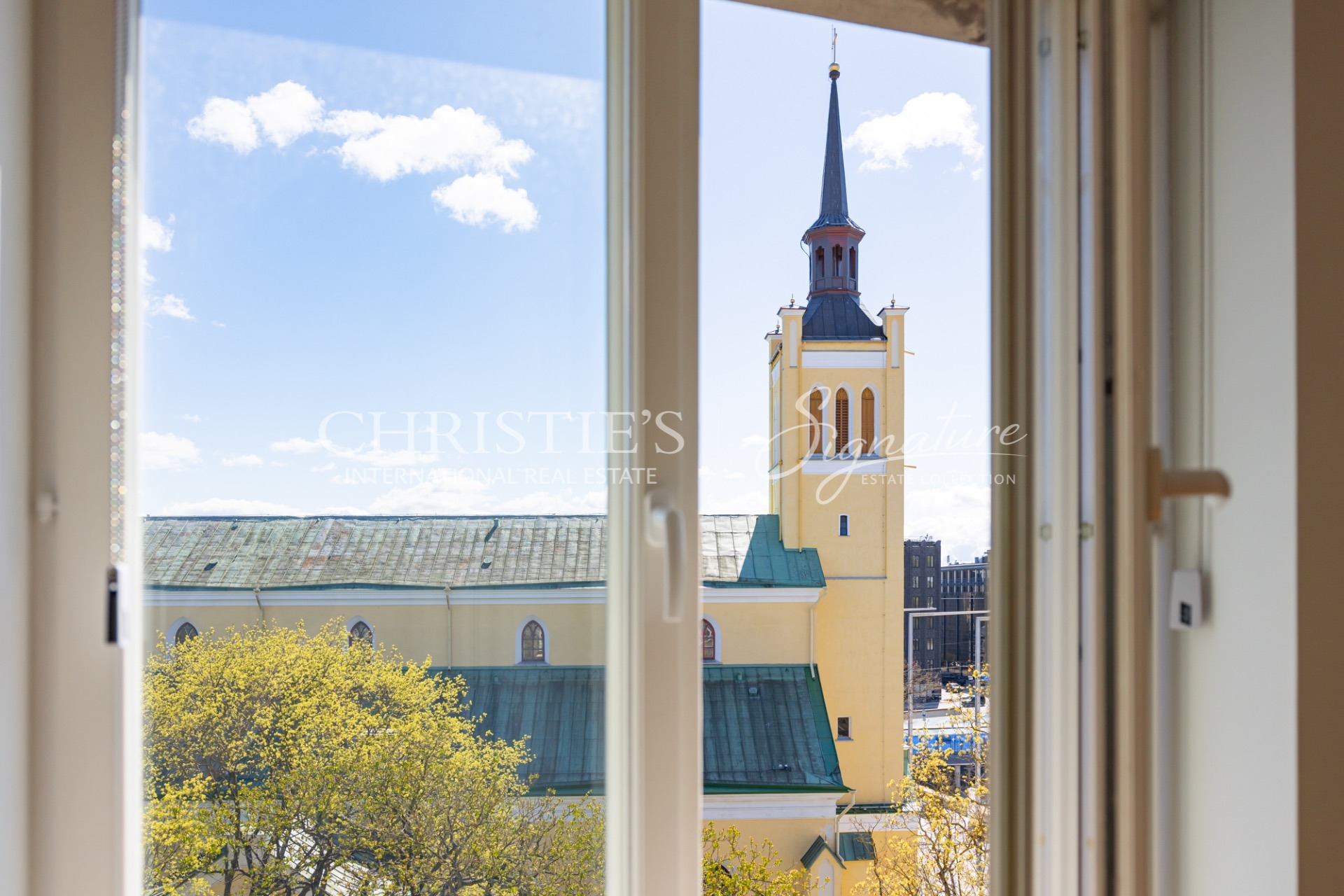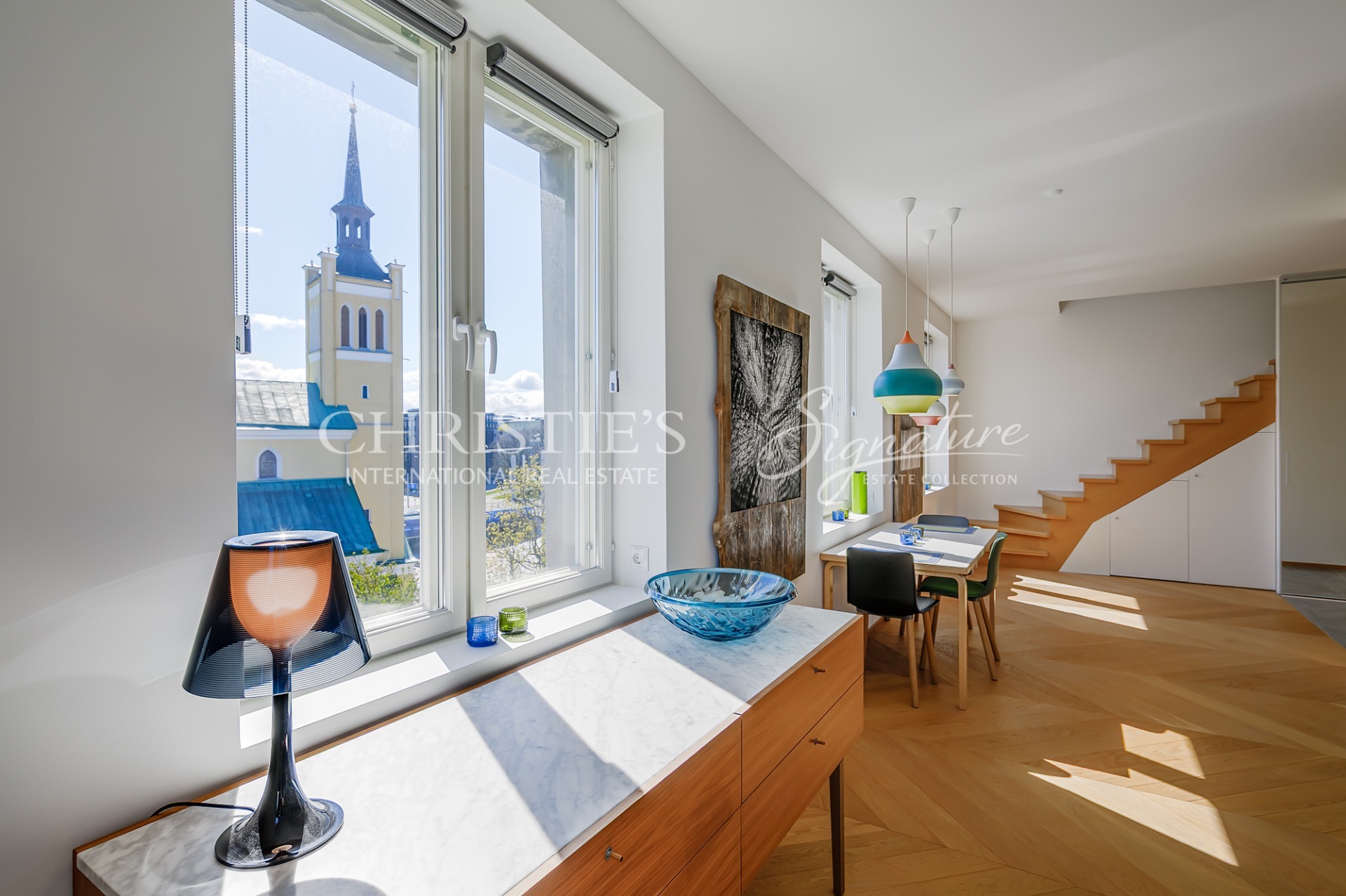This exclusive 80,5 m² penthouse apartment with 83,6 m² total floor area is spread out over two floors and is for sale in a prime location in an iconic building at the edge of Tallinn’s Old Town – where unique dining, a rich cultural and educational environment and the medieval Old Town as a UNESCO World Heritage Site meet. The apartment offers unrivalled and unique views of Freedom Square and benefits from a direct south and east exposure meaning that it is full of light.