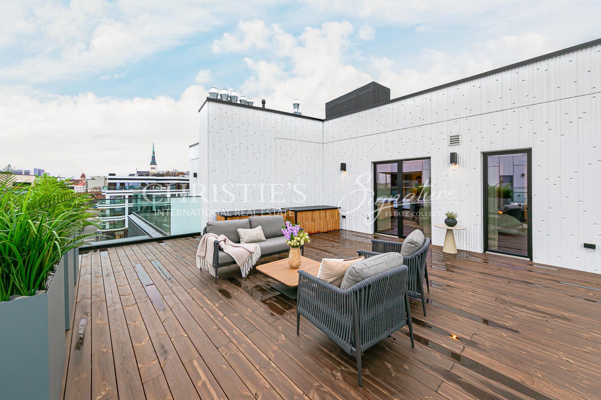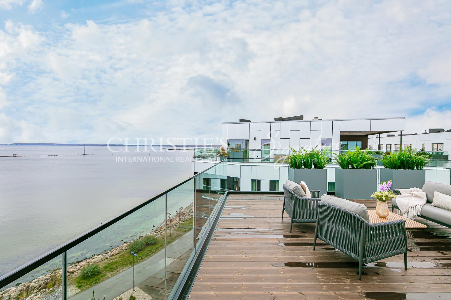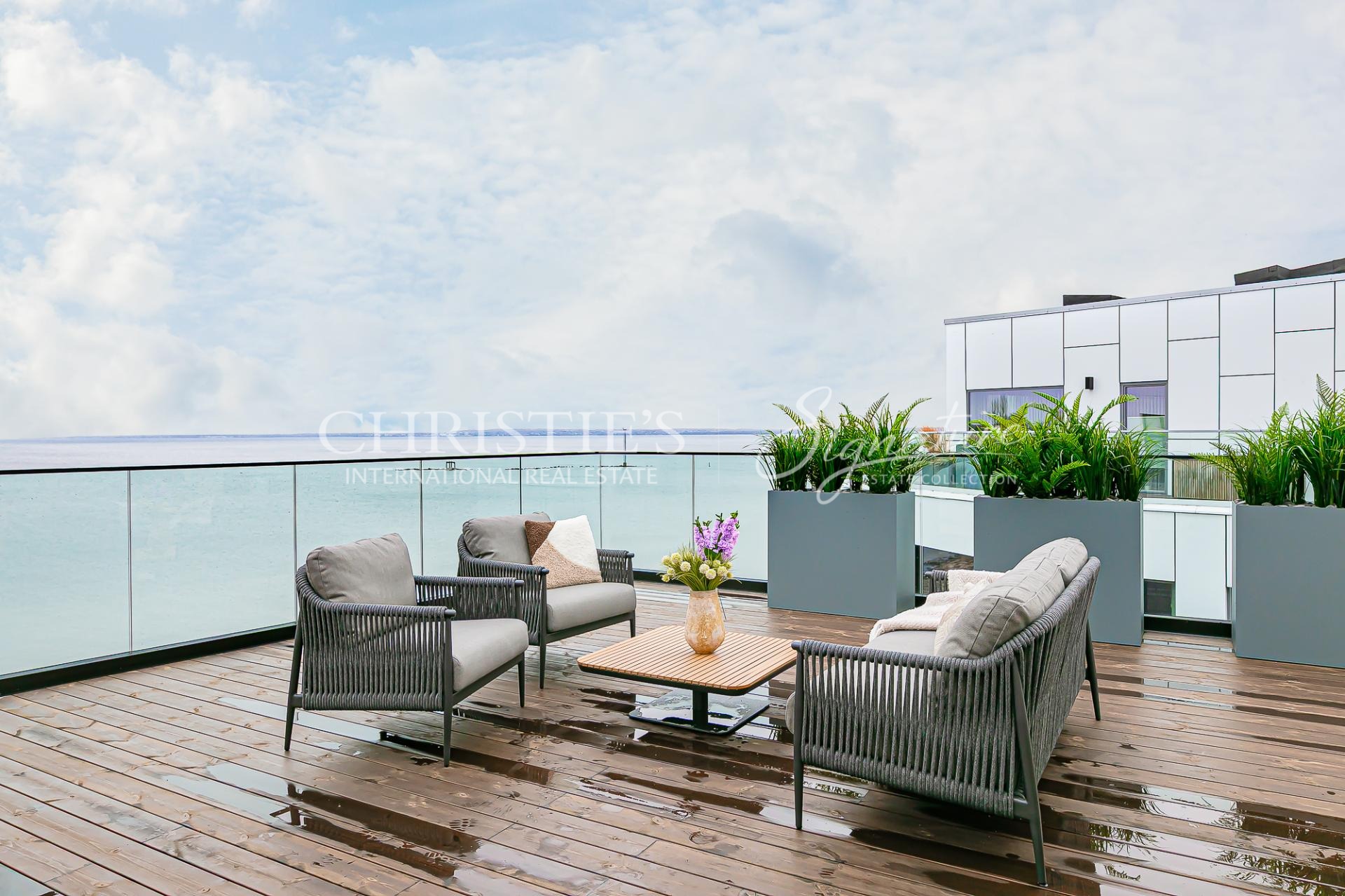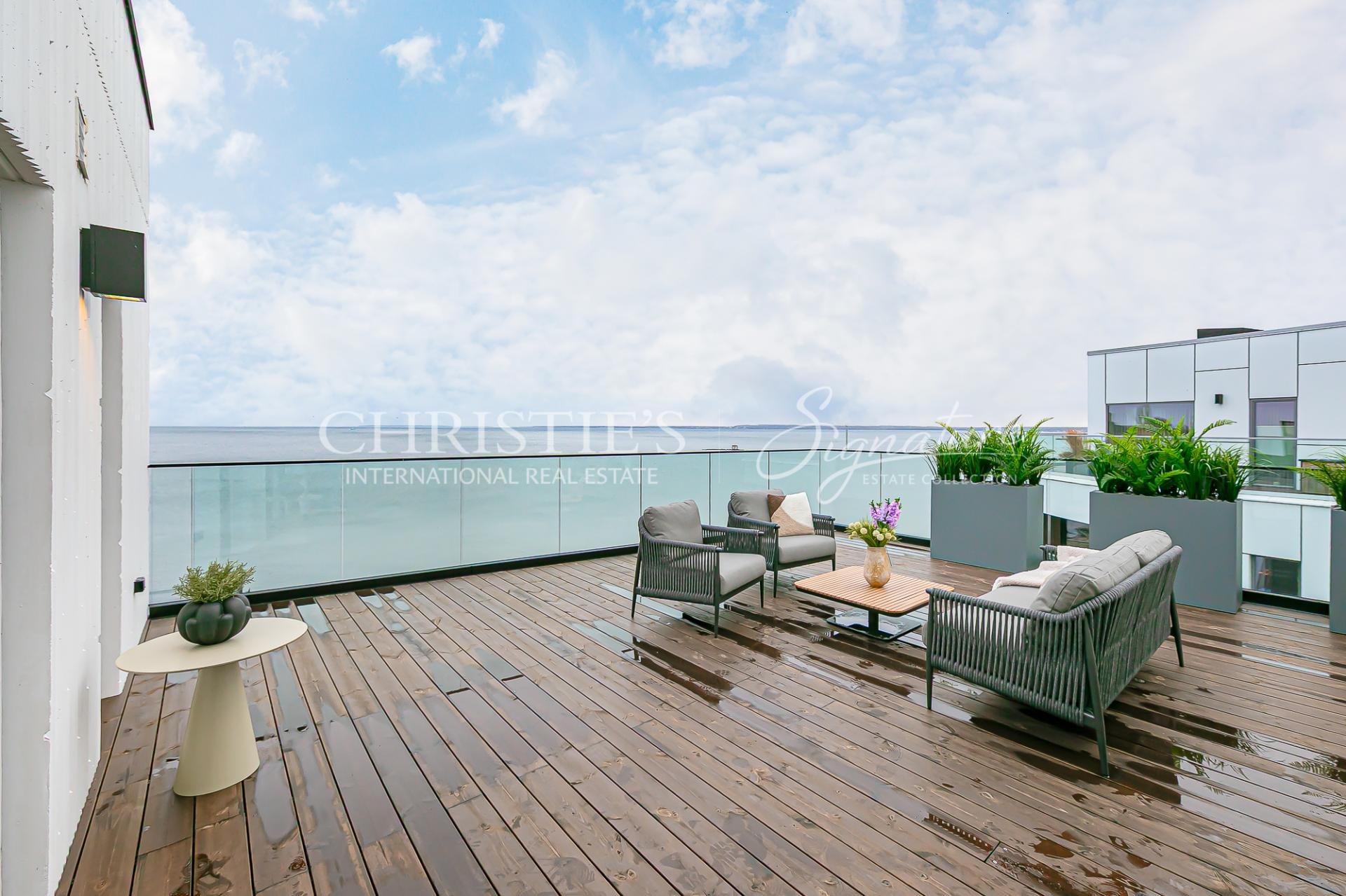 * A mega-large 56 m² roof terrace with a sea view with flower boxes and terrace furniture, as well as storage boxes for furniture cushions