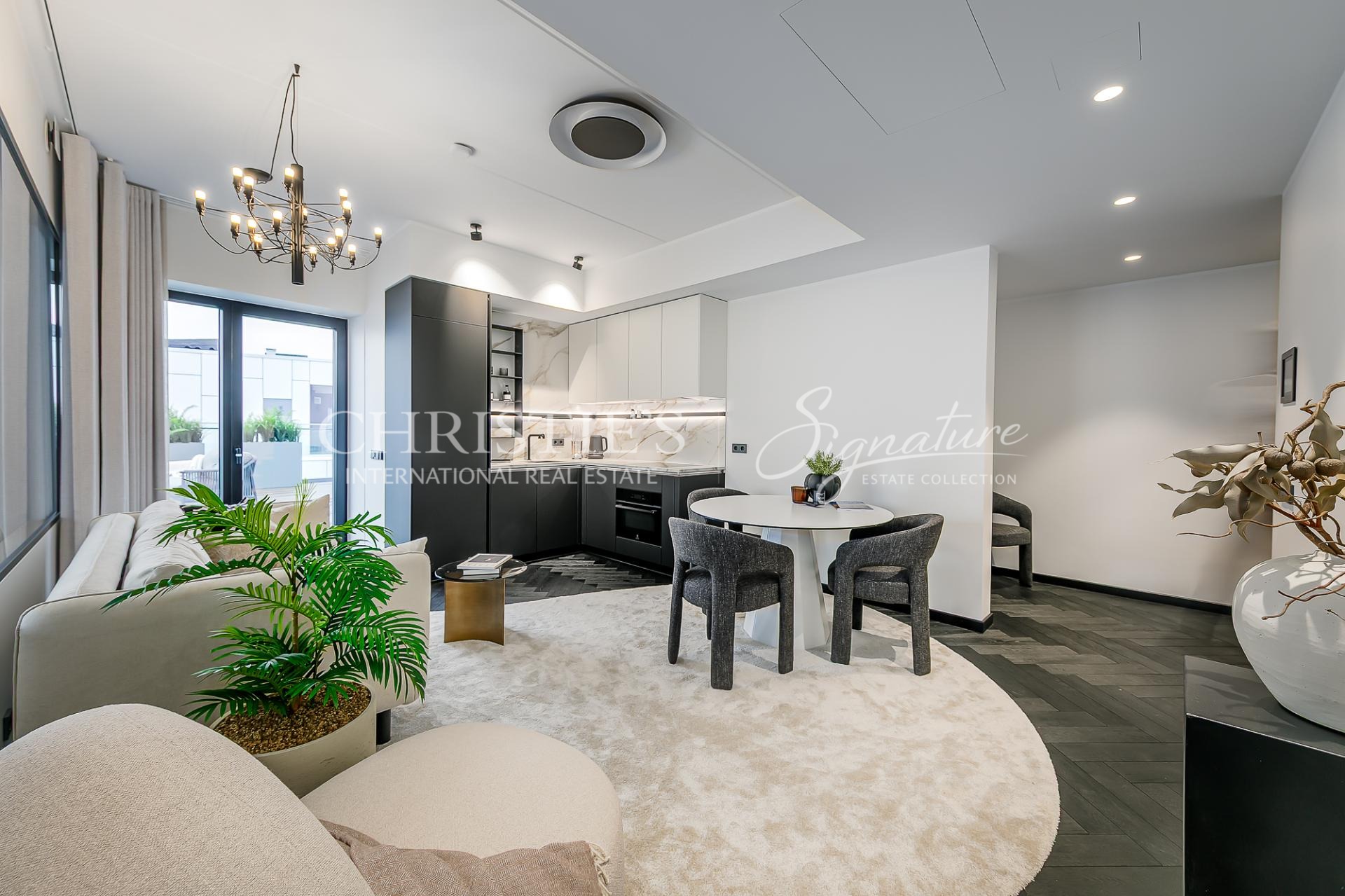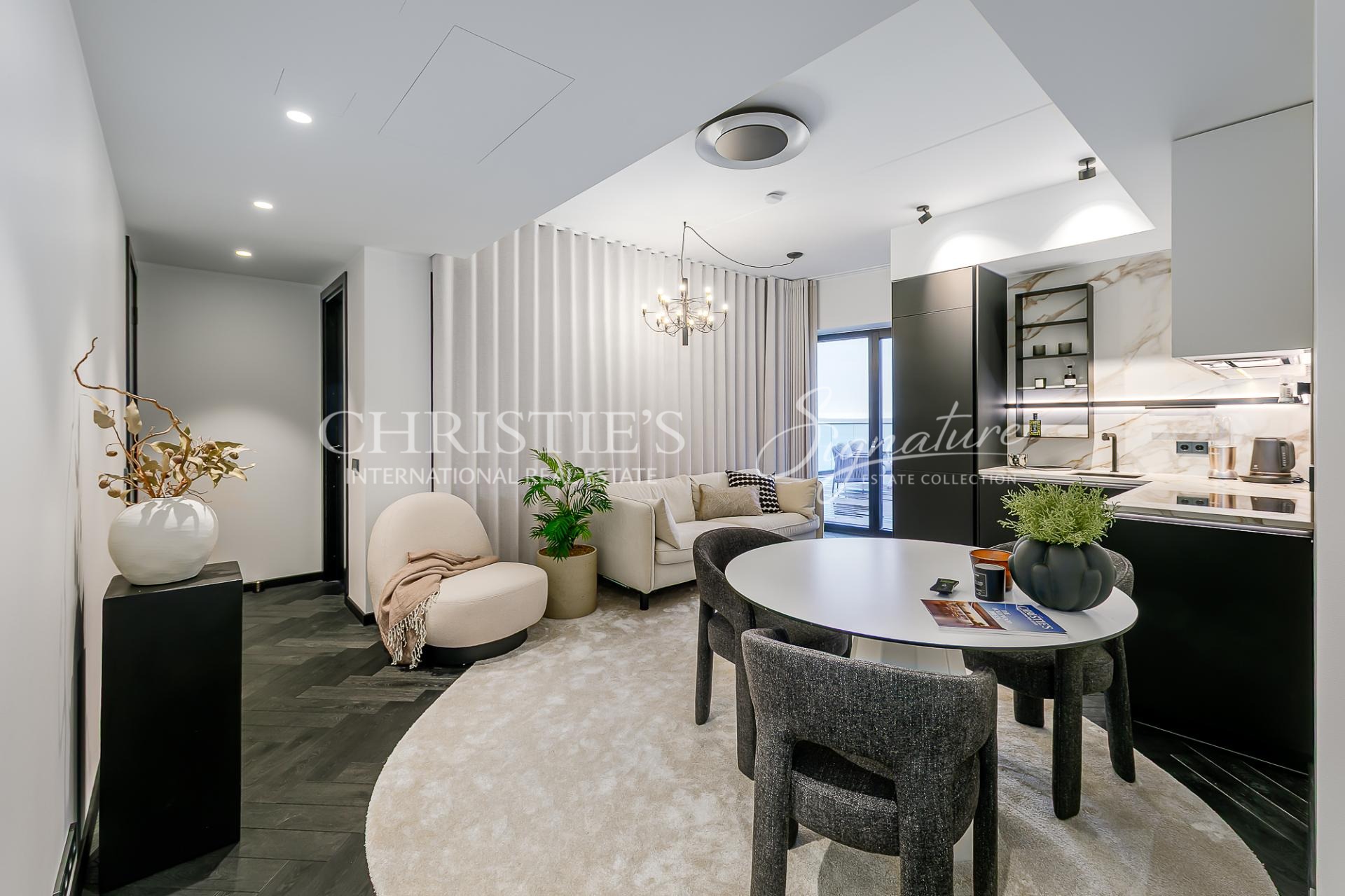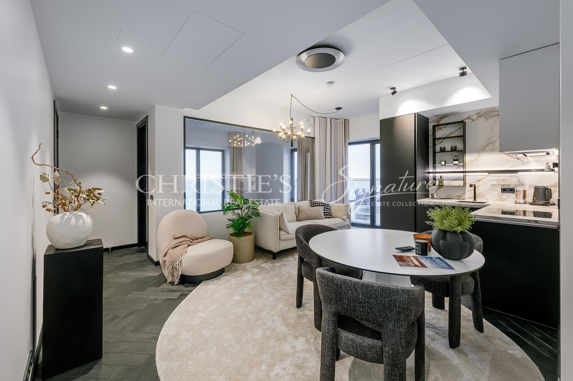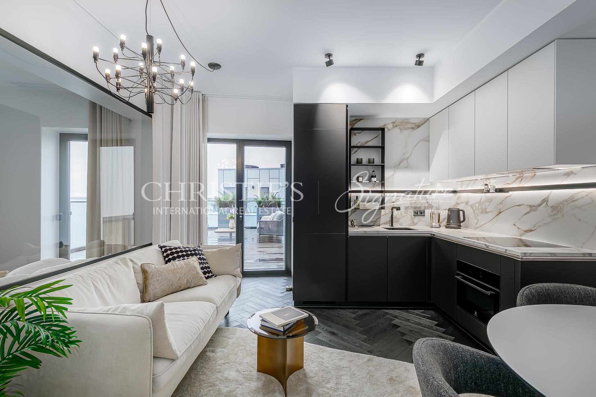 * An open-plan living room with a kitchen and access to a 56 m² terrace. A large glass wall has been specially built between the living room and the bedroom so that the sea view and sunsets can also be enjoyed from the living room. Remote-controlled curtains run in front of the glass wall to ensure privacy in the bedroom if necessary. The kitchen is equipped with the necessary appliances and there are also the necessary dishes.