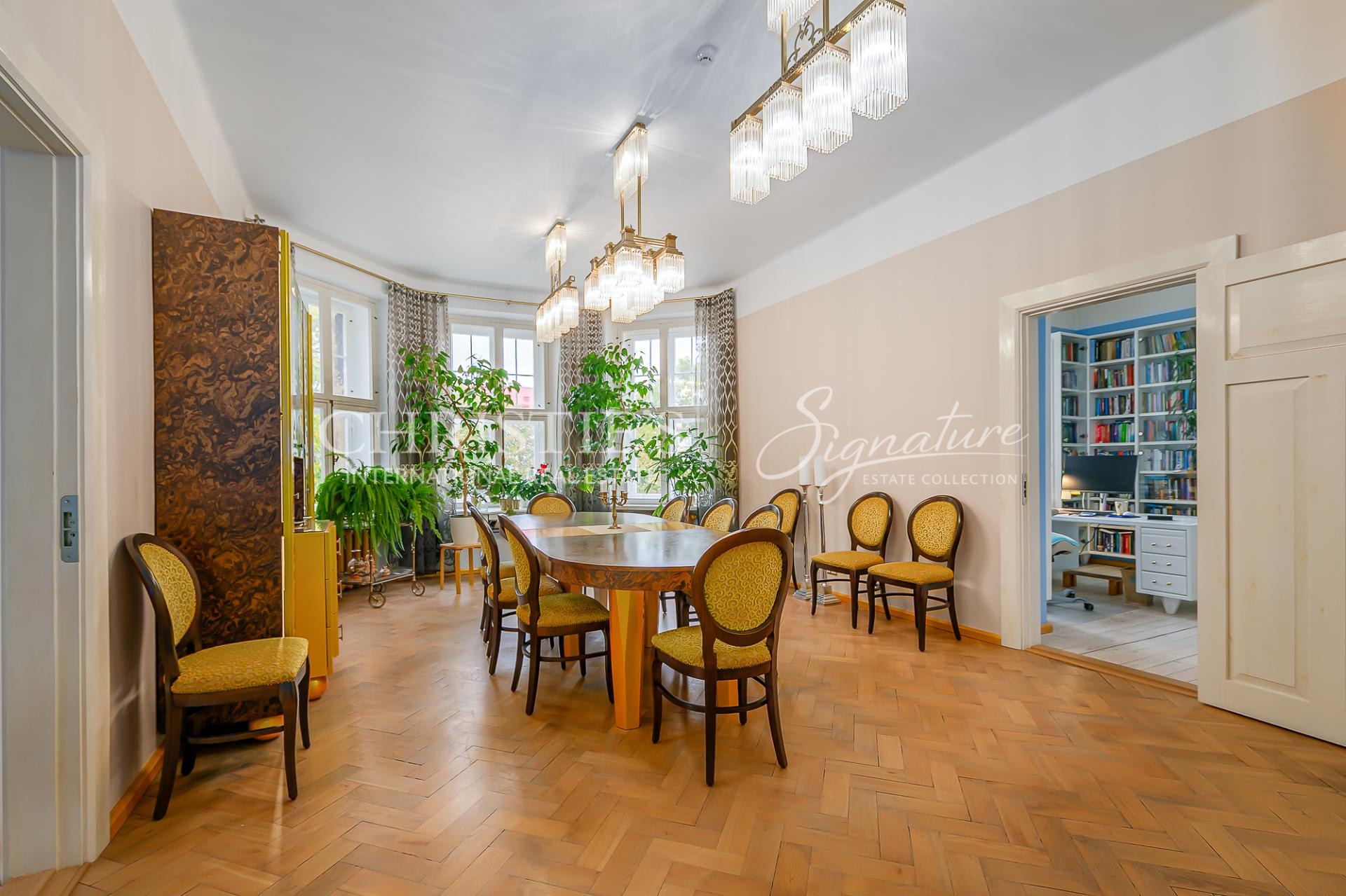 Korteris on kõrged laed, ajastune stiilne sisustus.