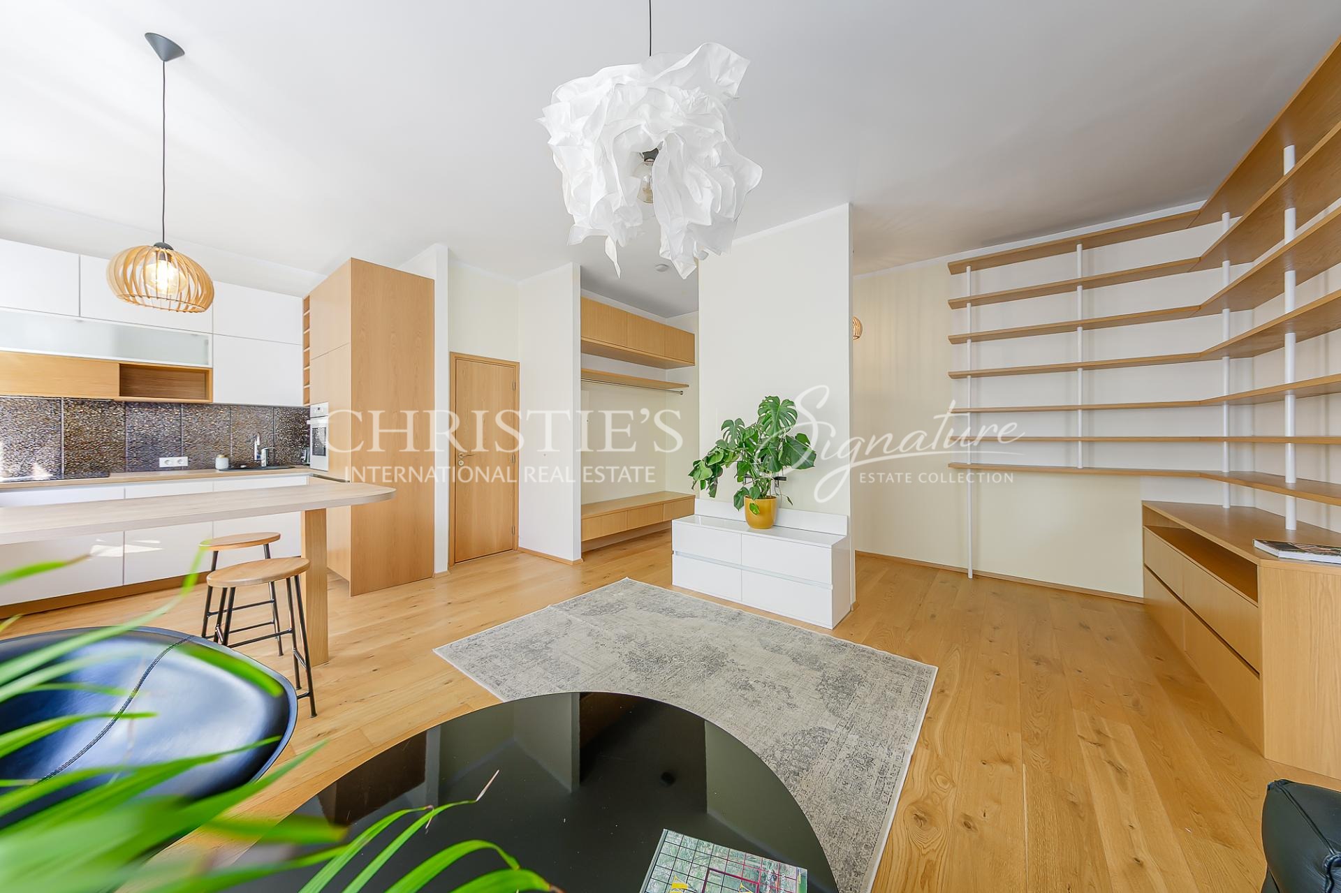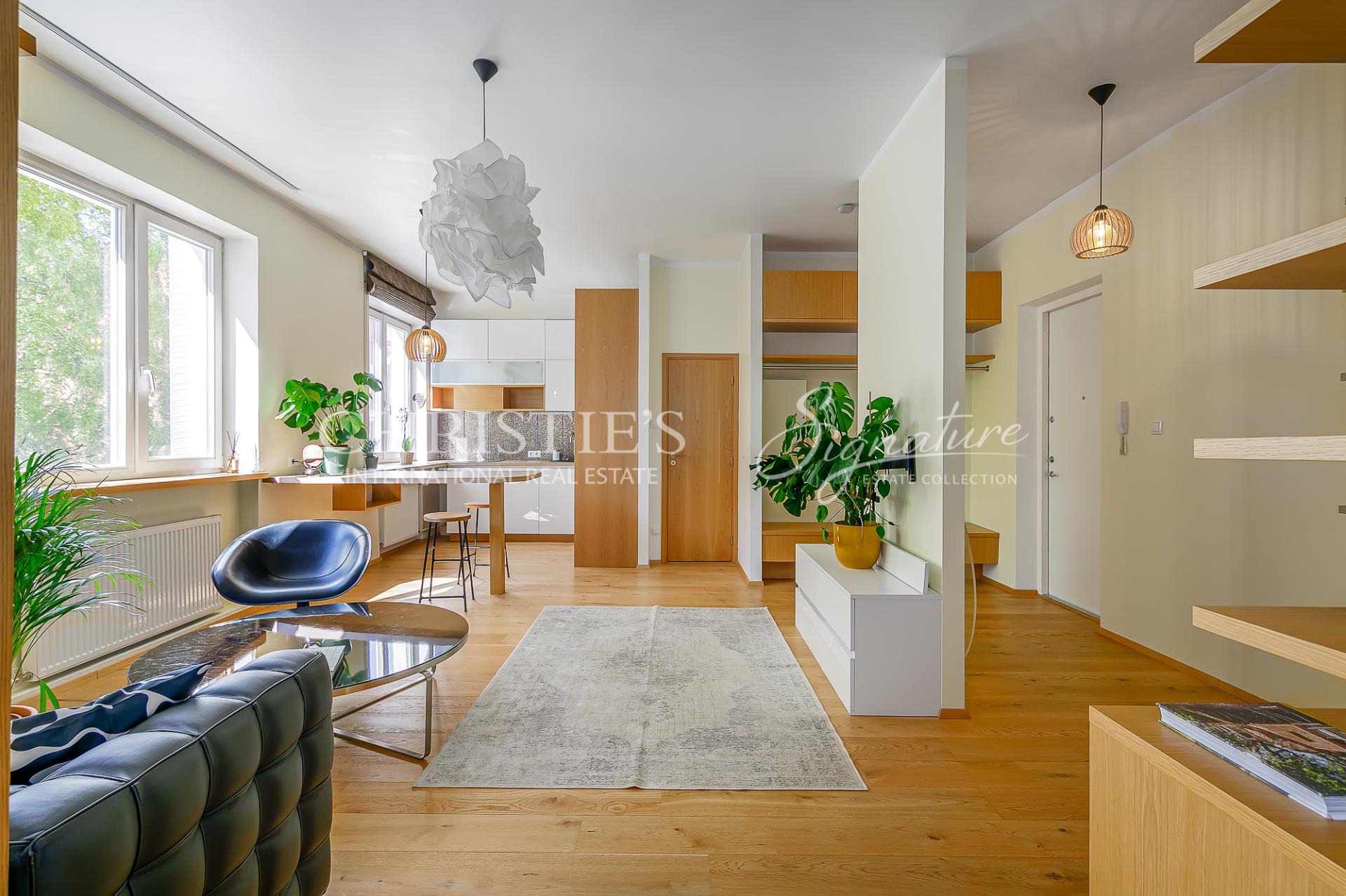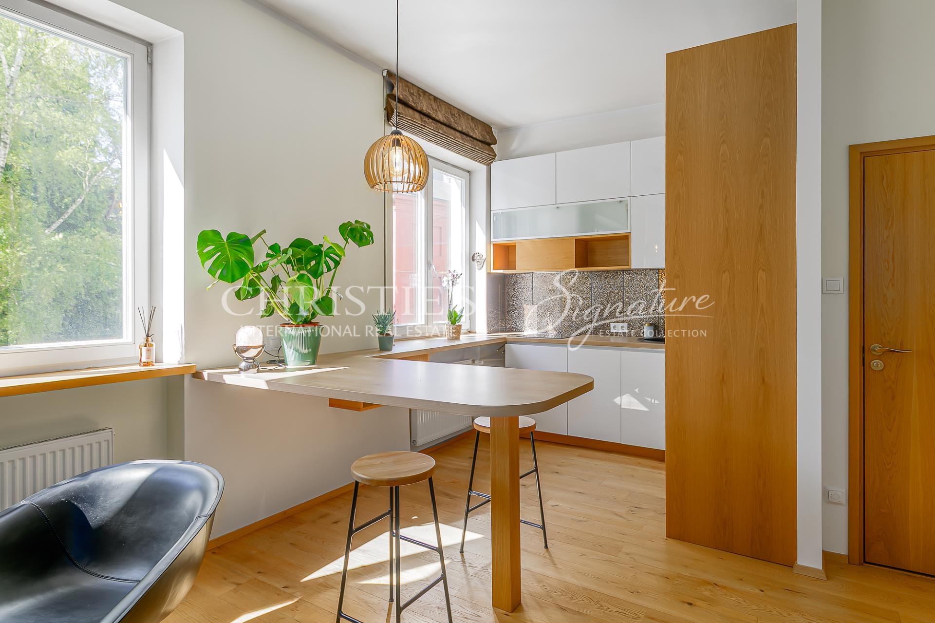 Korteris on ruumikas esik, avatud köök-elutuba, magamistuba ning dušhiruum-wc. Magamistoas on suur sisseehitatud garderoobkapp ja pimendavad kardinad. Korteri suured aknad avanevad maja sisehoovi, mille tõttu on korteris vaikne. Elutuba ja magamistuba eraldavad kahepoolsed lükanduksed.