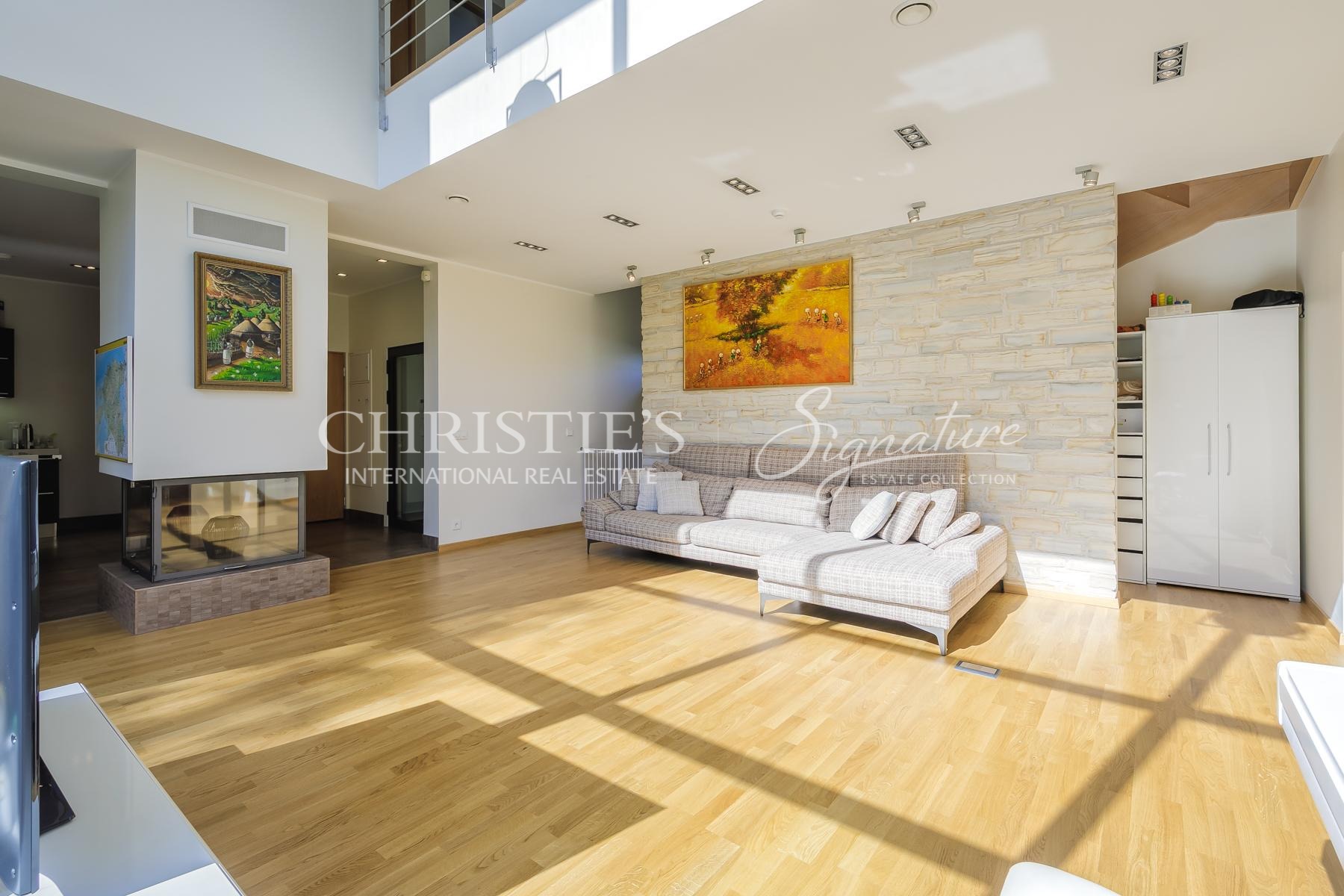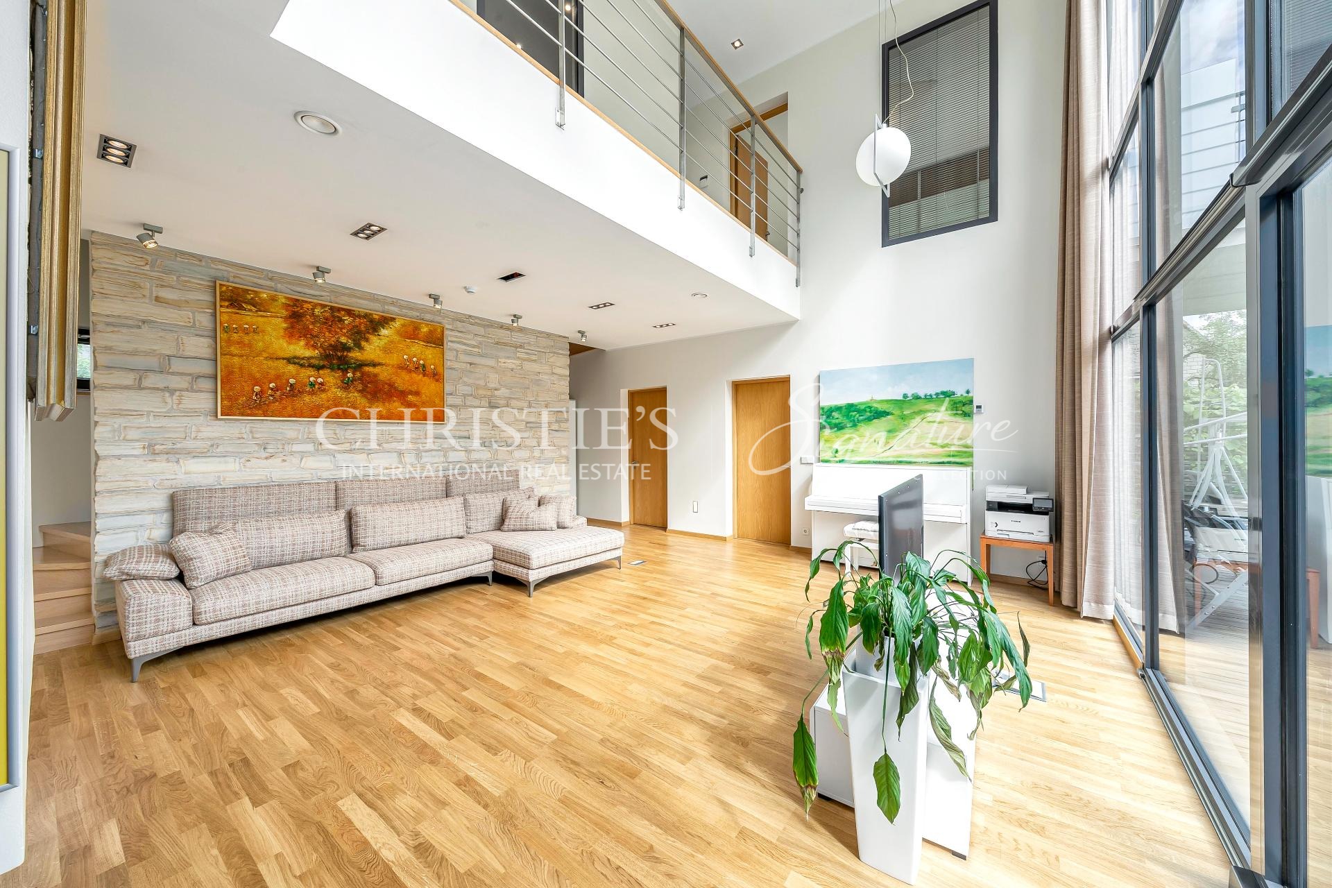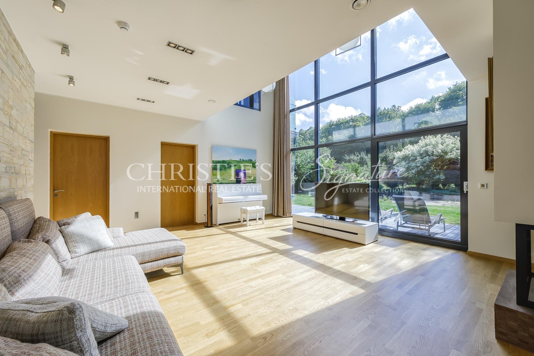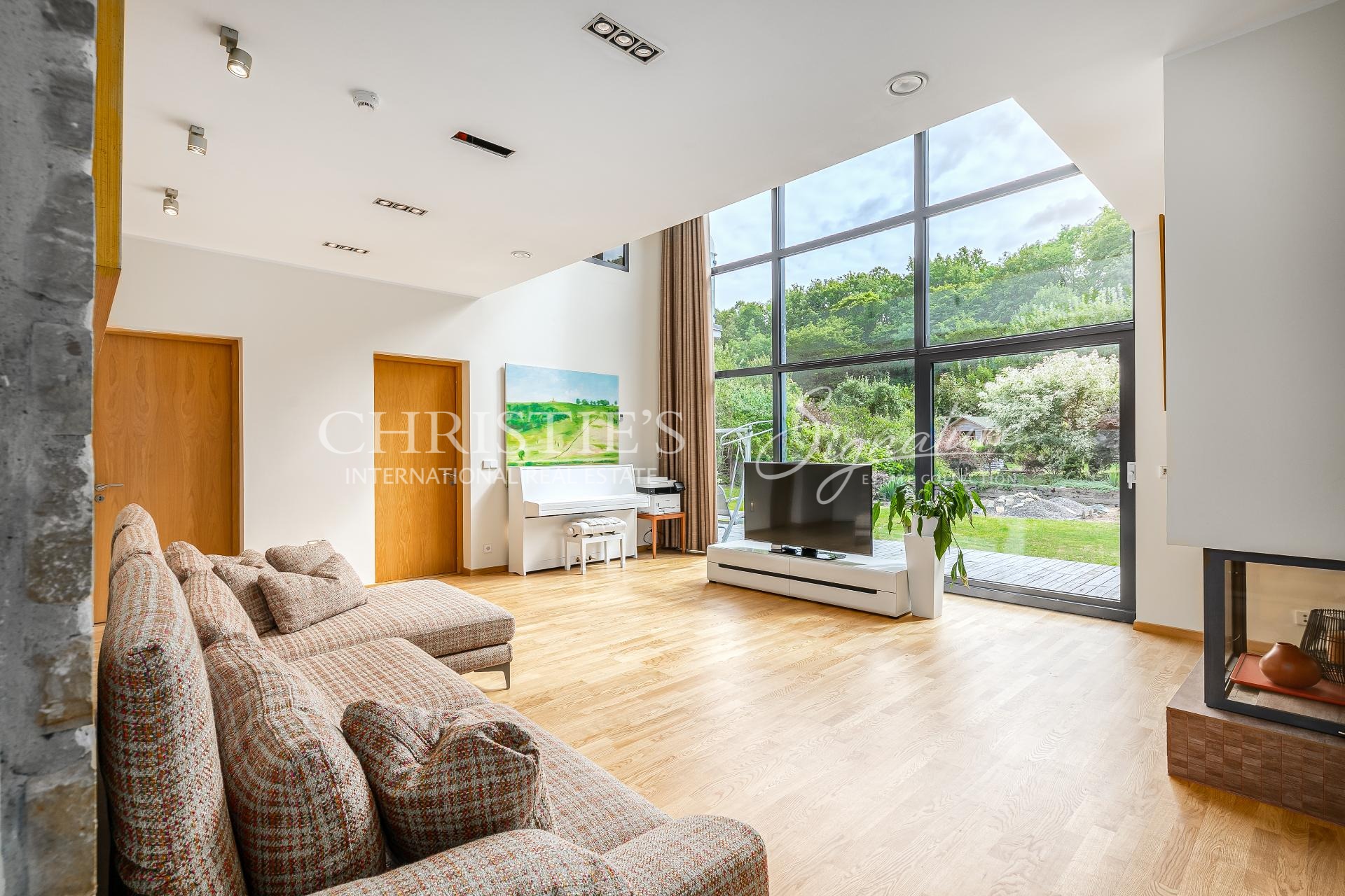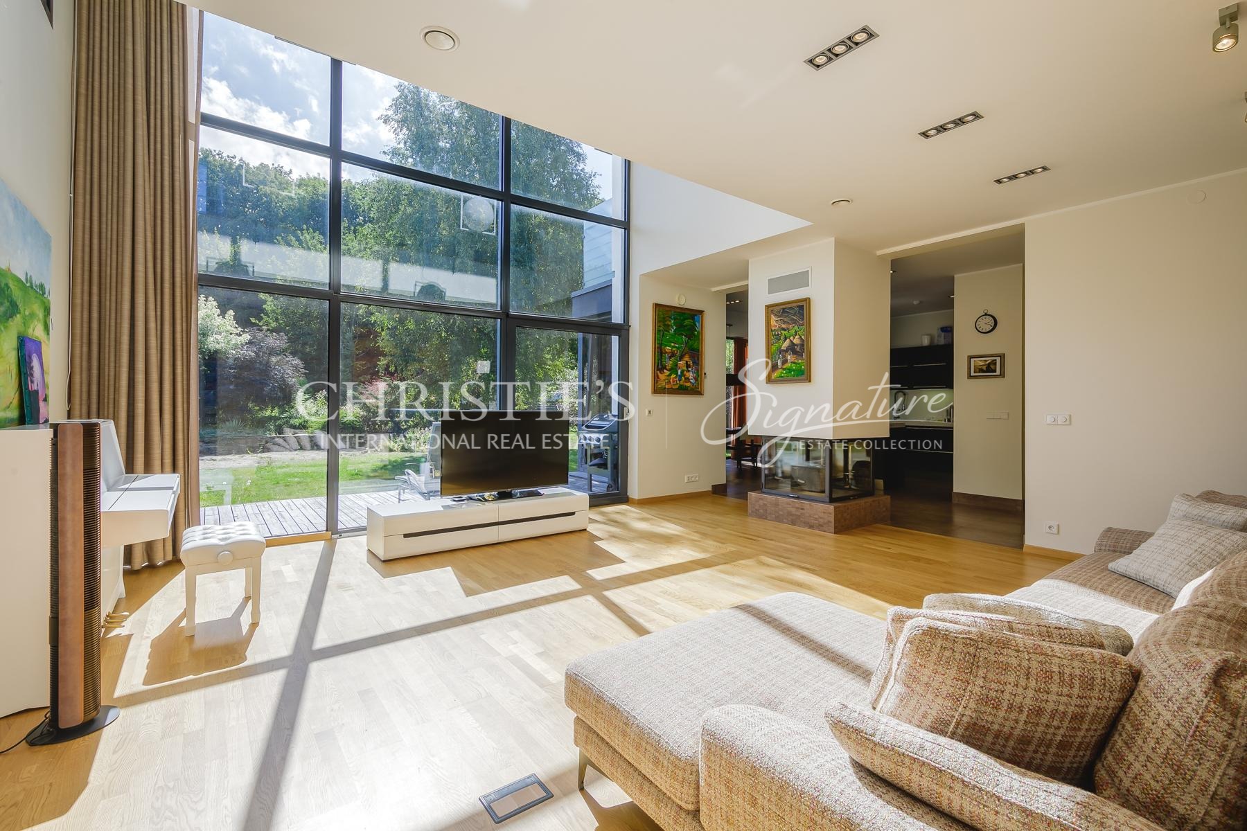 Majas on valgusküllane ja suur elutuba kõrgete lagede ja maas laeni akendega.